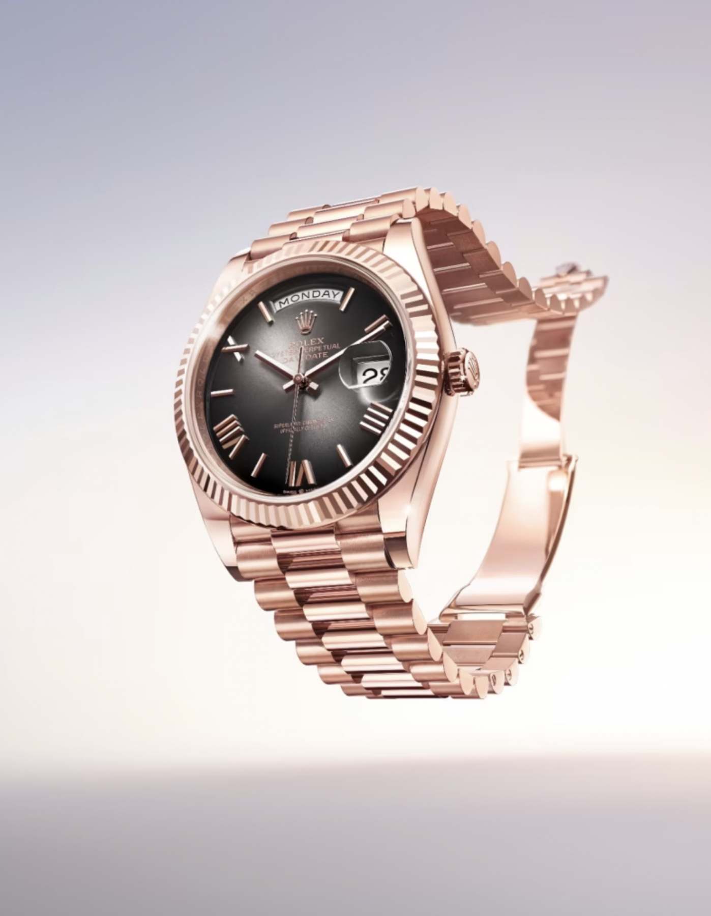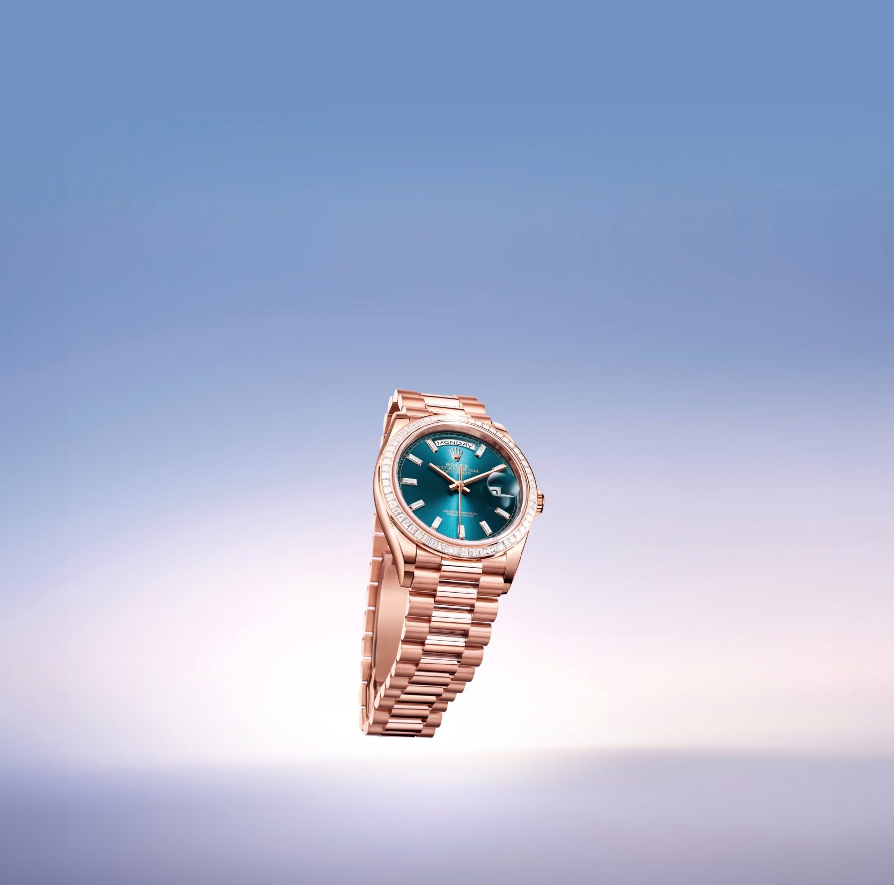 其中最引人注目的當屬首次選用藍綠色錶盤的18K玫瑰金Day-Date 36,其外圈鑲嵌着60顆梯形鑽石,在簡約設計中增添華麗光彩;而Day-Date 40 18K玫瑰金款則採用漸變灰錶面,其羅馬數字時標與錶盤中心到邊緣的暗色區域之間呈現出細膩過渡。所搭載的3255自動上鏈機芯,動力儲備約為70小時,行走時恍如一場動人色調交響樂。