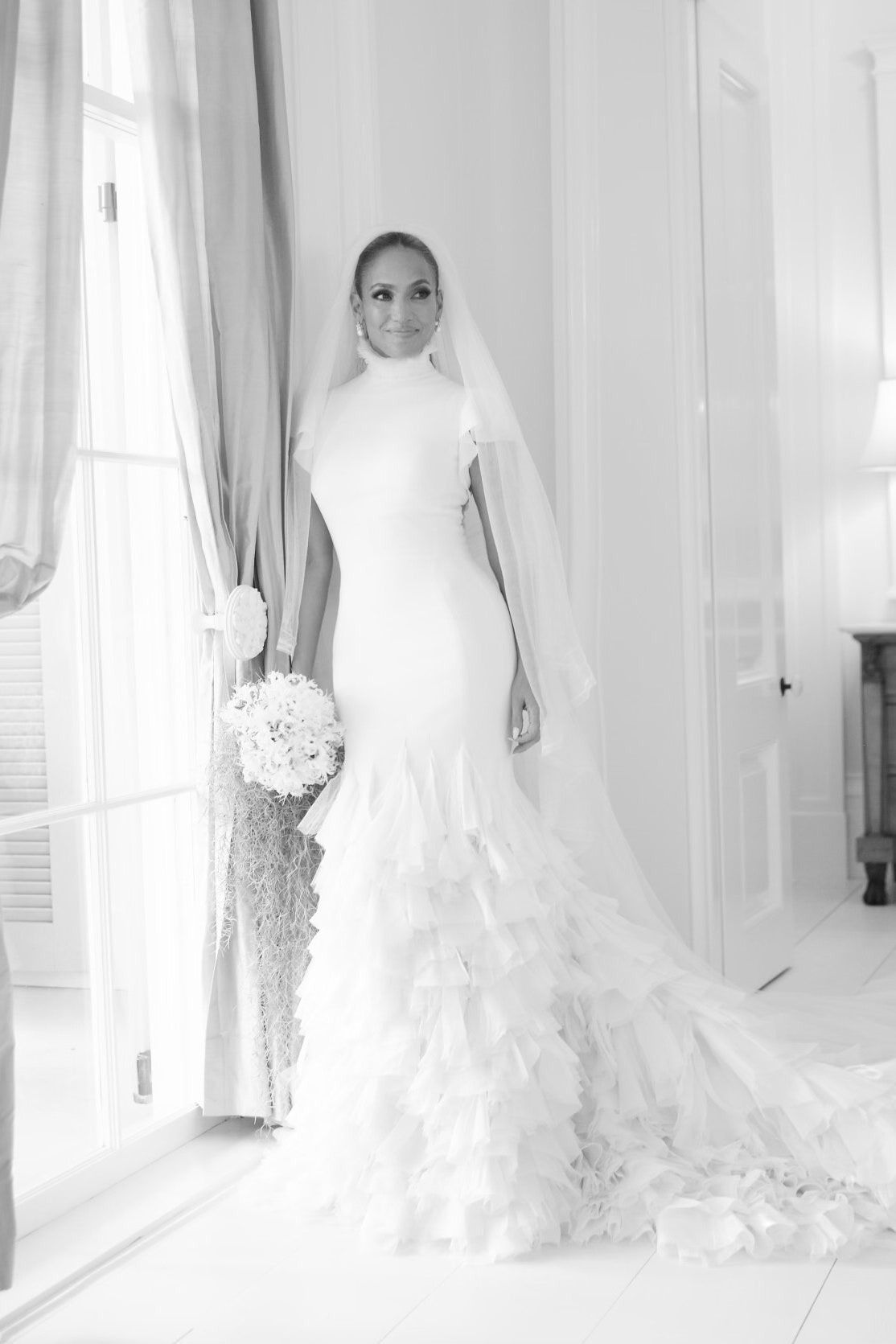 你的婚紗輪廓和風格絕對應該在你的婚禮珠寶中扮演重要角色。如果你穿的是較高領的婚紗,配戴吊墜耳環可以讓整體造型更協調;較深的領口可以搭配較長的項鏈,而手鐲可能會讓較長袖子看起來太累贅,還要考慮整體裝束的氛圍, 「The Row製作了我女兒的婚紗,可以想像,這是一場極簡主義的夢幻婚禮,」 Garber分享道, 「這件裙子的完美耳環是我們的Pearl On The Hook。它們是單顆南海珍珠,由於我們的勾環設計,看起來就像漂浮在耳垂下方。它們是我們送給她的婚禮禮物,她一直戴着它們。」