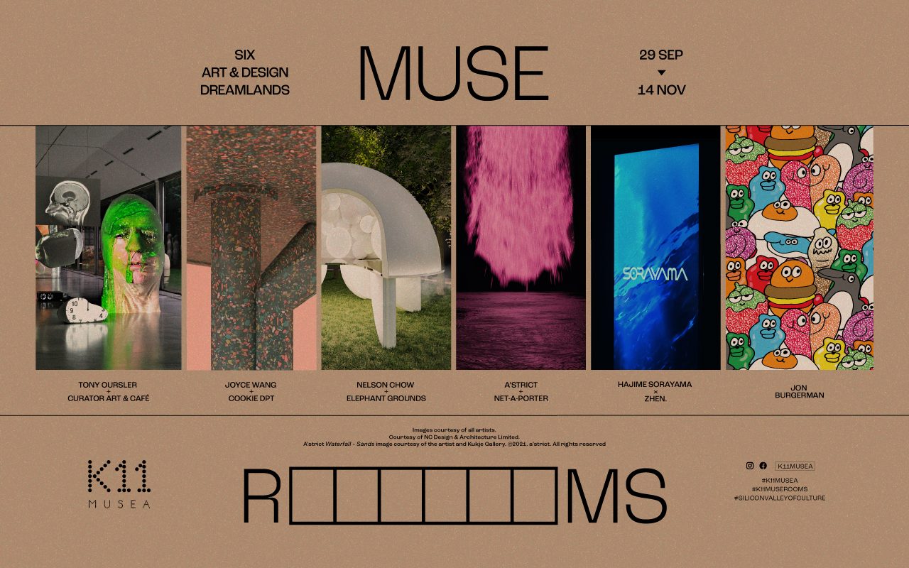 尖沙咀商場K11 MUSEA與一系列著名藝術家、設計師與生活品牌合作,舉辦一場融合藝術、設計、風格和品味的想像之旅,帶領讀者遊覽六間不同主題和風格的展區。今次為期約一個半月的展覽,主辦單位更邀請了6 位著名藝術家及設計師聯手分別為商場打造六間 各具特色的MUSE ROOMS,當中包括數碼媒體藝術設計公司a’strict、以童真而鮮艷色彩鮮明風格的紐約著名藝術家 Jon Burgerman、建築師 Nelson Chow、美國多媒體裝置藝術家 Tony Oursler、機械情慾藝術家空山基及知名國際室內設計師 Joyce Wang。