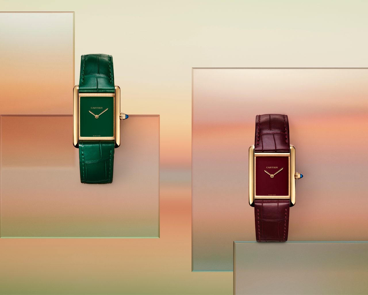 首先兩款和當年Tank Must如出一徹的淨色錶盤版本,一個酒紅色一個綠色,都以漆面演繹,以黃金錶殼搭載1917 MC手動上鏈機芯,並搭配同色系鱷魚皮錶帶,散發簡約而優雅的丰采,觸動人心。