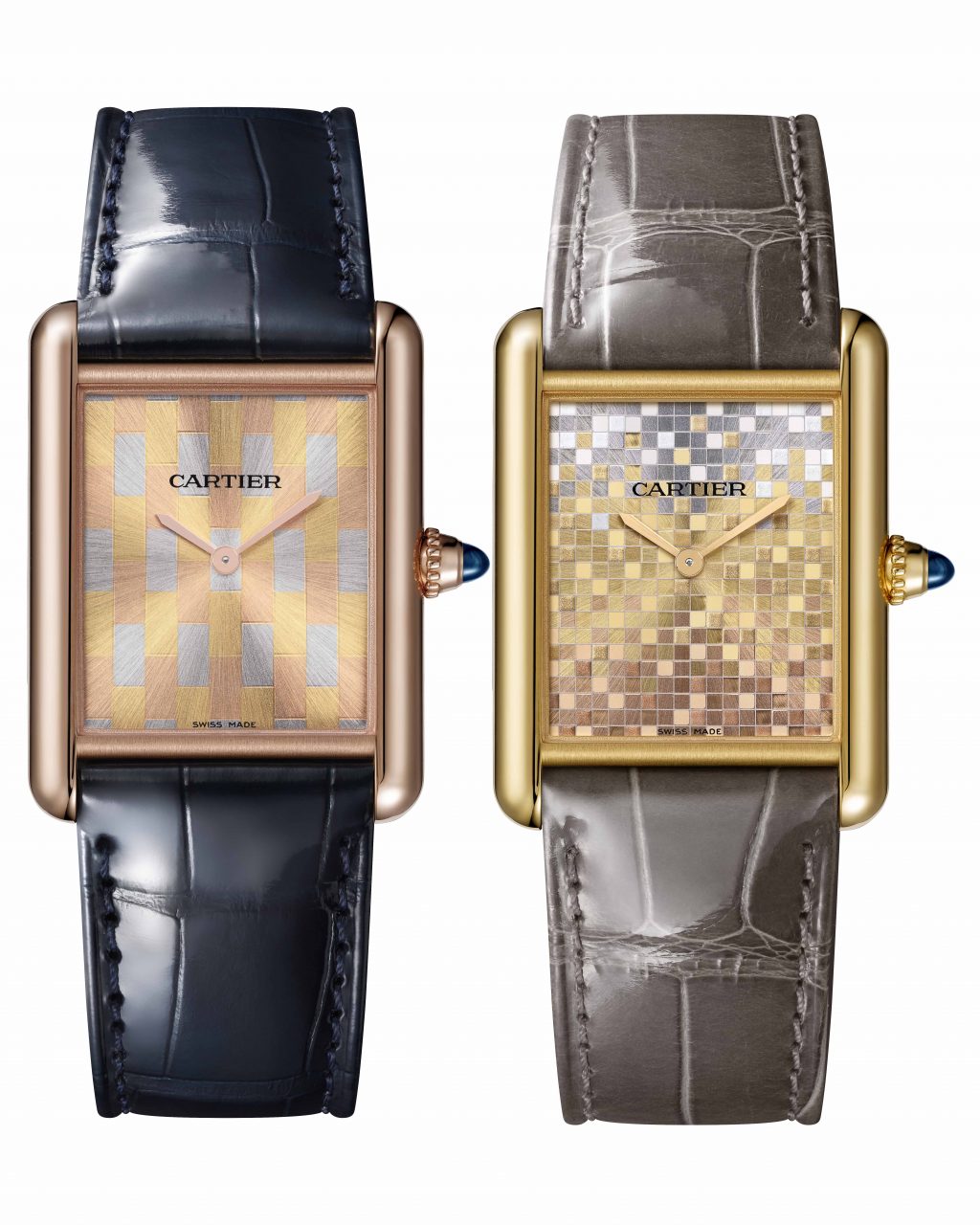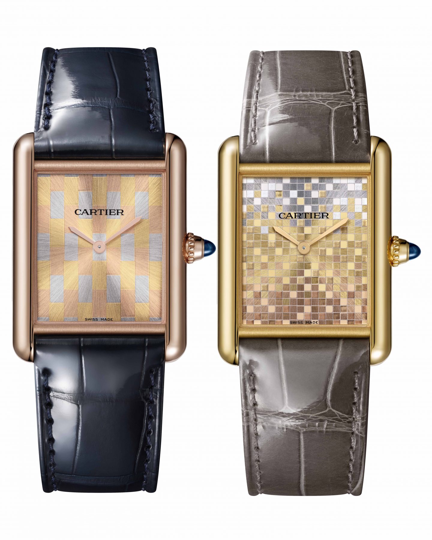 另外兩款則以黃金或玫瑰金錶殼演繹充滿幾何方格電鍍圖案美感而且閃閃泛光的錶盤,以黃金、玫瑰金和白色黃金等卡地亞經典的三色方格組成,營造豐富的光影栅格效果。黃金款以較為細密格紋演繹圖案,玫瑰金款的格紋則較大和排列有序,各自反映不同的視覺美態。前者搭配灰褐色蠣魚皮錶帶,後者則為深藍色鱸魚皮錶帶,同樣搭載1917 MC手動上鏈機芯。