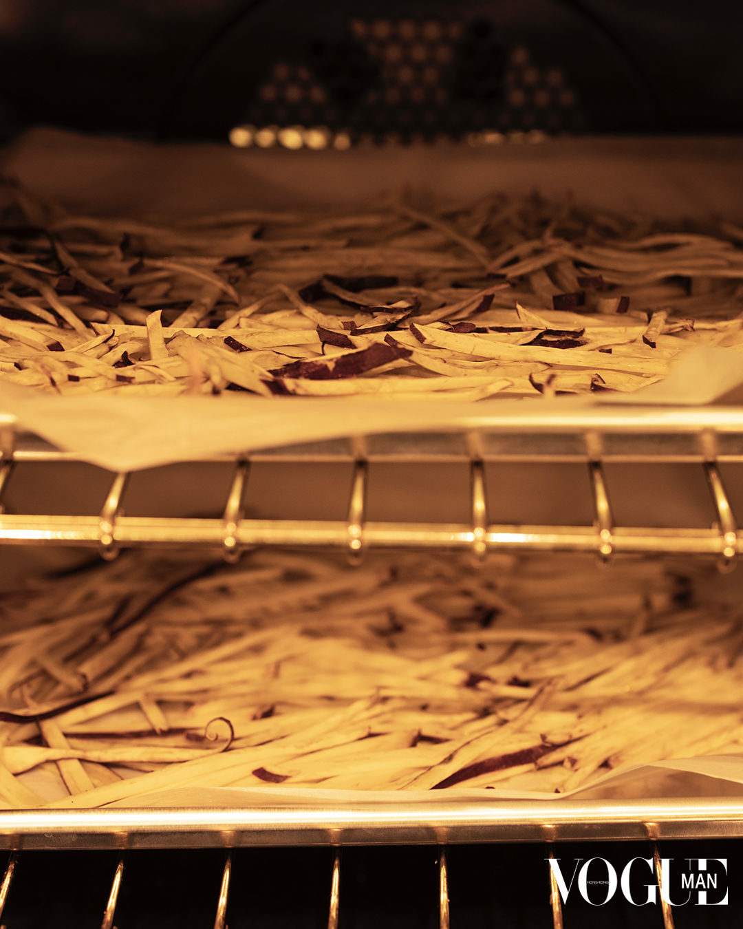 我和未婚妻最近開始嘗試研究如何炮製日式蕃薯薯條。首先,我將薯仔切成薄片,然後放入一小盤橄欖油,加入有機海鹽,最終放在焗爐中約20分鐘,直至它轉成金黃色。