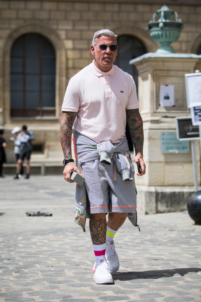 Nick Wooster, wearing Lacoste pink polo shirt and striped bermuda pants, is seen in the streets of Paris
