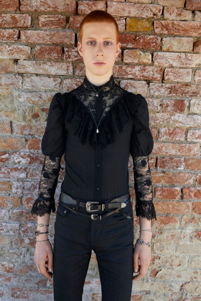 Saint Laurent 所帶起的這股搖滾風潮,可以回溯於當年在英國流行的「新浪漫主義 nouveau romantique」,華麗搖滾教父 David Bowie 等人都是延續「新浪漫主義」重要的傳承者。因此當 Saint Laurent 時裝展結束時,觀眾不僅能留下深刻的印象,並且能夠與當年 David Bowie 經典的舞台裝產生連結;使用大量的蕾絲,在區塊間透露男人的性感魅力,尤其宮廷式的微高領設計,更可以凸顯華麗搖滾在中上流社會的影響。除此之外,這季所有的服裝都以倘露上身作為系列的主軸,呼應 70 年代的搖滾,也凸顯疫情之後解放自由的年輕意識。