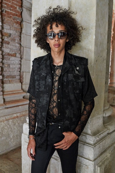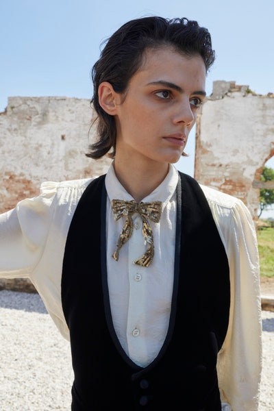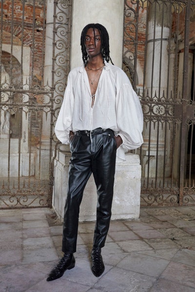 Saint Laurent 在這季玩味於華麗與龐克之間的搖滾概念,凸顯當時上下階級的社會階層文化,衝擊性的搭配是這季的重點之一。這季的歐洲宮廷式燈籠袖襯衫,不僅帶出上位階層的高冷意象,誇張的燈籠袖經由海風的吹拂,也呈現夏日的休閒海島風情,搭配帶點 SM 意味的繁複鈕扣和綁帶皮鞋設計,卻散發叛逆、反傳統的氣息,讓異材質拼接更顯趣味,就像在看一則上下階層鬥爭衝突的故事。整體而言,Saint Laurent很巧妙的利用 Green Lens 綠色之鏡作為舞台,透過搖滾結合無性別時尚,把大自然徐徐的海風當作說故事的人,慢慢講述華麗搖滾、龐克搖滾之間的演變故事,融合夏天、年輕與叛逆解放的概念。