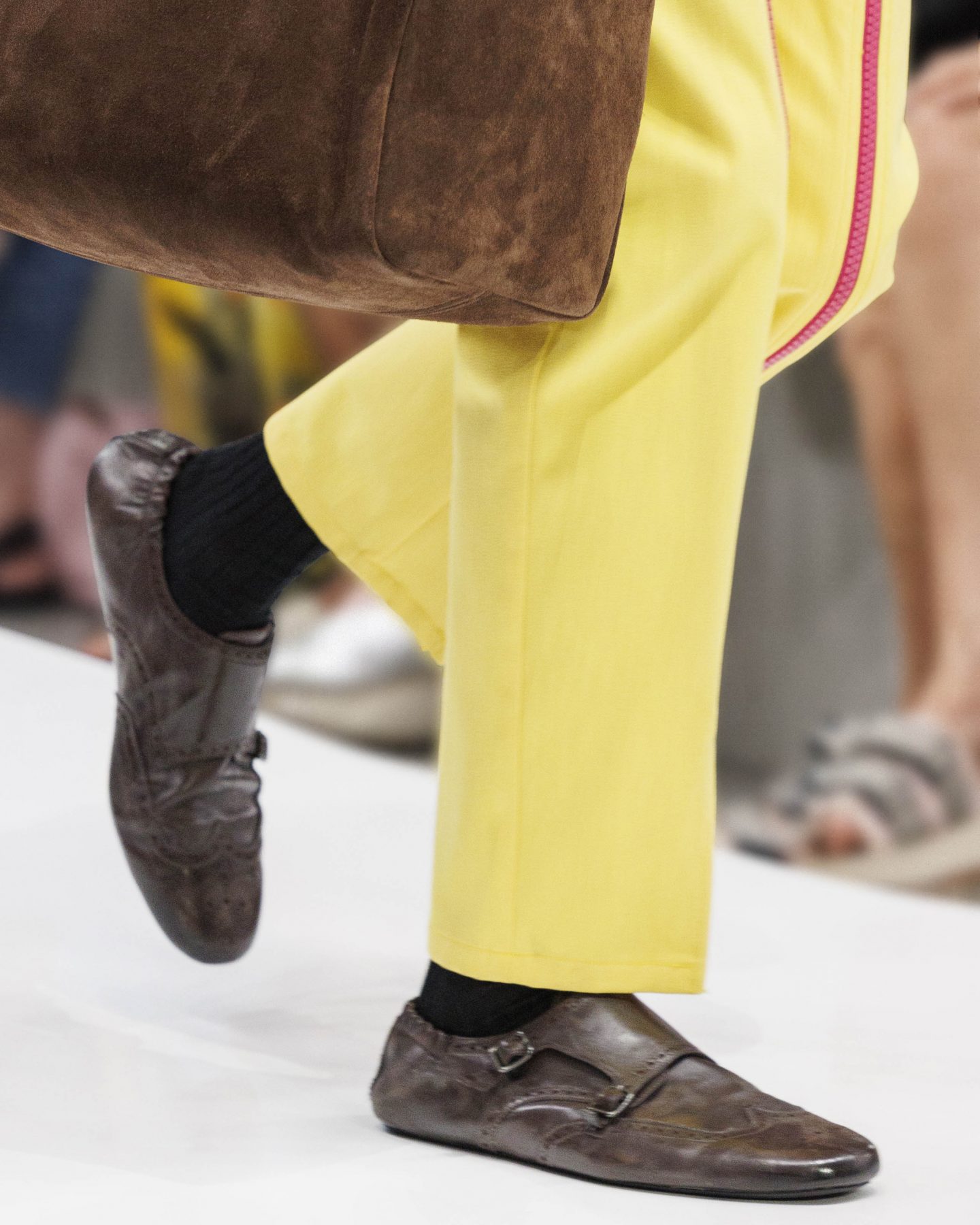 今季loafers及波鞋佔多數,不過像女裝平底鞋般的修腳loafers亦愈見普及,自問擁有幼長小腿的男士可以一試。典型的男裝皮鞋經過重新演繹,皮革顯得更貼服,鞋底亦更柔軟;當然厚底浮誇輪廓的皮鞋及波鞋仍然在不少時裝品牌中可見,此熱潮似乎仍未減退。