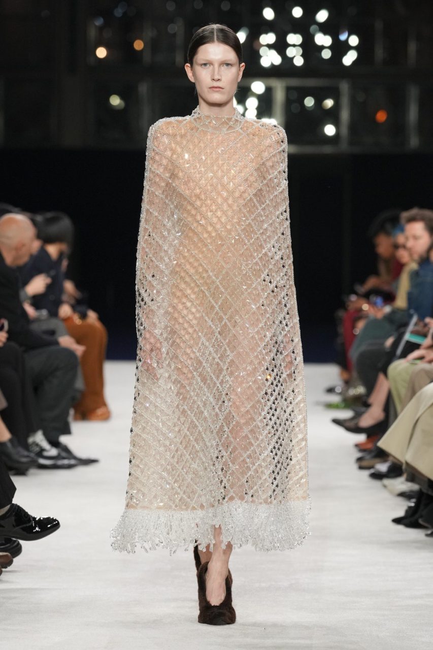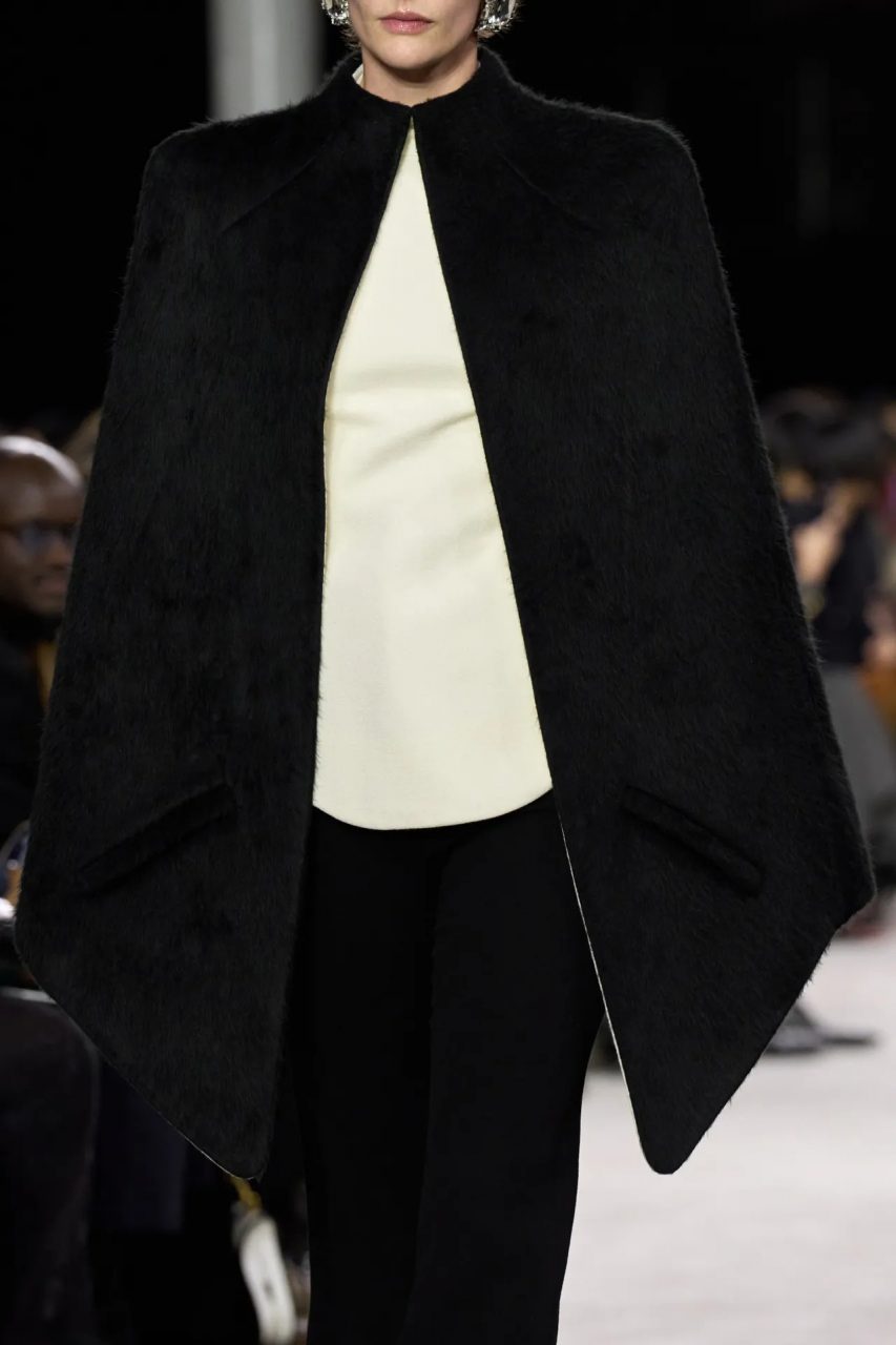 在這些標誌性帽子延續品牌的過往經典設計,例如 22 迷宮花押字、蝴蝶結、珍珠般的波爾卡圓點,以及解構主義的剪裁,翻領巧妙地扭曲以勾勒出寬大而合適的領口。 Rousteing 同時用 21 世紀的技術和當代工藝更新了 Balmain 的 DNA,例如用螺紋氯丁橡膠製成的 new-New Look 。 40 年代的露肩裙採用高光澤 PVC 材料製成,不禁讓人想像 Lauren Bacall 穿上它時的畫面。儘管斗篷向來予人非常老派的感覺,但現在又非常引人注目,例如他將馬海毛披肩融入定制夾克中,或在飾有別針和水晶,百分百令人感到驚喜。