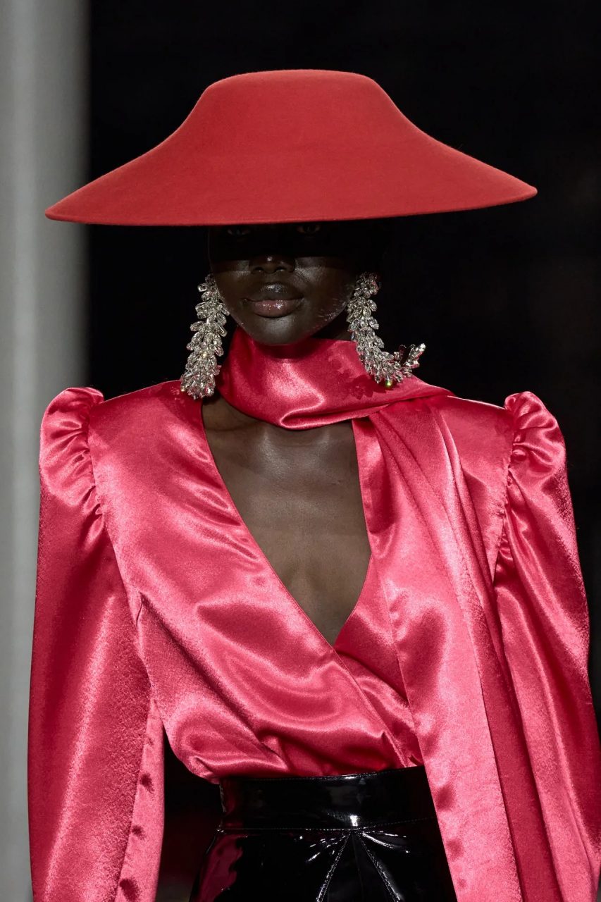 這次還有帽子設計師 Stephen Jones 的合作,他曾經為品牌設計一頂華麗的淺波紋馬海毛燈罩,這是 Blamain 在 1959 年的設計款式,別忘了他還有一頂 70 年代的皮革貝雷帽。 這次他一如既往地活潑、熱情、睿智,正如他指出的那樣,在 Pierre Balmain 於 1946 年創立自己的品牌之前,他曾與 Christian Dior 和 Hubert de Givenchy 一起為 Lucien Lelong 工作:那一定是一個多麼棒的工作室。
