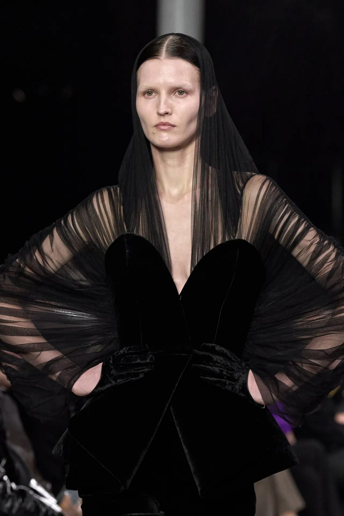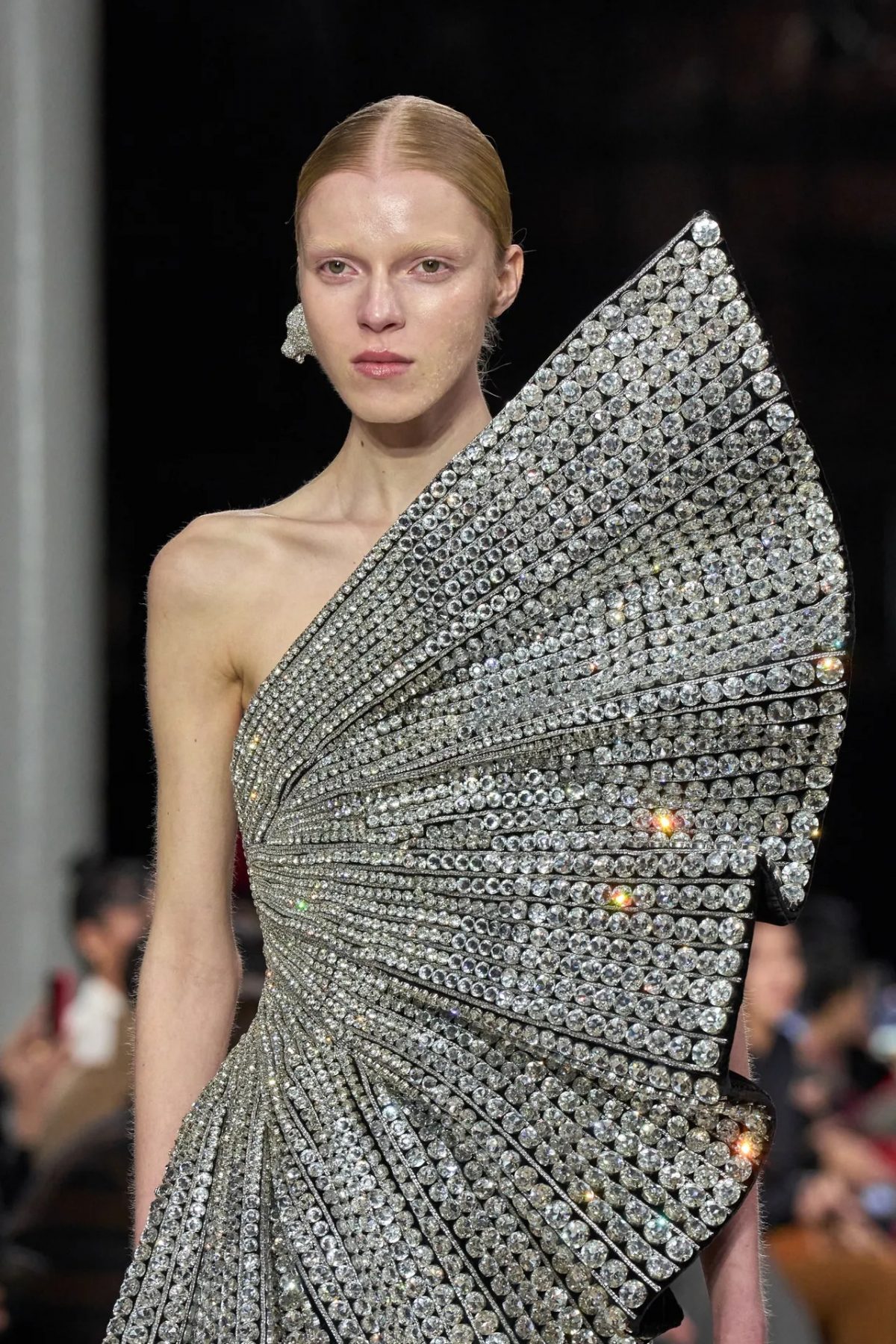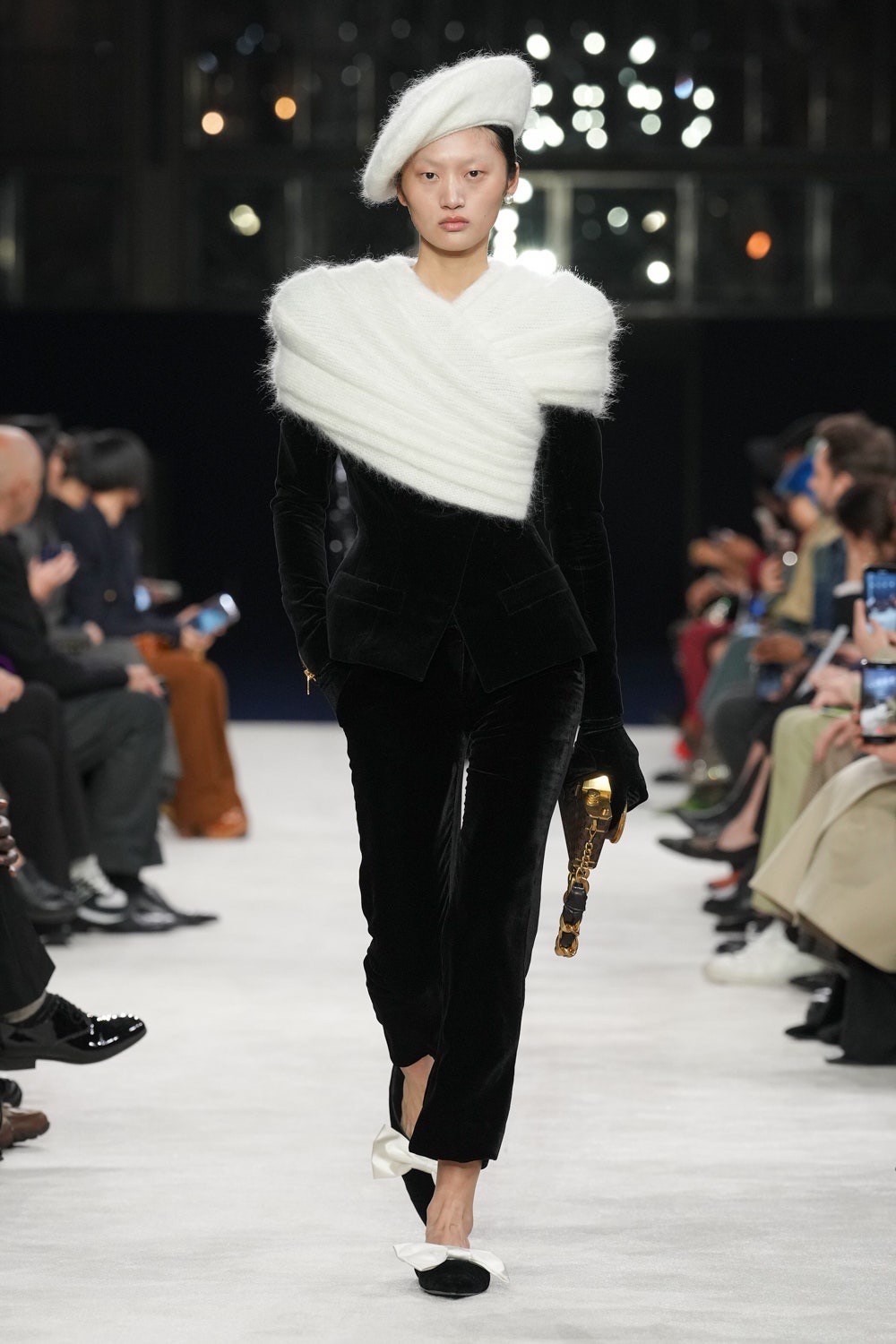 在這些標誌性帽子延續品牌的過往經典設計,例如 22 迷宮花押字、蝴蝶結、珍珠般的波爾卡圓點,以及解構主義的剪裁,翻領巧妙地扭曲以勾勒出寬大而合適的領口。 Rousteing 同時用 21 世紀的技術和當代工藝更新了 Balmain 的 DNA,例如用螺紋氯丁橡膠製成的 new-New Look 。 40 年代的露肩裙採用高光澤 PVC 材料製成,不禁讓人想像 Lauren Bacall 穿上它時的畫面。儘管斗篷向來予人非常老派的感覺,但現在又非常引人注目,例如他將馬海毛披肩融入定制夾克中,或在飾有別針和水晶,百分百令人感到驚喜。