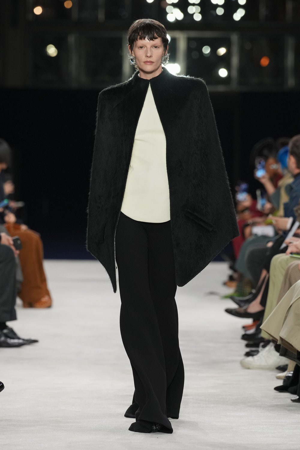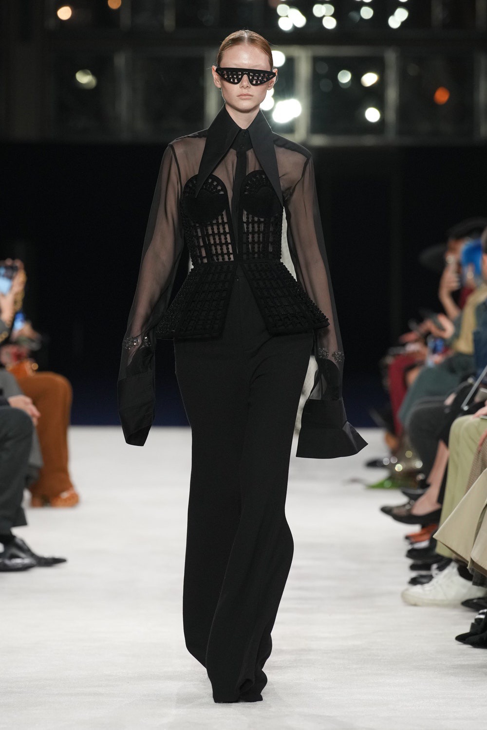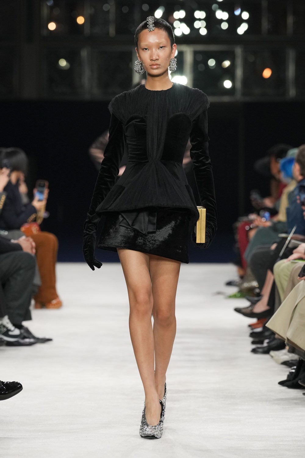 在這些標誌性帽子延續品牌的過往經典設計,例如 22 迷宮花押字、蝴蝶結、珍珠般的波爾卡圓點,以及解構主義的剪裁,翻領巧妙地扭曲以勾勒出寬大而合適的領口。 Rousteing 同時用 21 世紀的技術和當代工藝更新了 Balmain 的 DNA,例如用螺紋氯丁橡膠製成的 new-New Look 。 40 年代的露肩裙採用高光澤 PVC 材料製成,不禁讓人想像 Lauren Bacall 穿上它時的畫面。儘管斗篷向來予人非常老派的感覺,但現在又非常引人注目,例如他將馬海毛披肩融入定制夾克中,或在飾有別針和水晶,百分百令人感到驚喜。