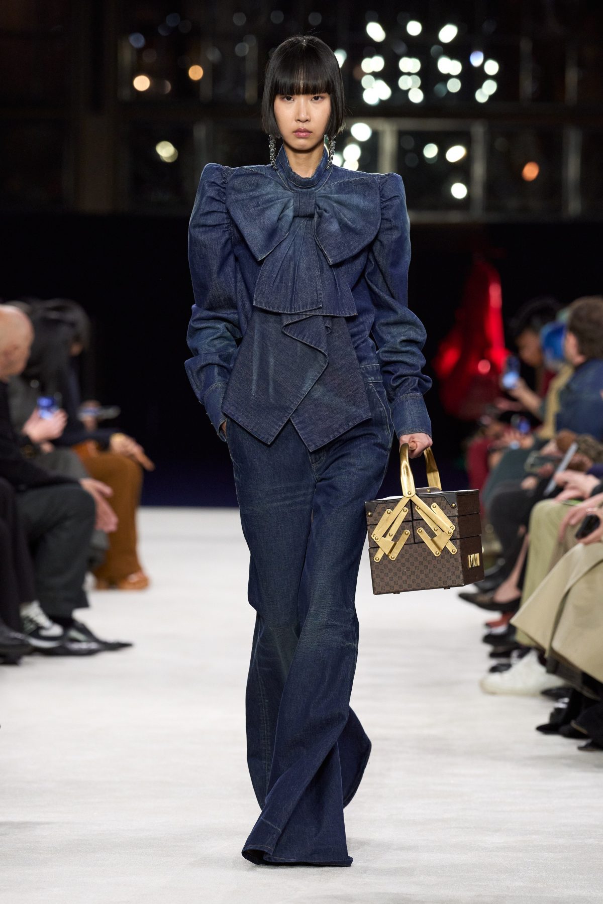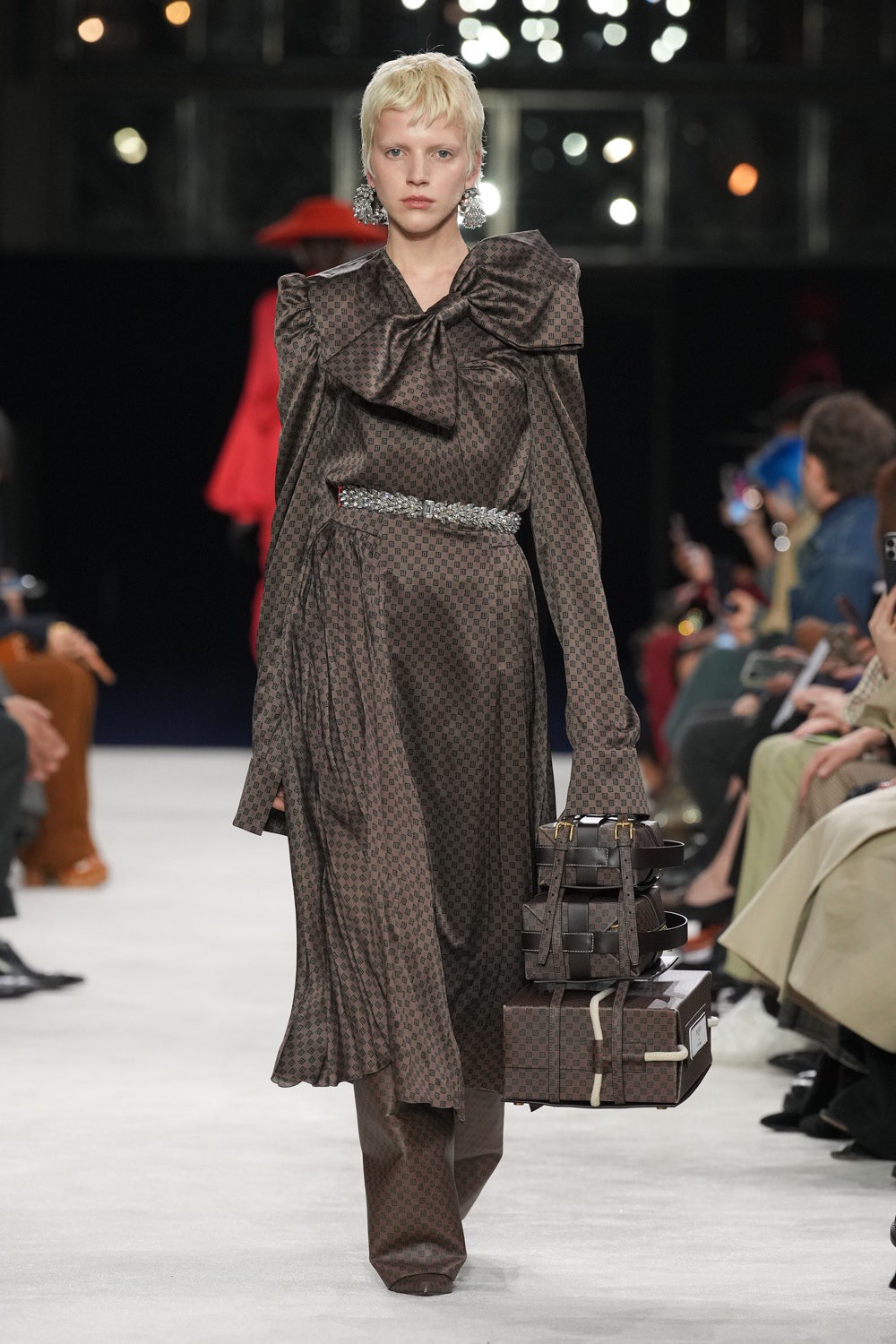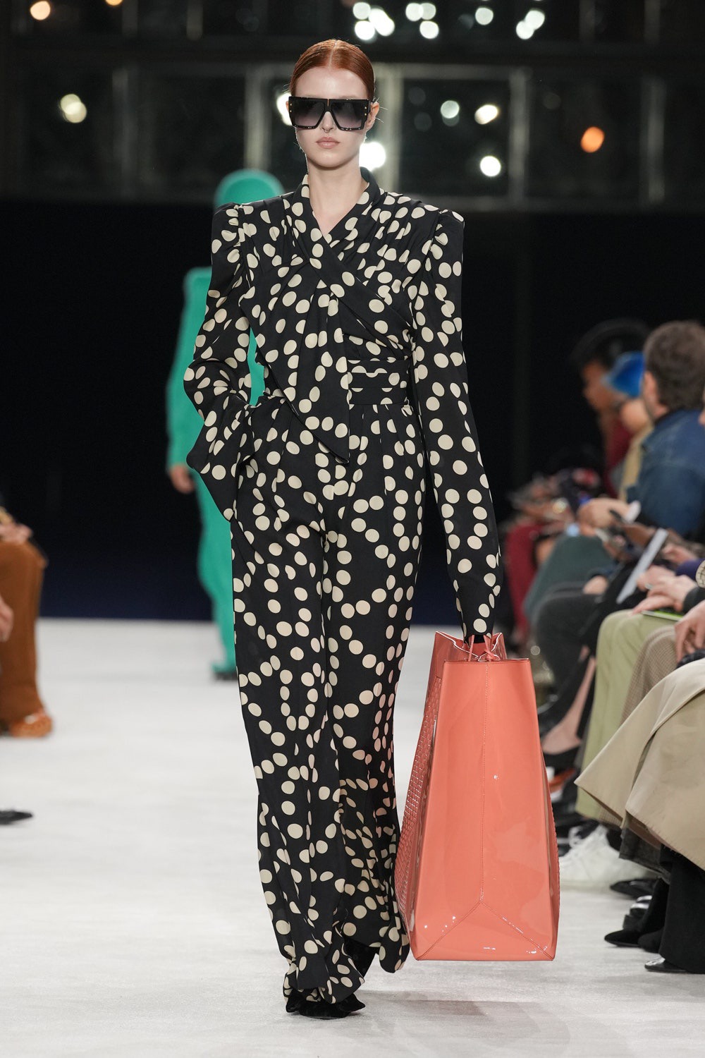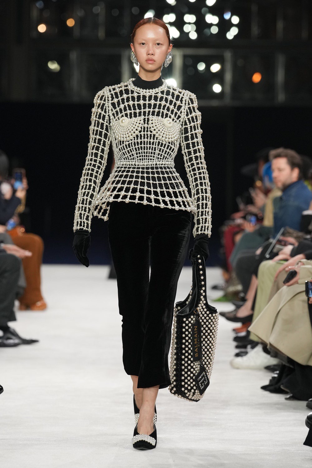 繼上一季史詩般的木鞋之後,Rousteing 在本季部分推出了厚底鞋,推出了可愛的蝴蝶結拖鞋和高跟鞋(當然也有一些厚底鞋,這次也有珍珠或緞面覆蓋)。 一些模特兒故意背著不合時宜的袋子、一堆捆在一起的小行李箱,以及莫名其妙的工具箱。 爆炸性的蝴蝶結連身裙、雕塑般的建築緊身胸衣、由沙沙作響的覆盆子網眼製成的性感長外套,以及超級修身的絎縫造型都是特別注目。的確,本季一如既往,Rousteing 遵循自己的內心,按照自己的方式做他認為的 Balmain。