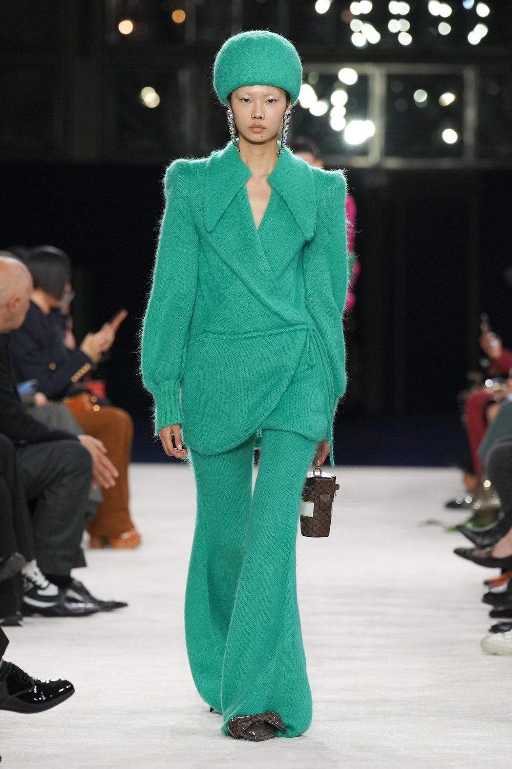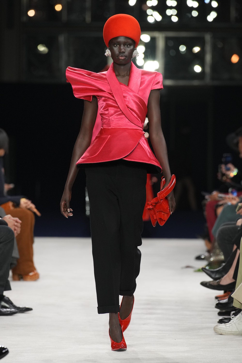 這次還有帽子設計師 Stephen Jones 的合作,他曾經為品牌設計一頂華麗的淺波紋馬海毛燈罩,這是 Blamain 在 1959 年的設計款式,別忘了他還有一頂 70 年代的皮革貝雷帽。 這次他一如既往地活潑、熱情、睿智,正如他指出的那樣,在 Pierre Balmain 於 1946 年創立自己的品牌之前,他曾與 Christian Dior 和 Hubert de Givenchy 一起為 Lucien Lelong 工作:那一定是一個多麼棒的工作室。