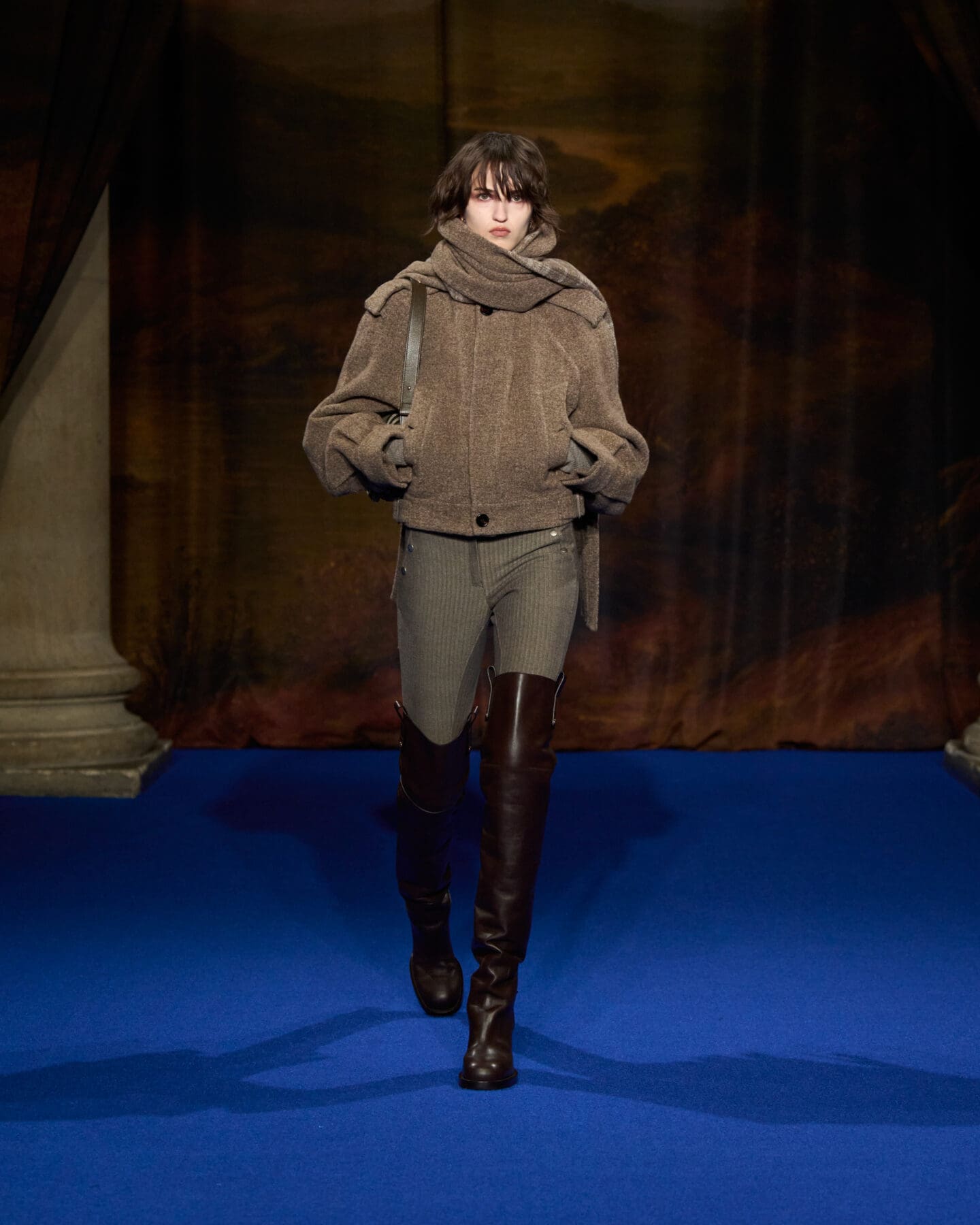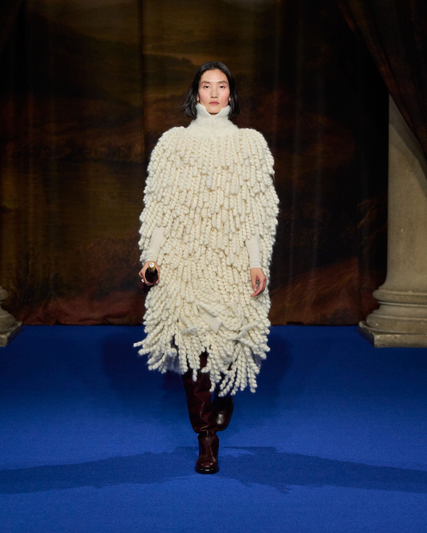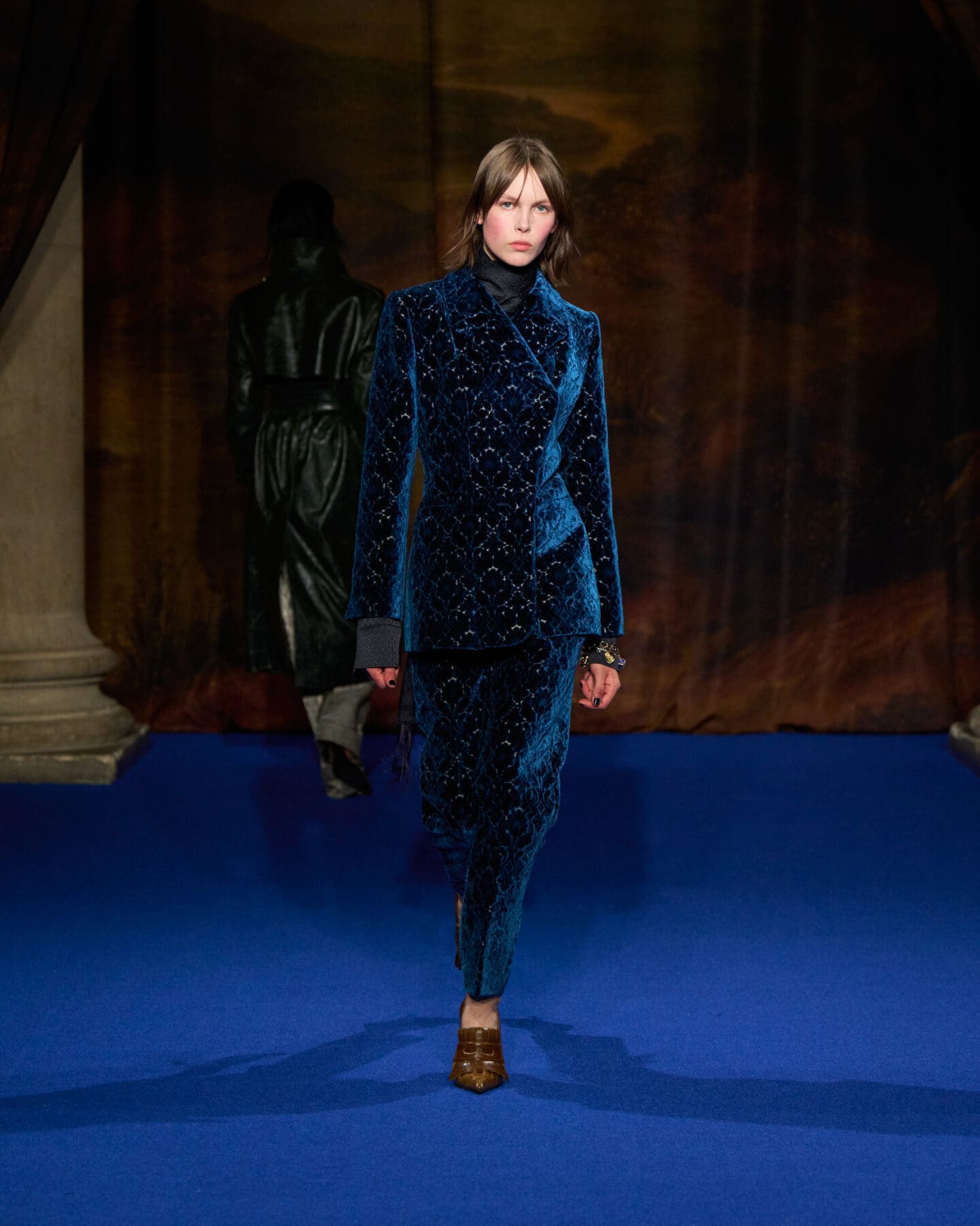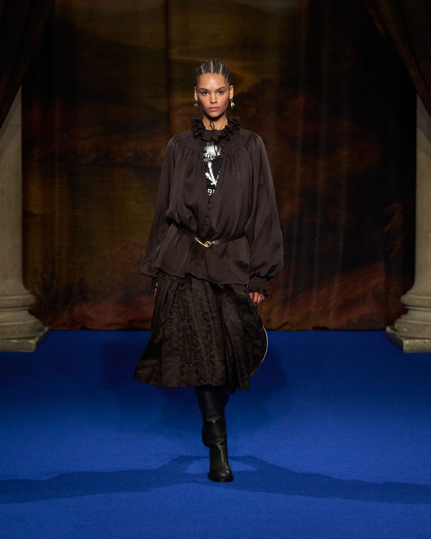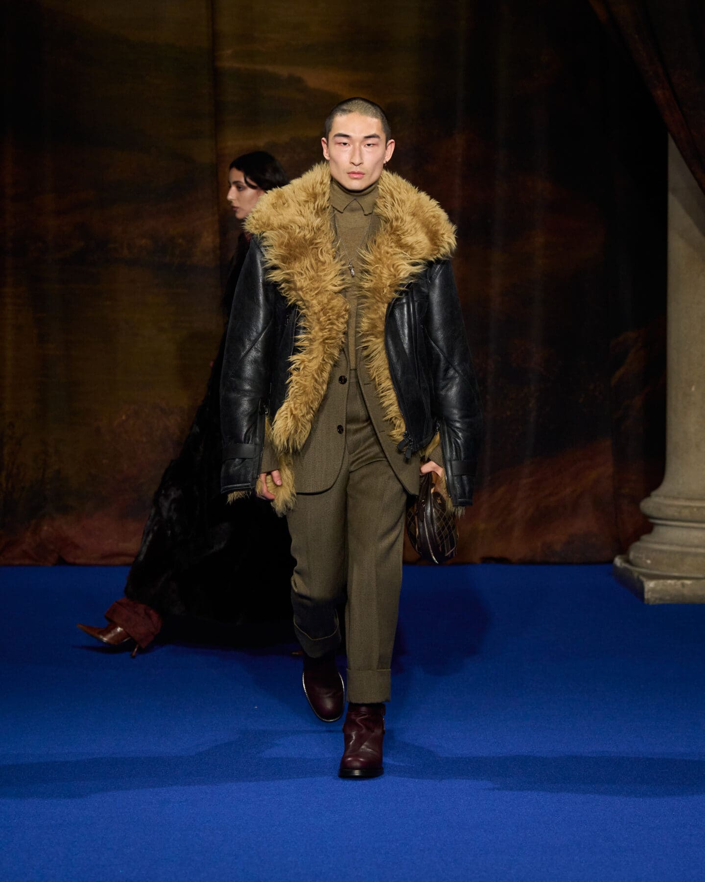古老莊園內的精湛工藝與奢華布料吸引深深吸引了他,Daniel Lee 在今季仔細研究了各款壁紙布樣,以及手工地毯及掛毯等家具面料,並將這些元素融入當代穿搭造型中。