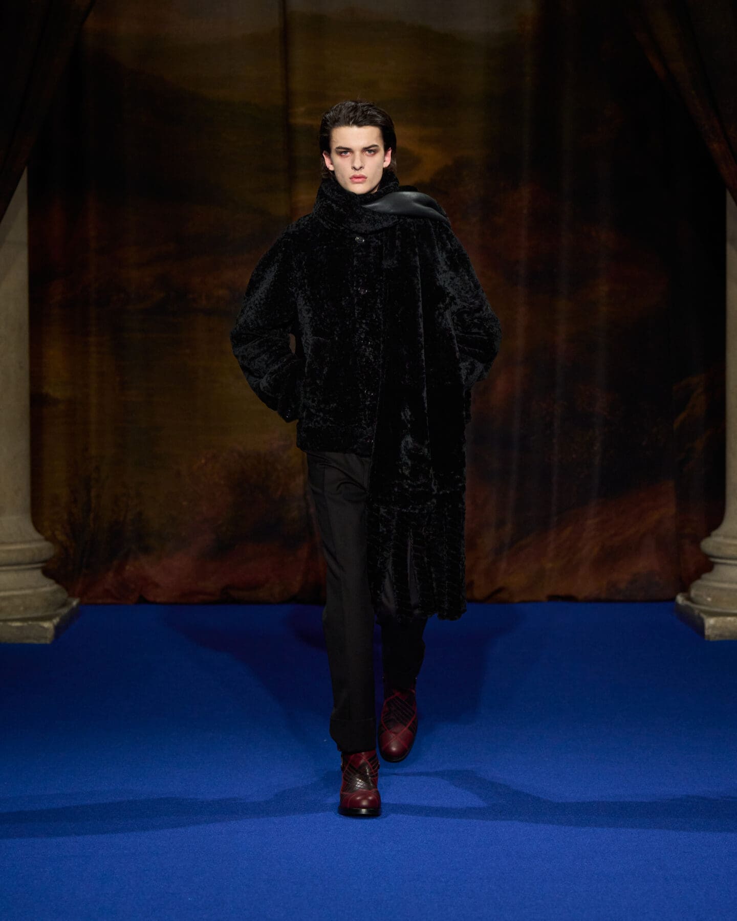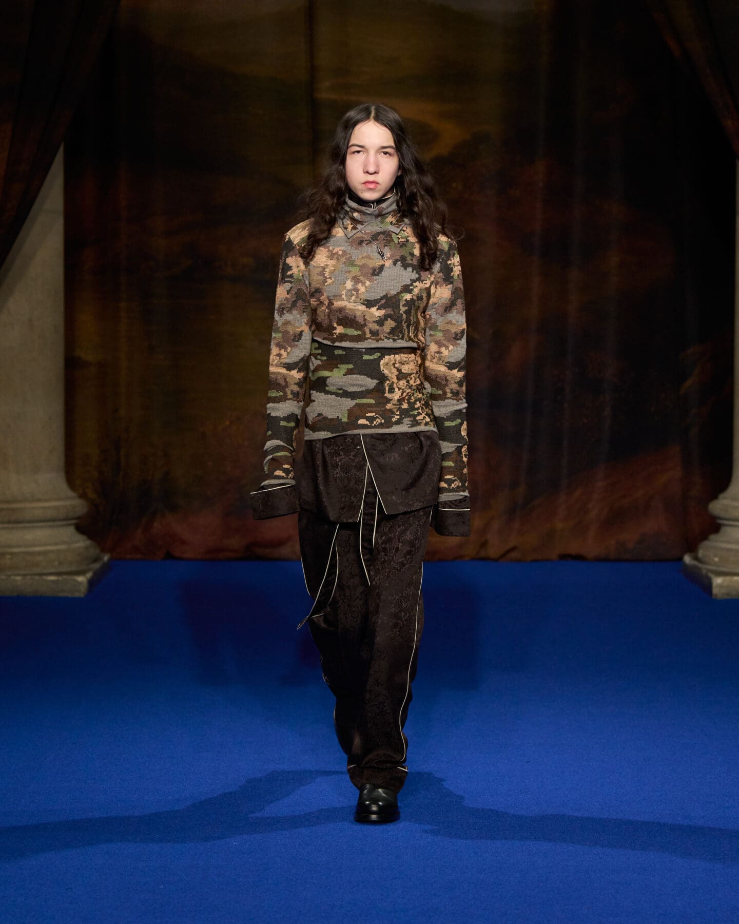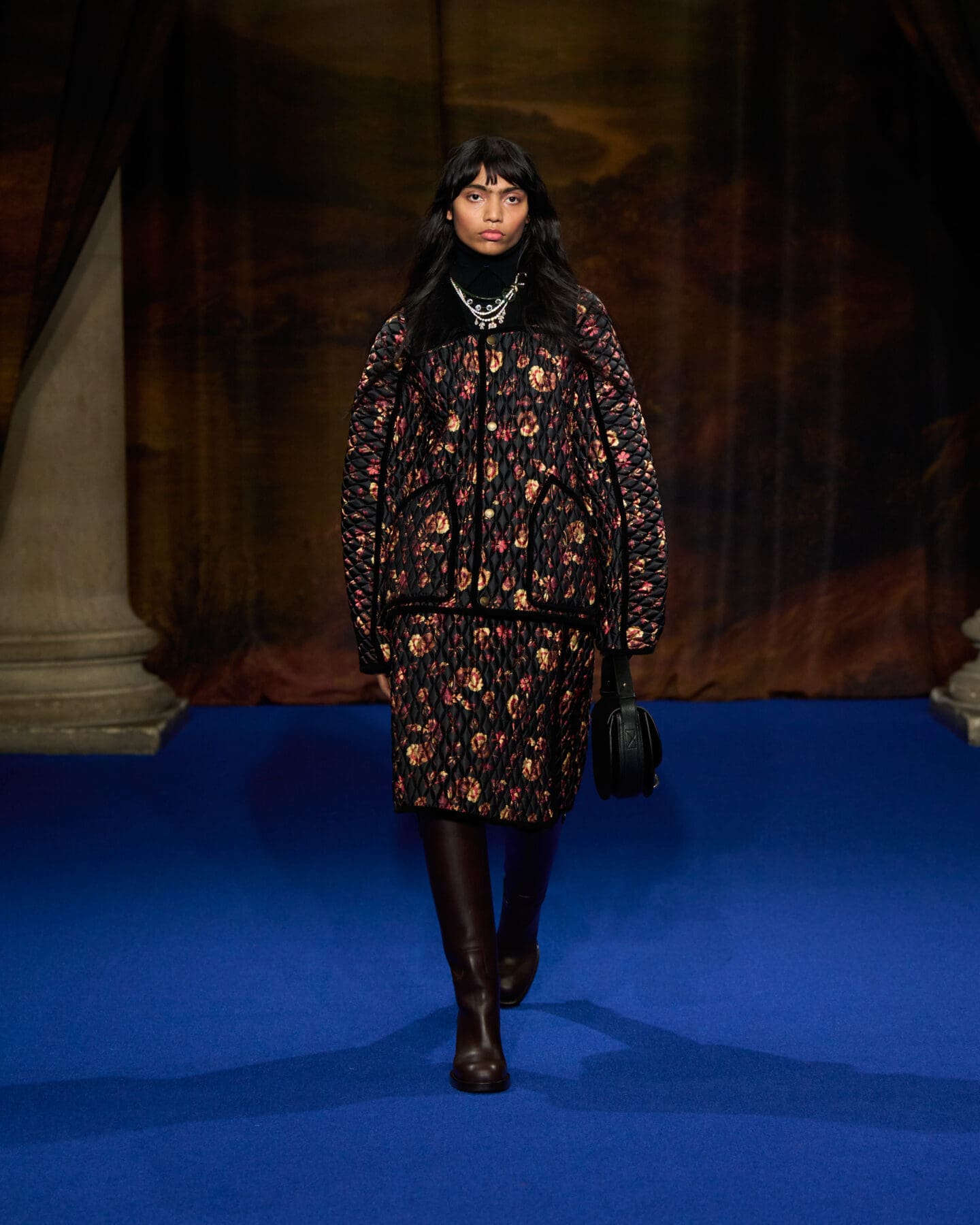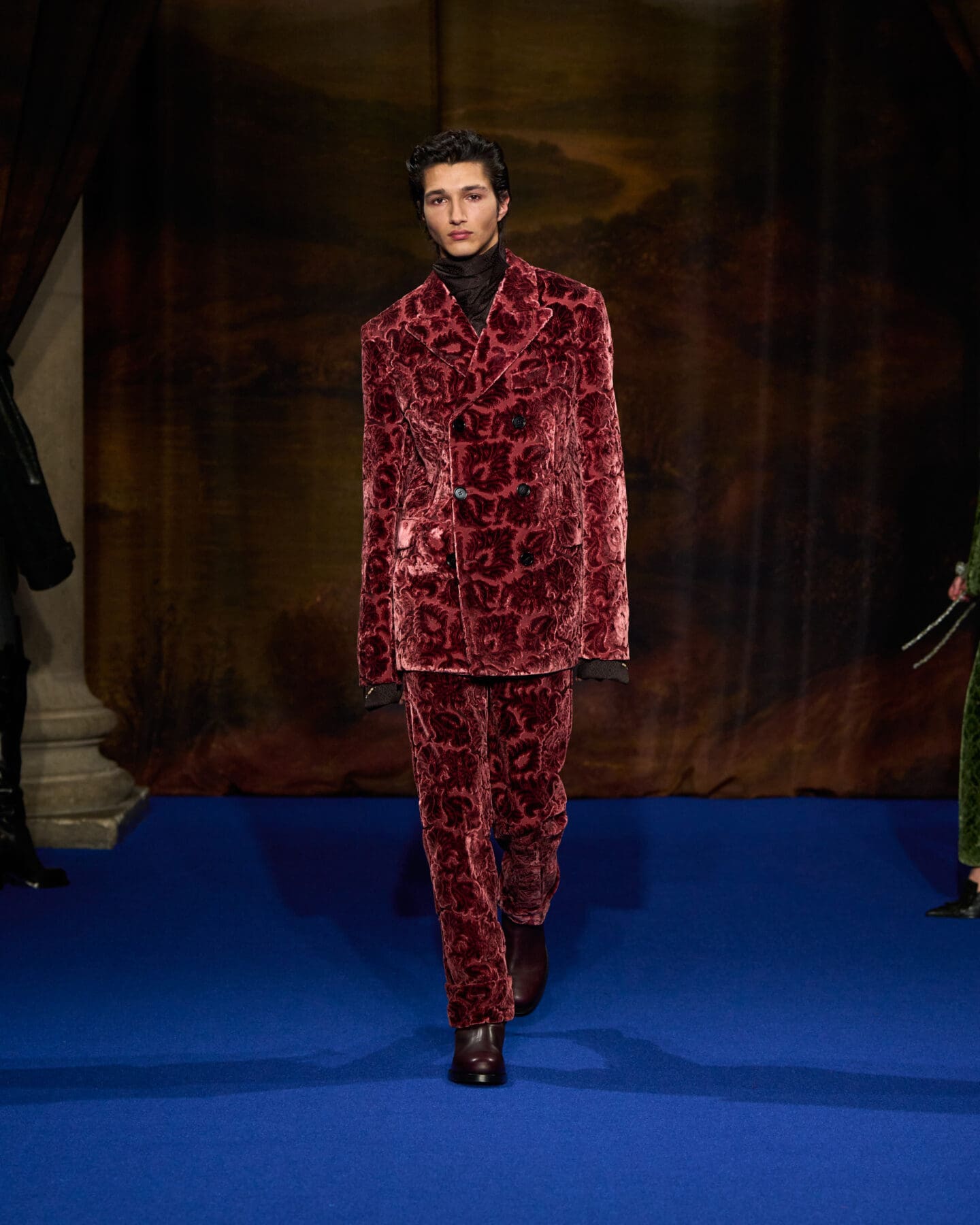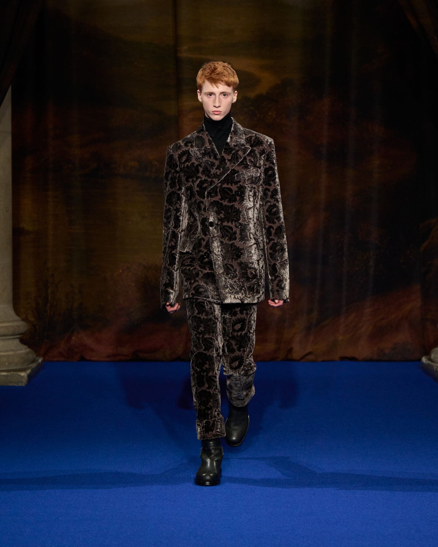 古老莊園內的精湛工藝與奢華布料吸引深深吸引了他,Daniel Lee 在今季仔細研究了各款壁紙布樣,以及手工地毯及掛毯等家具面料,並將這些元素融入當代穿搭造型中。