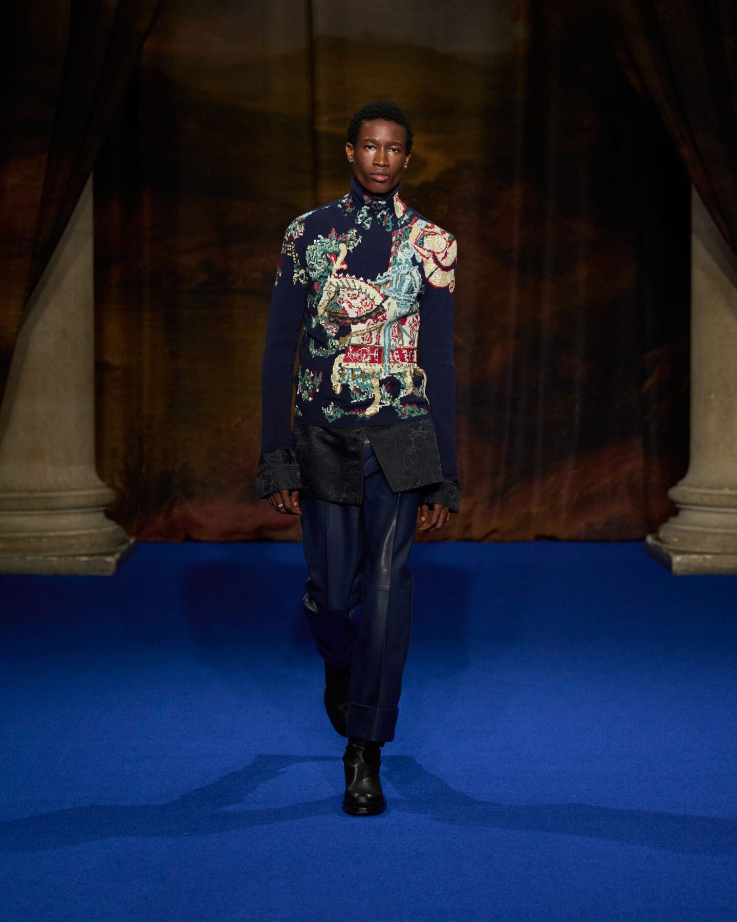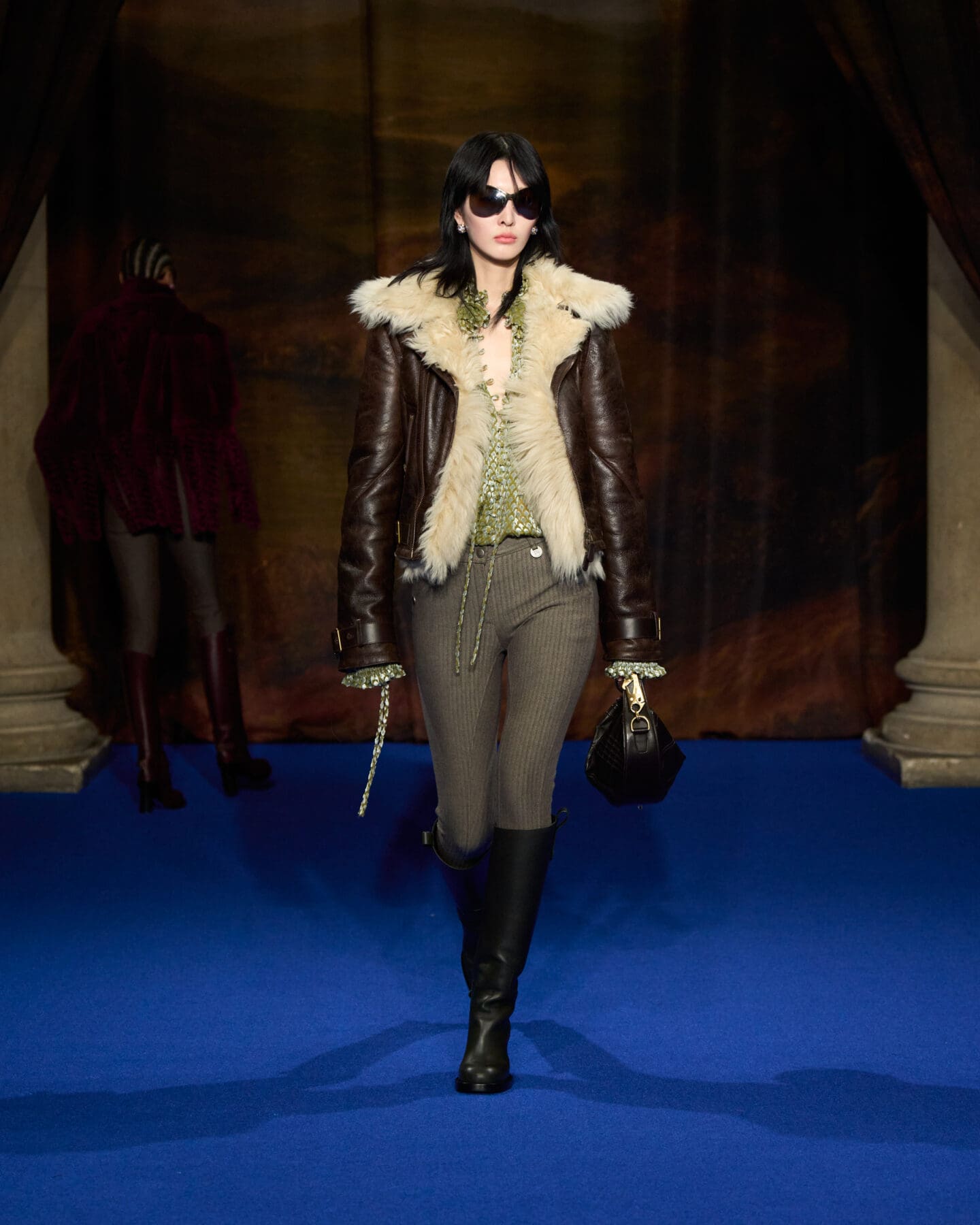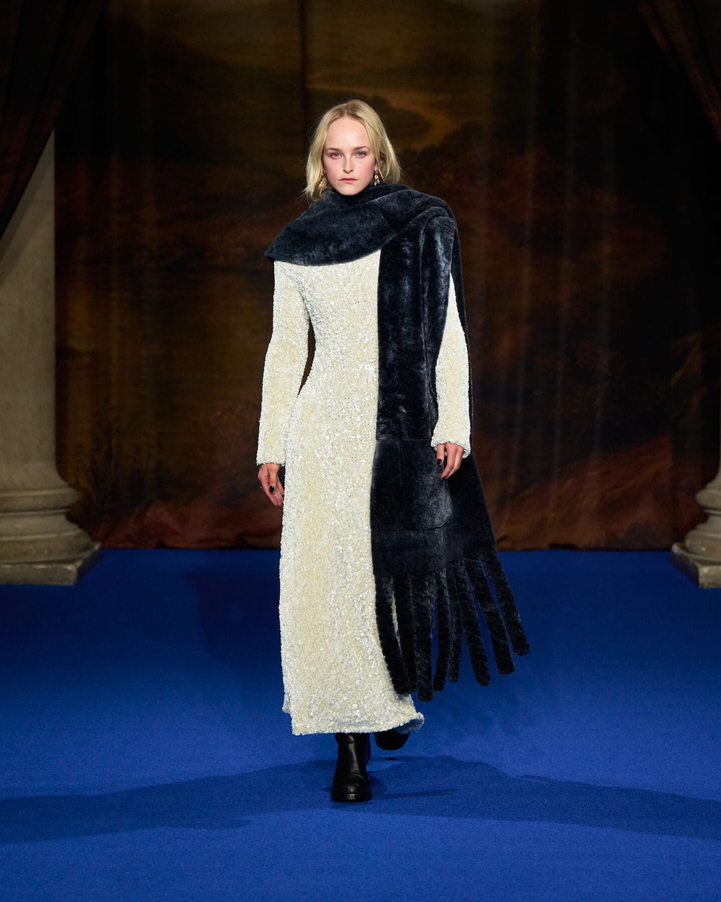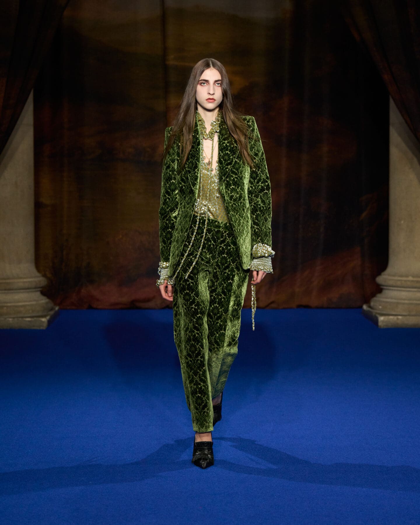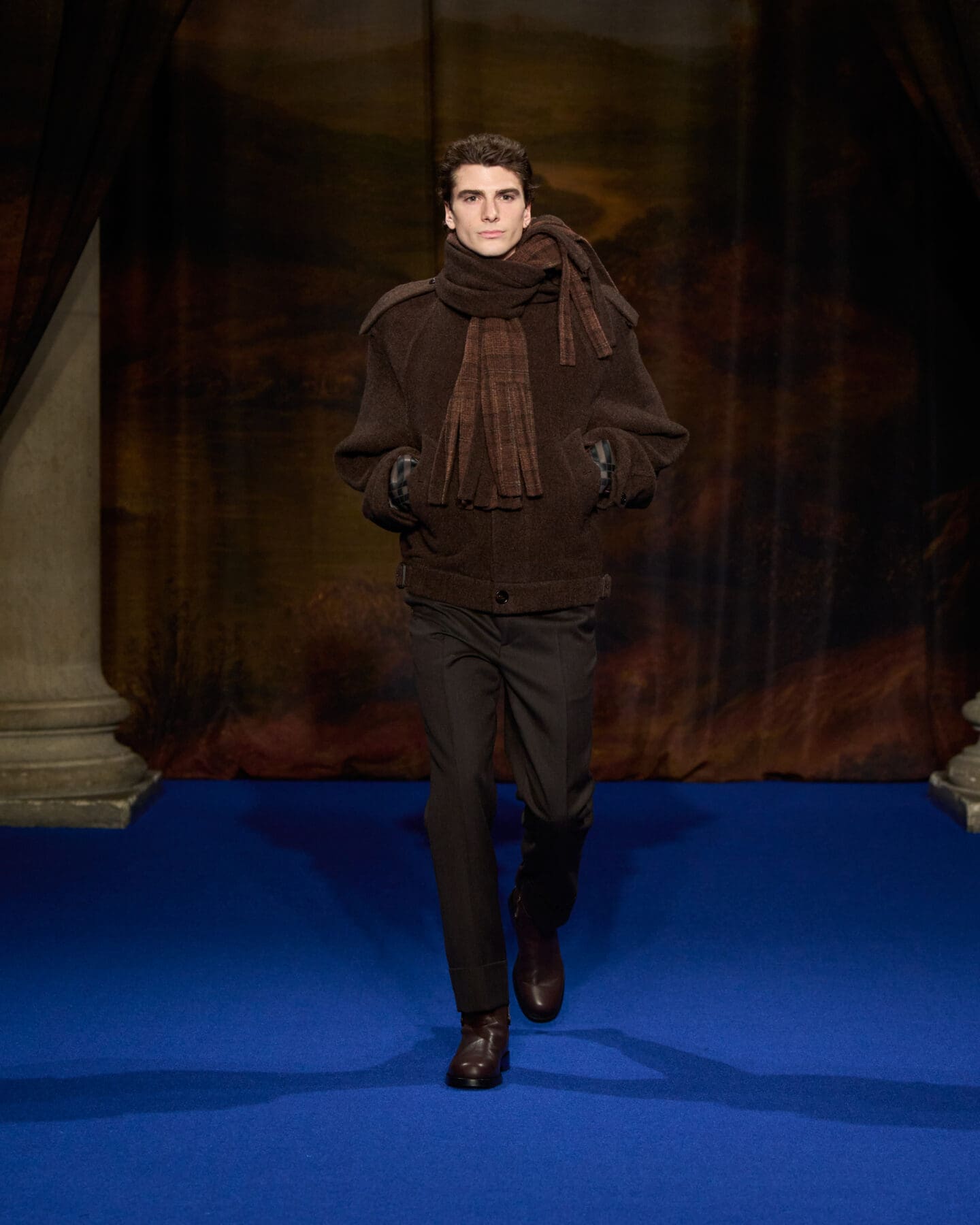 古老莊園內的精湛工藝與奢華布料吸引深深吸引了他,Daniel Lee 在今季仔細研究了各款壁紙布樣,以及手工地毯及掛毯等家具面料,並將這些元素融入當代穿搭造型中。