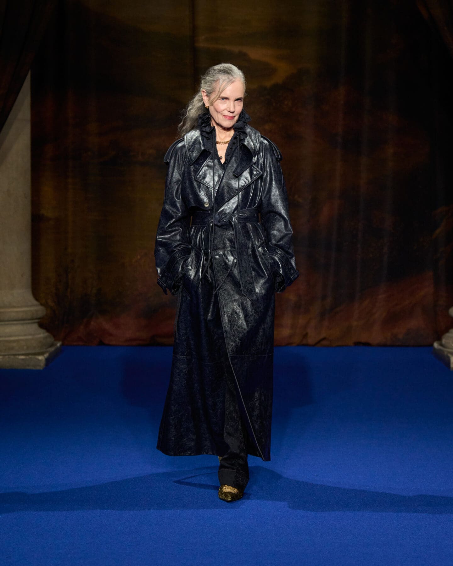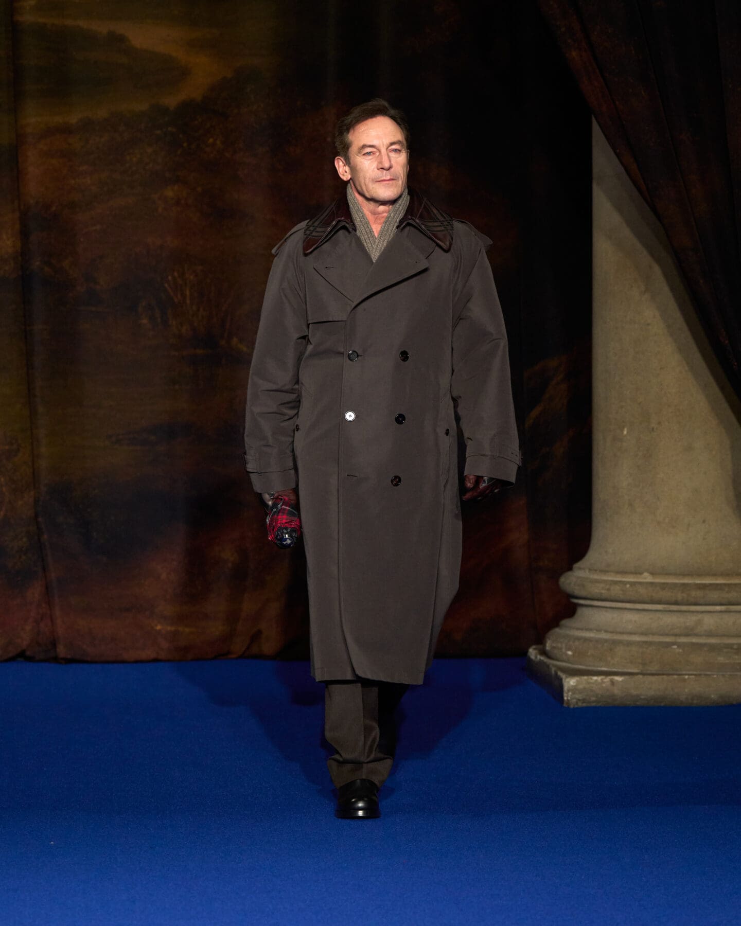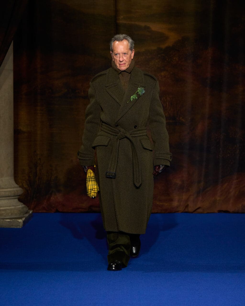 同樣貫徹 Daniel Lee 與英國精神的深厚聯繫,還有由英國演員組成的模特兒陣容。設計師引用了英國電影與戲劇中的經典意象,因為這些作品往往承載着深刻的印象,故今季驚喜亮相天橋的有聞早前出演 Burberry 最新廣告 Richard E. Grant,又有《The Crown》英國資深演員 Lesley Manville、最近以《The White Lotus》回歸的 Jason Isaacs,三人在今季一同客串模特兒,換上經典 Burberry 大衣造型,完美演繹所代表的英倫風格。