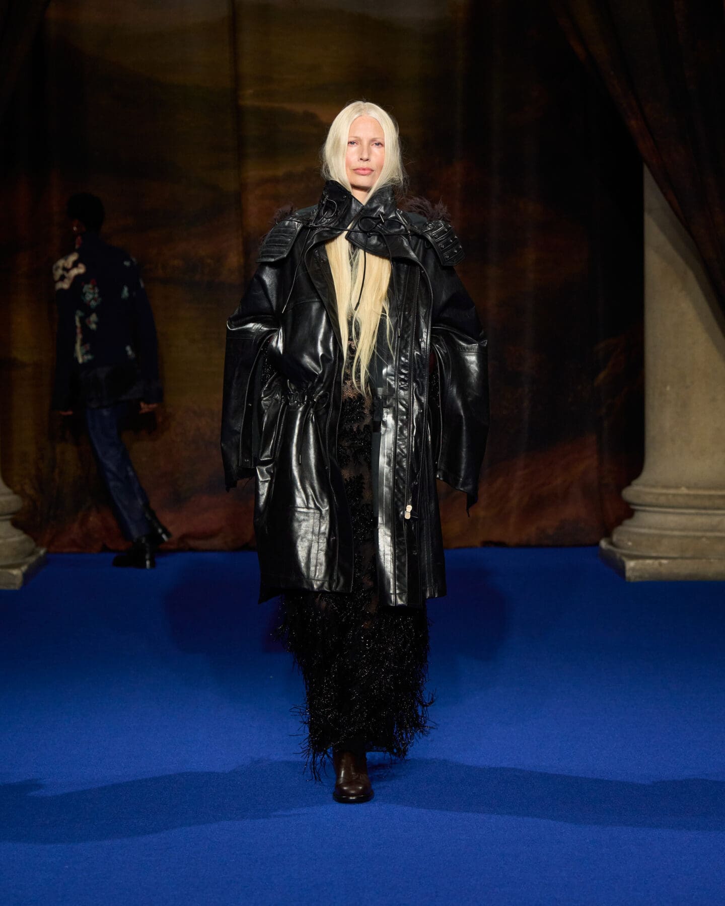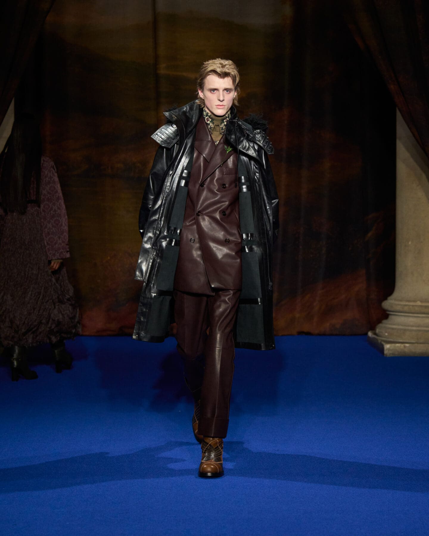 在本季,這款「傳世單品」融入到更廣泛的英式風格敘事,如風衣以浮雕皮革呈現,或裝飾着各款動物圖騰、毛絨羊皮,以及手工縫製的歐根紗葉冠;披肩選用了愛爾蘭軟呢與毛絨羊皮,融入風衣與飛行員元素的經典設計,靈感來自 Burberry 歷史悠久的檔案庫。此外,今季又帶來以英國探險家 Ernest Shackleton 爵士穿著的知名連帽大衣為靈感所設計的全新皮革外套。