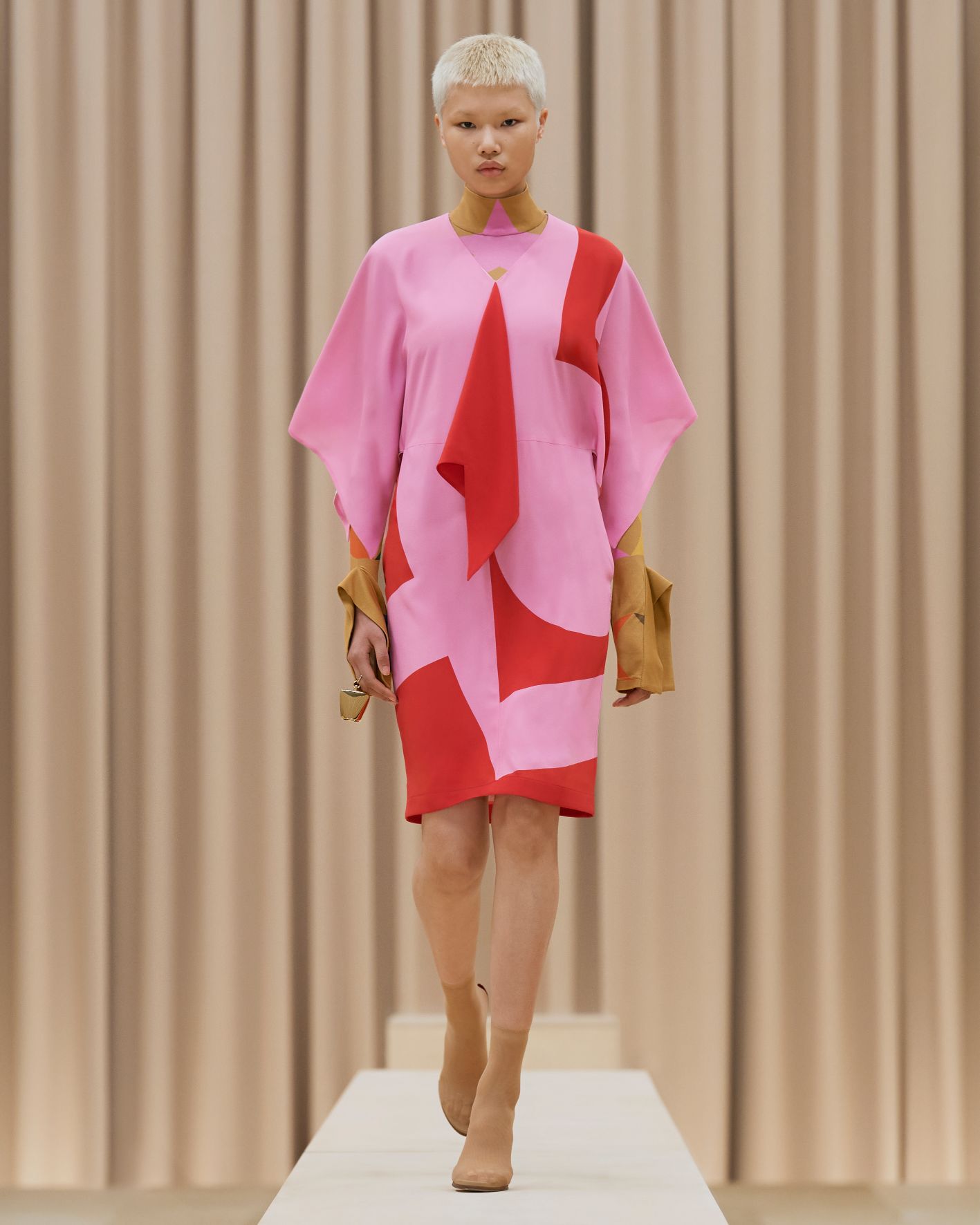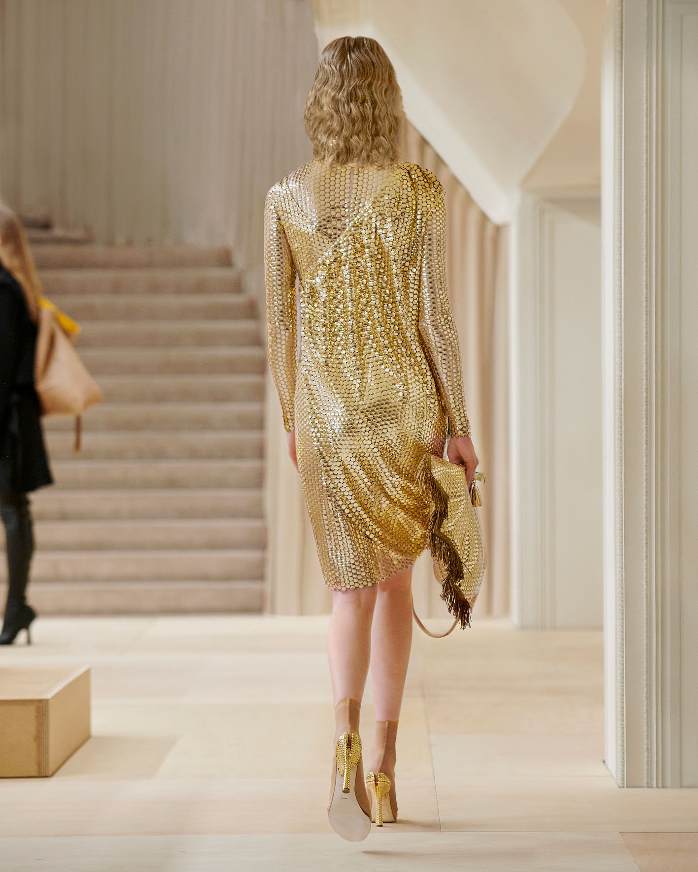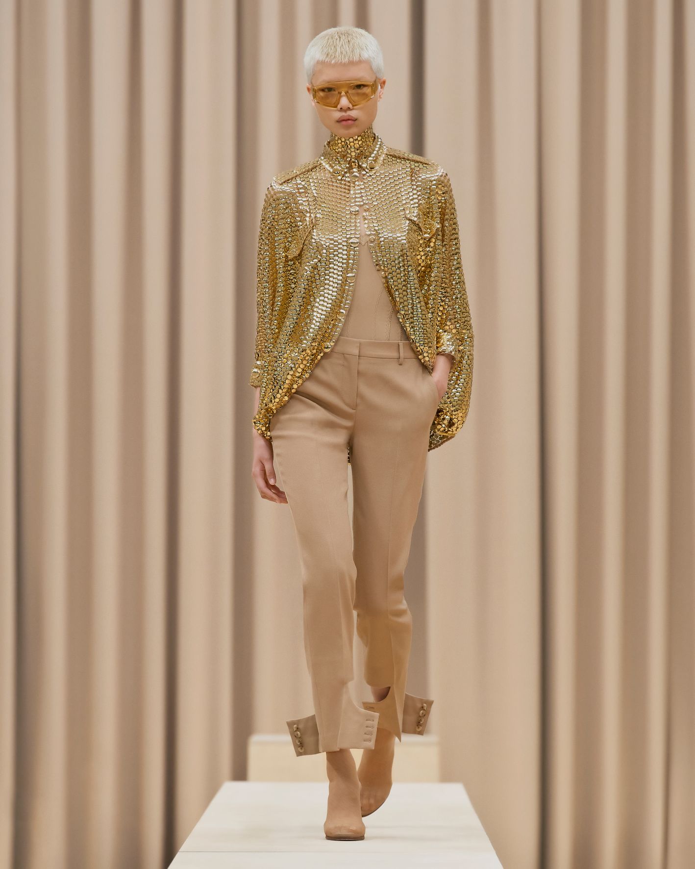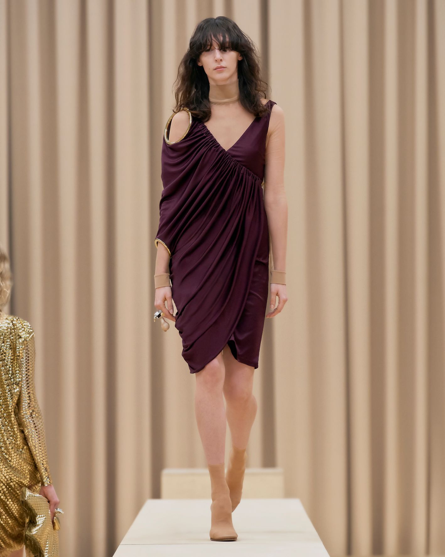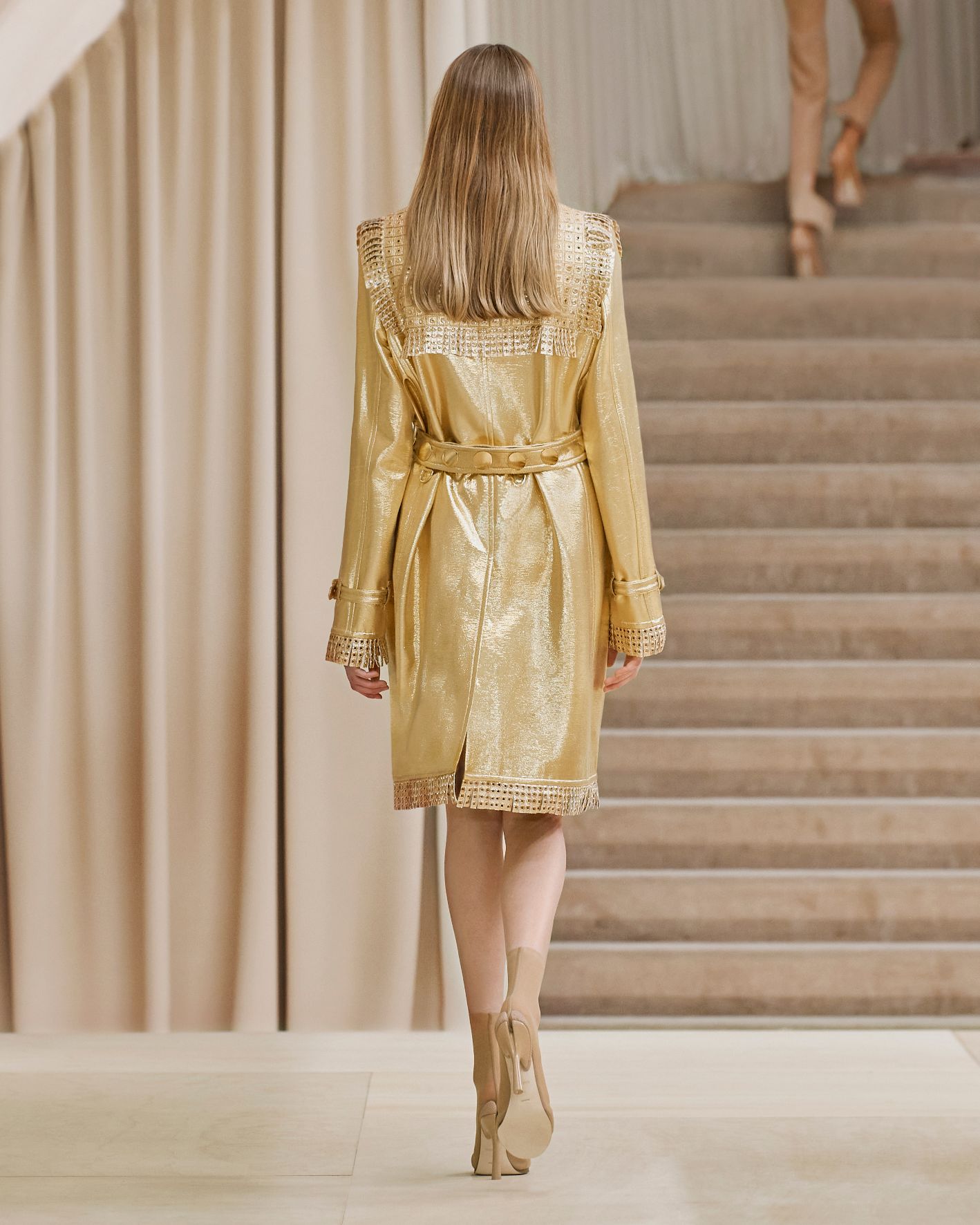 當令人讚嘆的英國藝術家Shygirl以一場詩詞歌頌為時裝發佈會掀開序幕,正好呼應品牌獨有的風格與態度,以創新的角度為現代女性打造經典衣著。這股能量同時展現在動感的電子舞曲之中,與模特兒自信的舞步搭配,展現協調的動感。