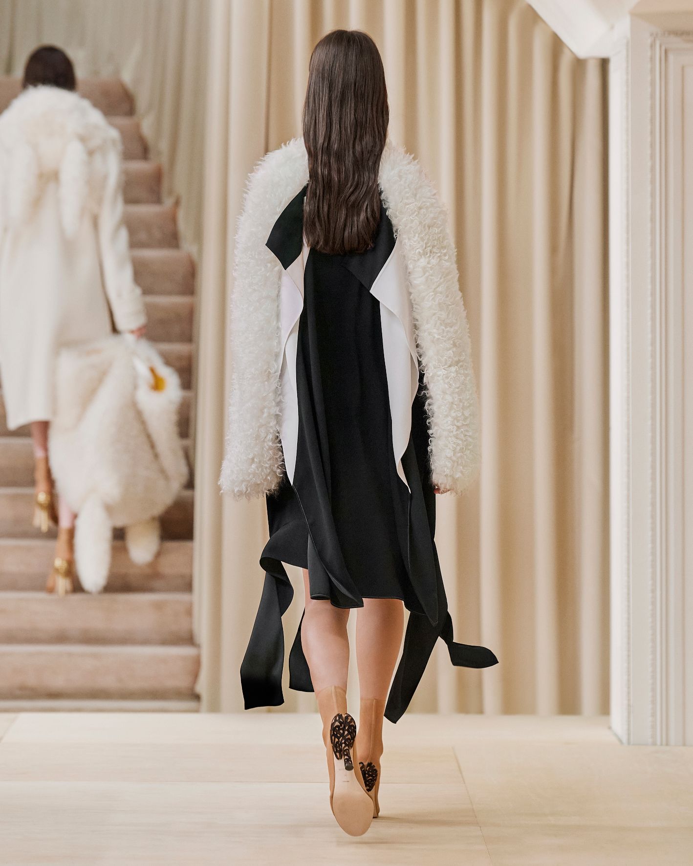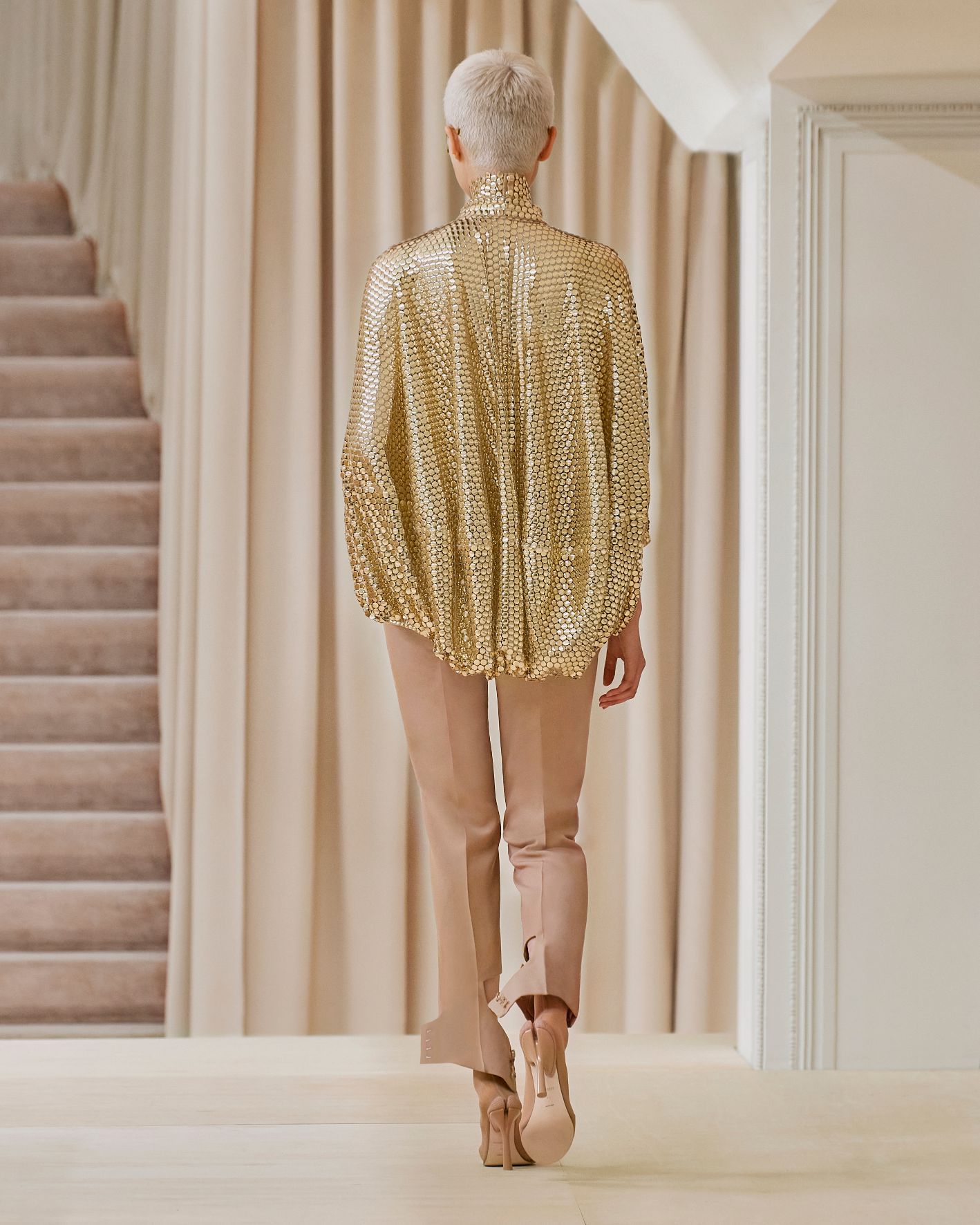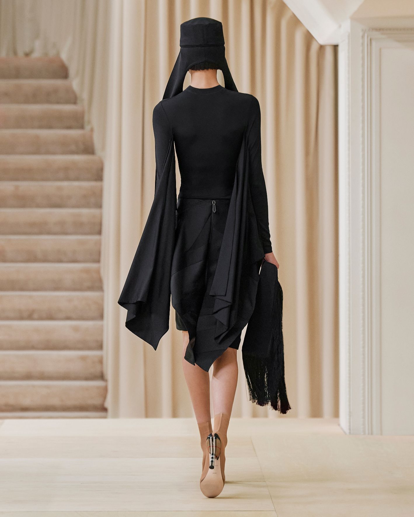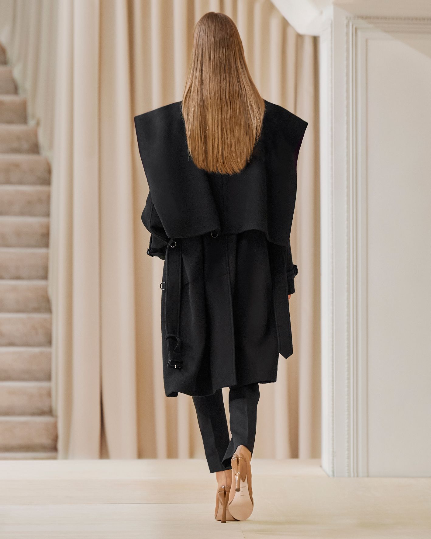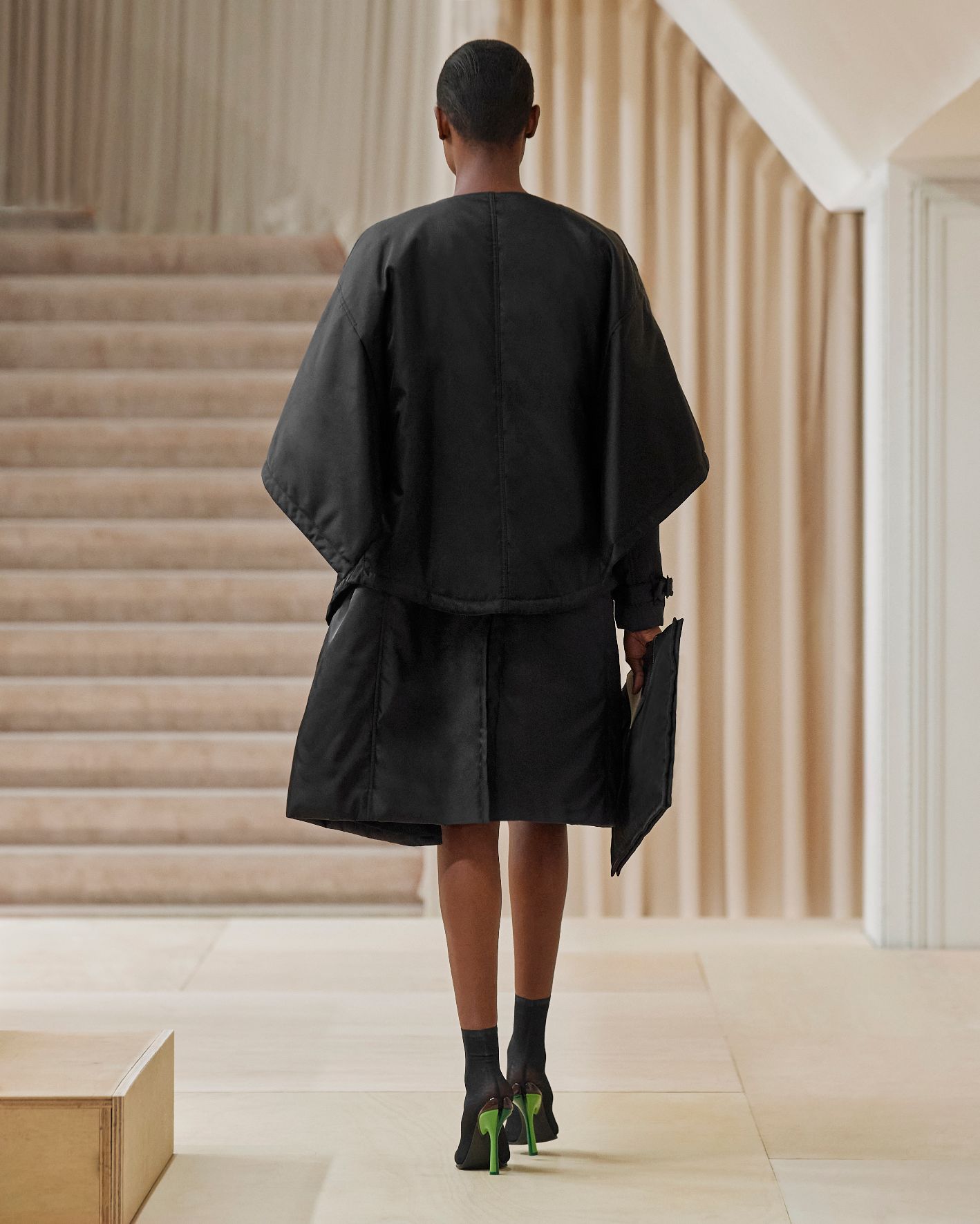 要先了解這次系列的思想,必需先留意同一季度的男裝系列。 Riccardo Tisci 當時以「ESCAPES」為主題,寓意都市人一起逃離都市的煩躁,懷念大自然的美好。然而在女裝系列之中,延續於男裝系列的場景,品牌在倫敦攝政街(Regent Street)121 號旗艦店舉行,這裡曾經是一所有名畫廊,開幕便是以手工藝品為展覽主題;當中店內以米白和深棕色為主調,採用了大量的木材和大理石建造,具有十七世紀建築風格。這次品牌重新佈置展場,沿用原本店內的簡約風格,同時增添大量的木製階梯以及淺米色的布幕,在陝小空間展現無窮想像。如果細心留意的話,這場景一致,猶如男女裝上下部曲的時裝展表達方式,是近年流行的做法,可以達到可持續發展的同時,亦能緊扣男女共穿的中性風潮。