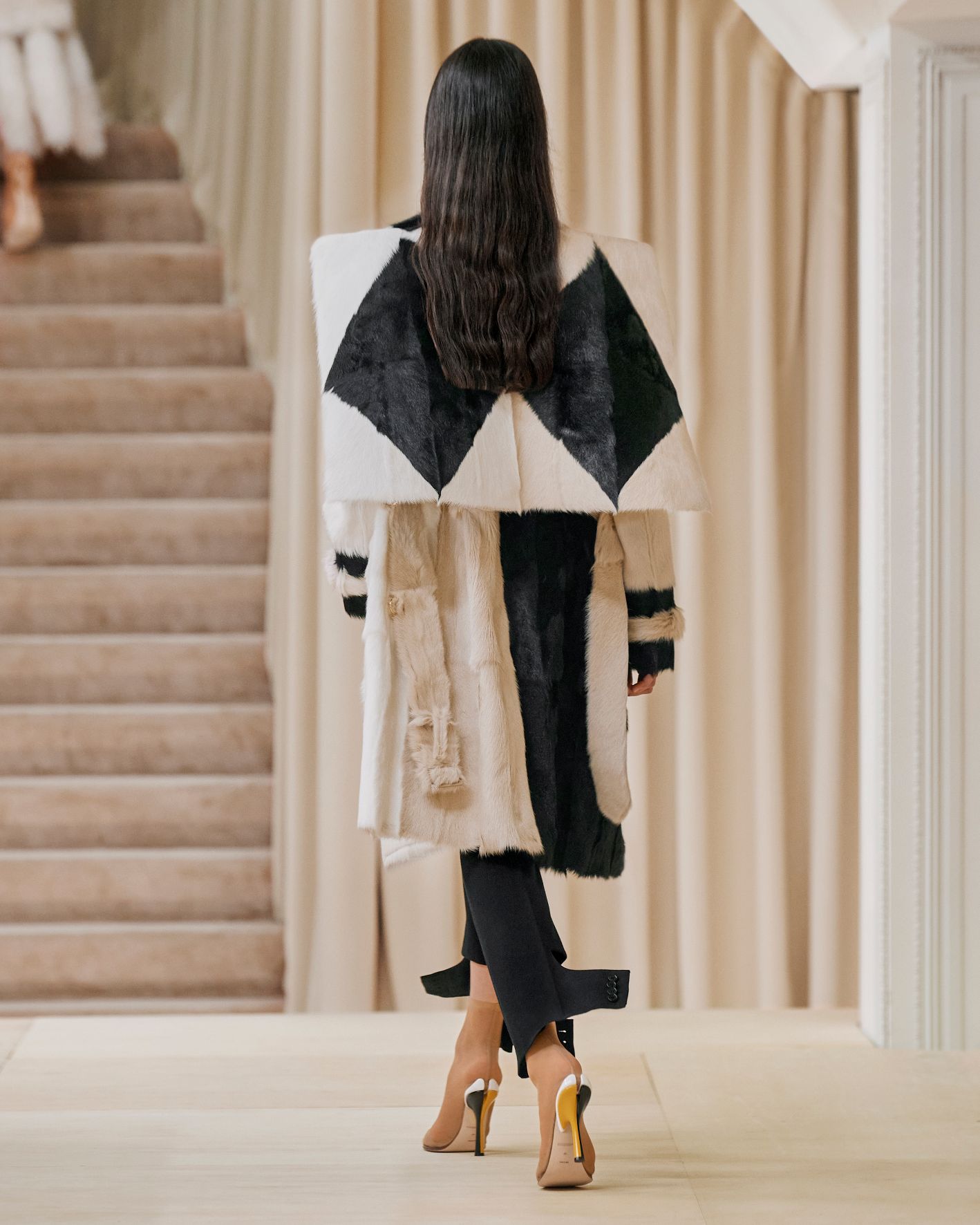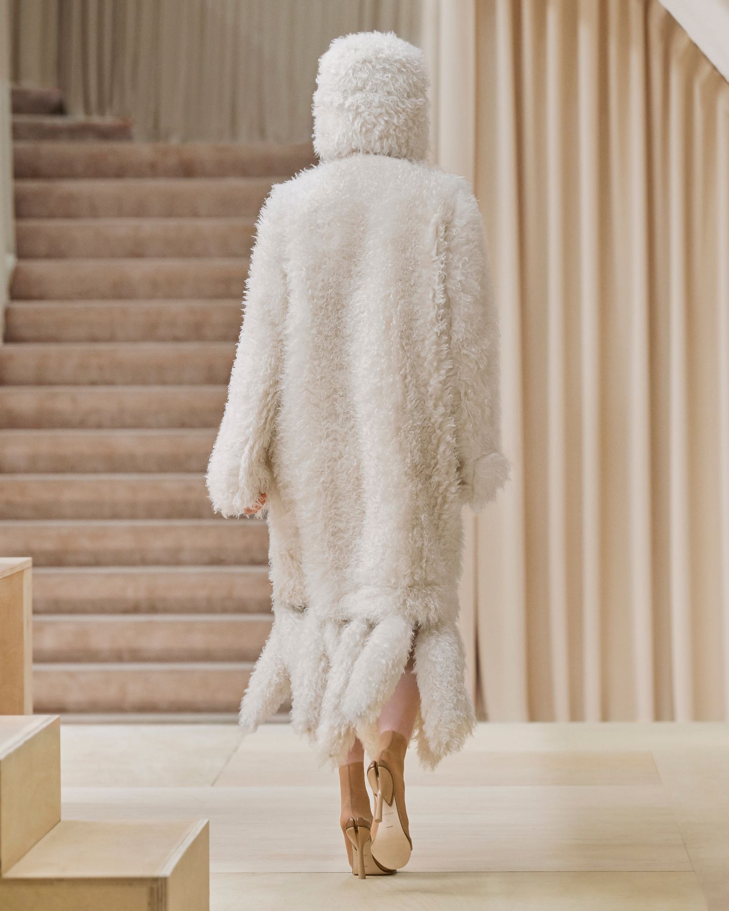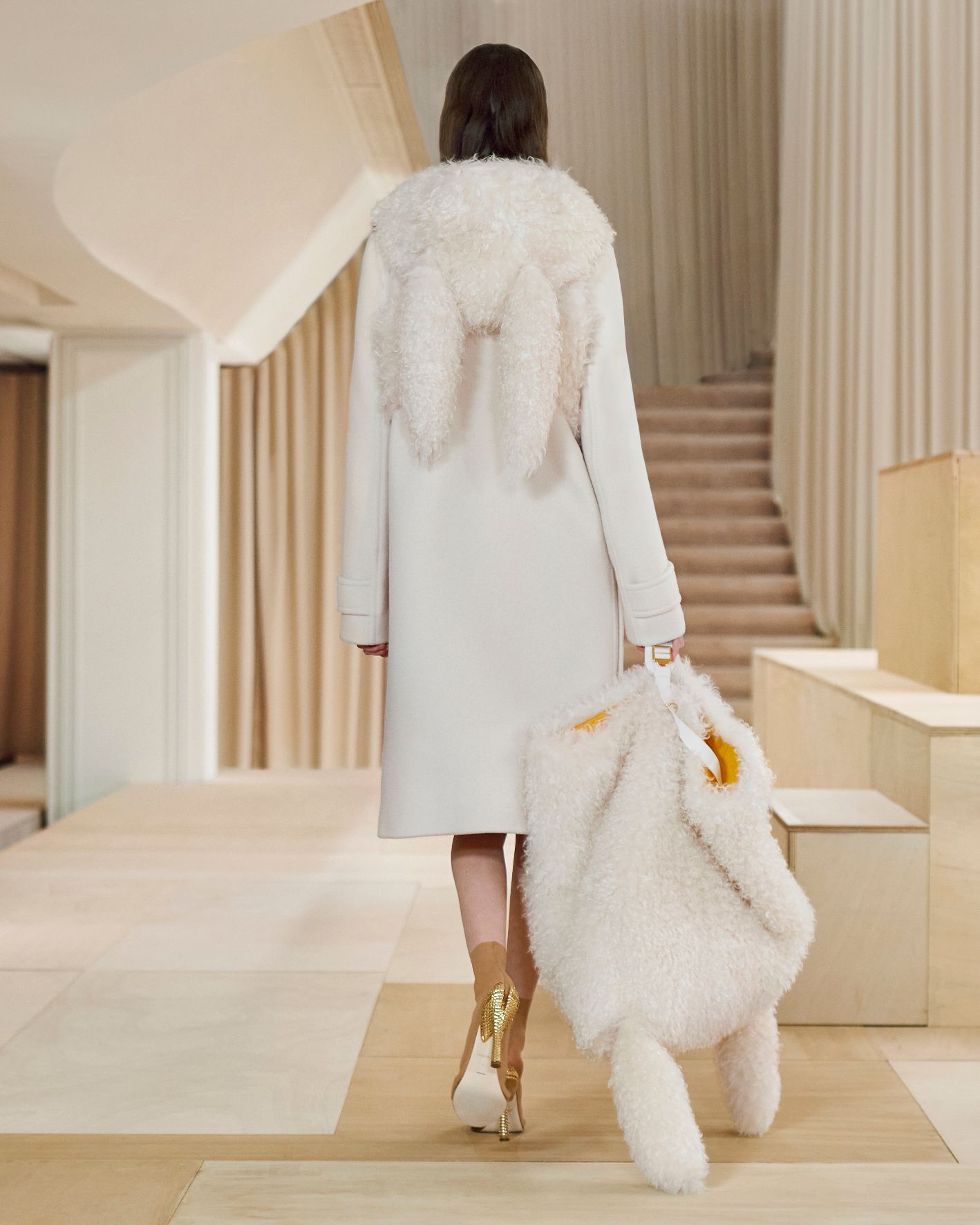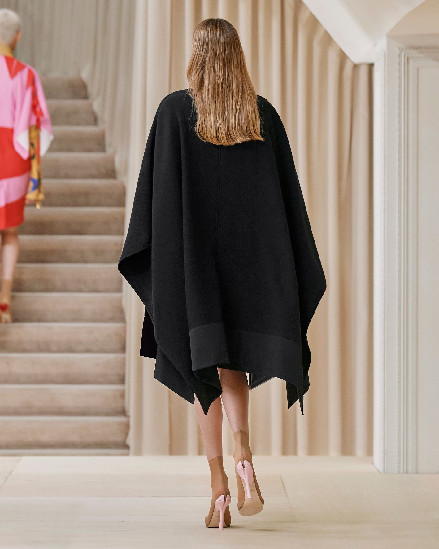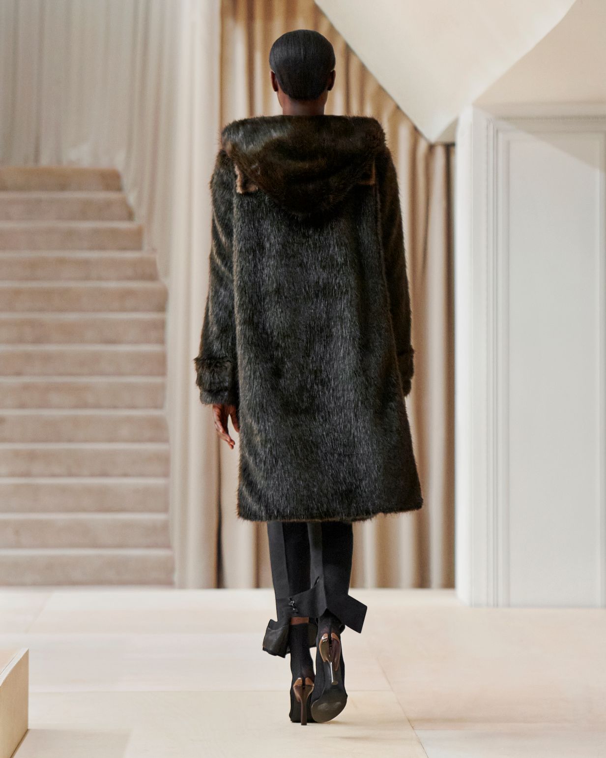 要先了解這次系列的思想,必需先留意同一季度的男裝系列。 Riccardo Tisci 當時以「ESCAPES」為主題,寓意都市人一起逃離都市的煩躁,懷念大自然的美好。然而在女裝系列之中,延續於男裝系列的場景,品牌在倫敦攝政街(Regent Street)121 號旗艦店舉行,這裡曾經是一所有名畫廊,開幕便是以手工藝品為展覽主題;當中店內以米白和深棕色為主調,採用了大量的木材和大理石建造,具有十七世紀建築風格。這次品牌重新佈置展場,沿用原本店內的簡約風格,同時增添大量的木製階梯以及淺米色的布幕,在陝小空間展現無窮想像。如果細心留意的話,這場景一致,猶如男女裝上下部曲的時裝展表達方式,是近年流行的做法,可以達到可持續發展的同時,亦能緊扣男女共穿的中性風潮。