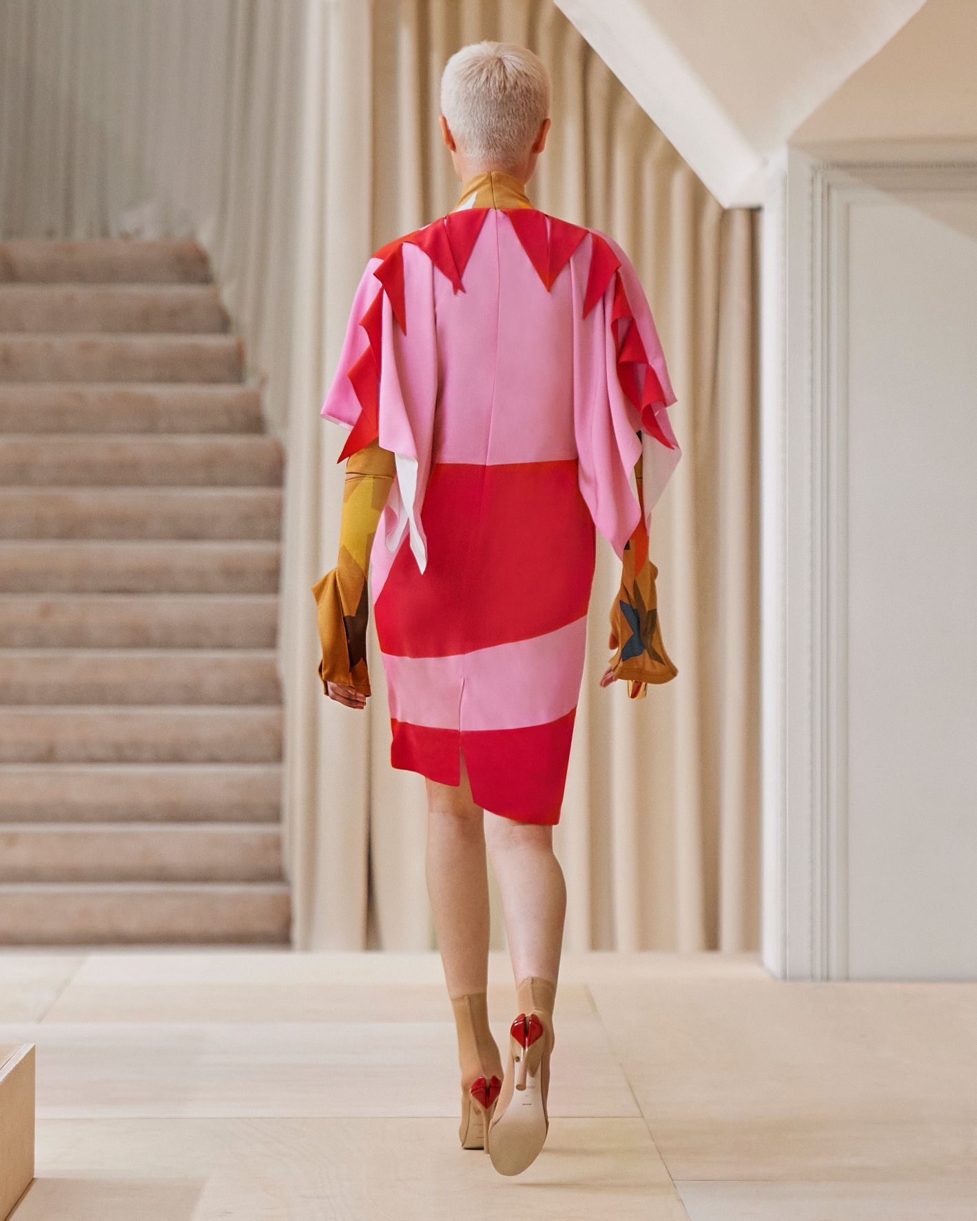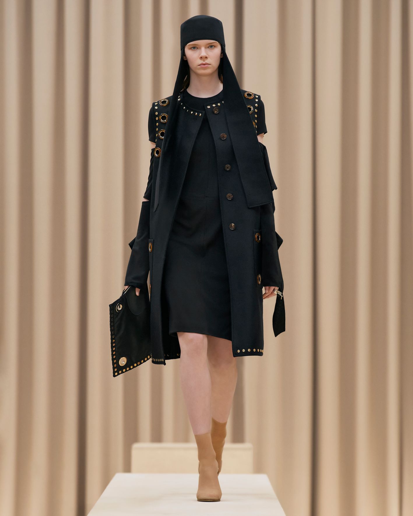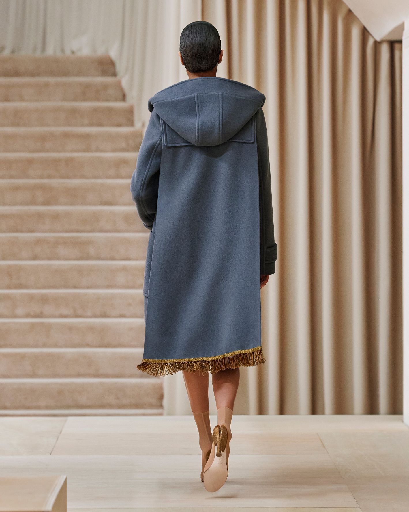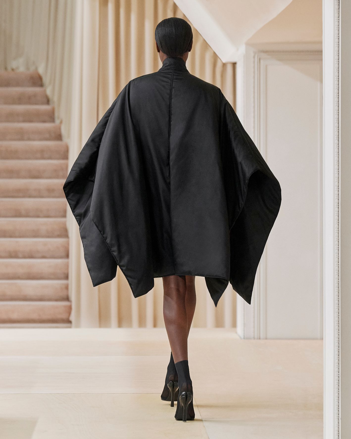 要先了解這次系列的思想,必需先留意同一季度的男裝系列。 Riccardo Tisci 當時以「ESCAPES」為主題,寓意都市人一起逃離都市的煩躁,懷念大自然的美好。然而在女裝系列之中,延續於男裝系列的場景,品牌在倫敦攝政街(Regent Street)121 號旗艦店舉行,這裡曾經是一所有名畫廊,開幕便是以手工藝品為展覽主題;當中店內以米白和深棕色為主調,採用了大量的木材和大理石建造,具有十七世紀建築風格。這次品牌重新佈置展場,沿用原本店內的簡約風格,同時增添大量的木製階梯以及淺米色的布幕,在陝小空間展現無窮想像。如果細心留意的話,這場景一致,猶如男女裝上下部曲的時裝展表達方式,是近年流行的做法,可以達到可持續發展的同時,亦能緊扣男女共穿的中性風潮。