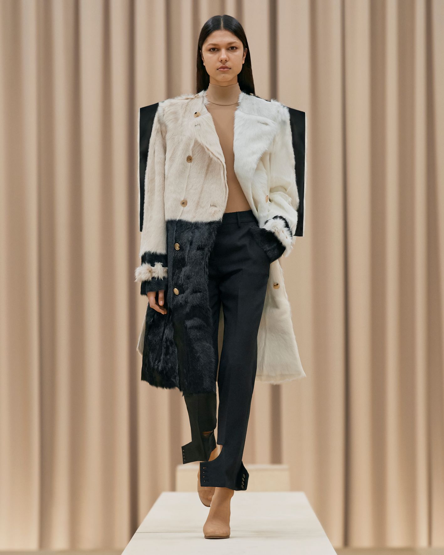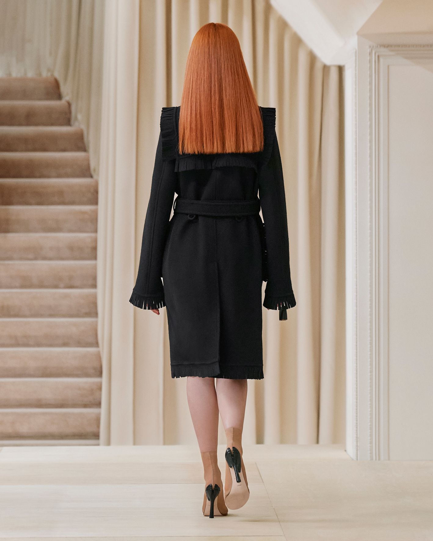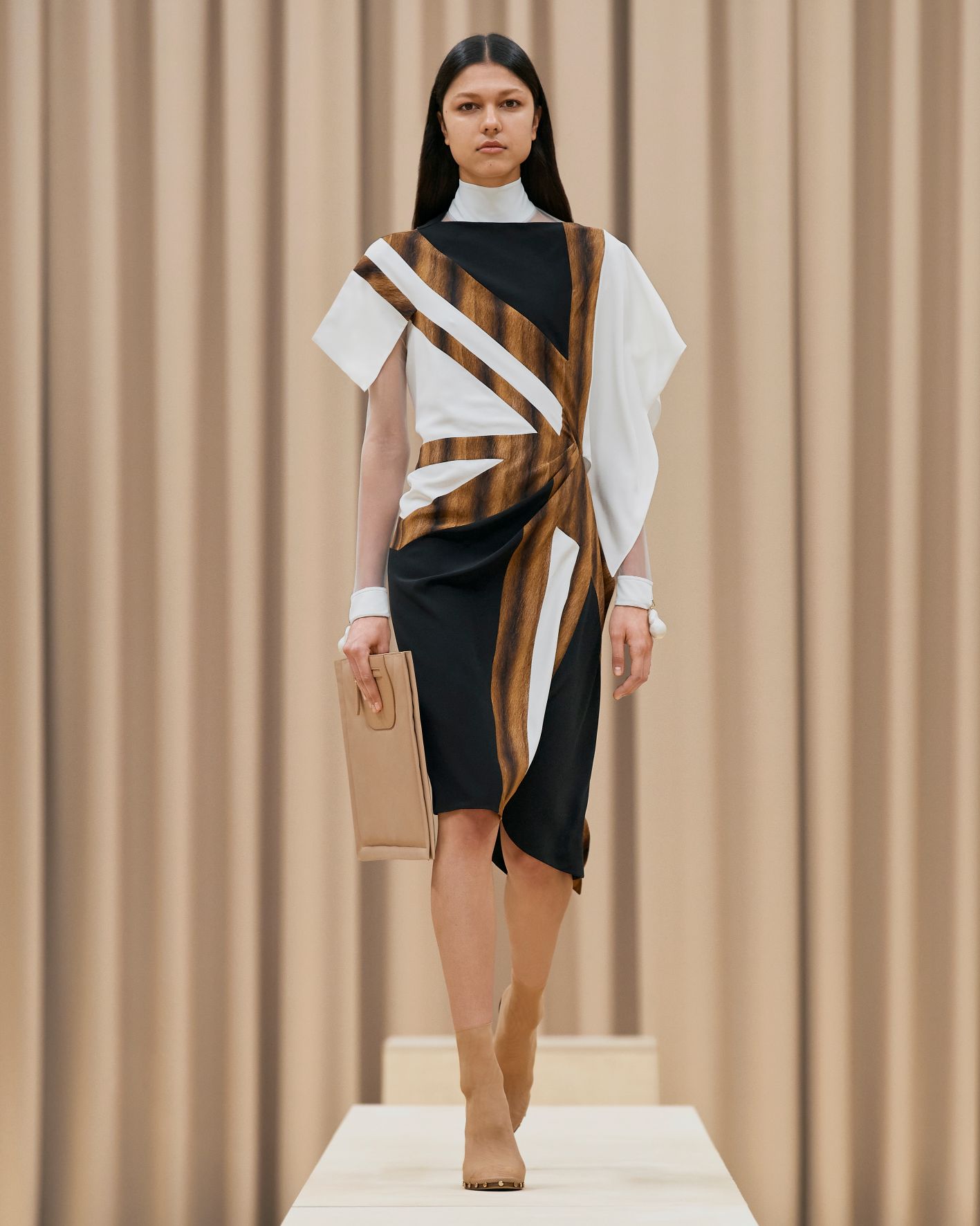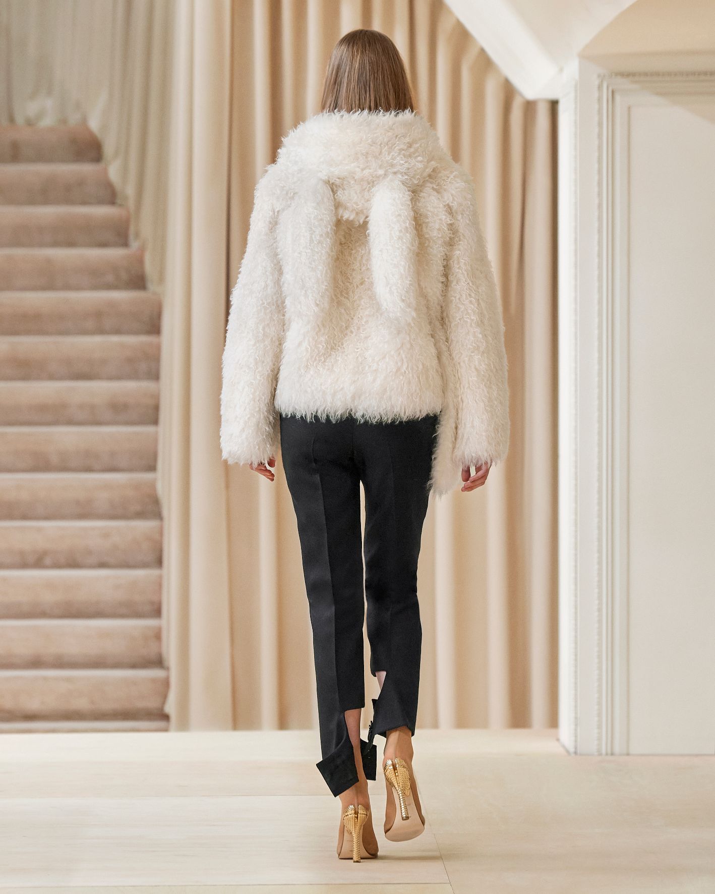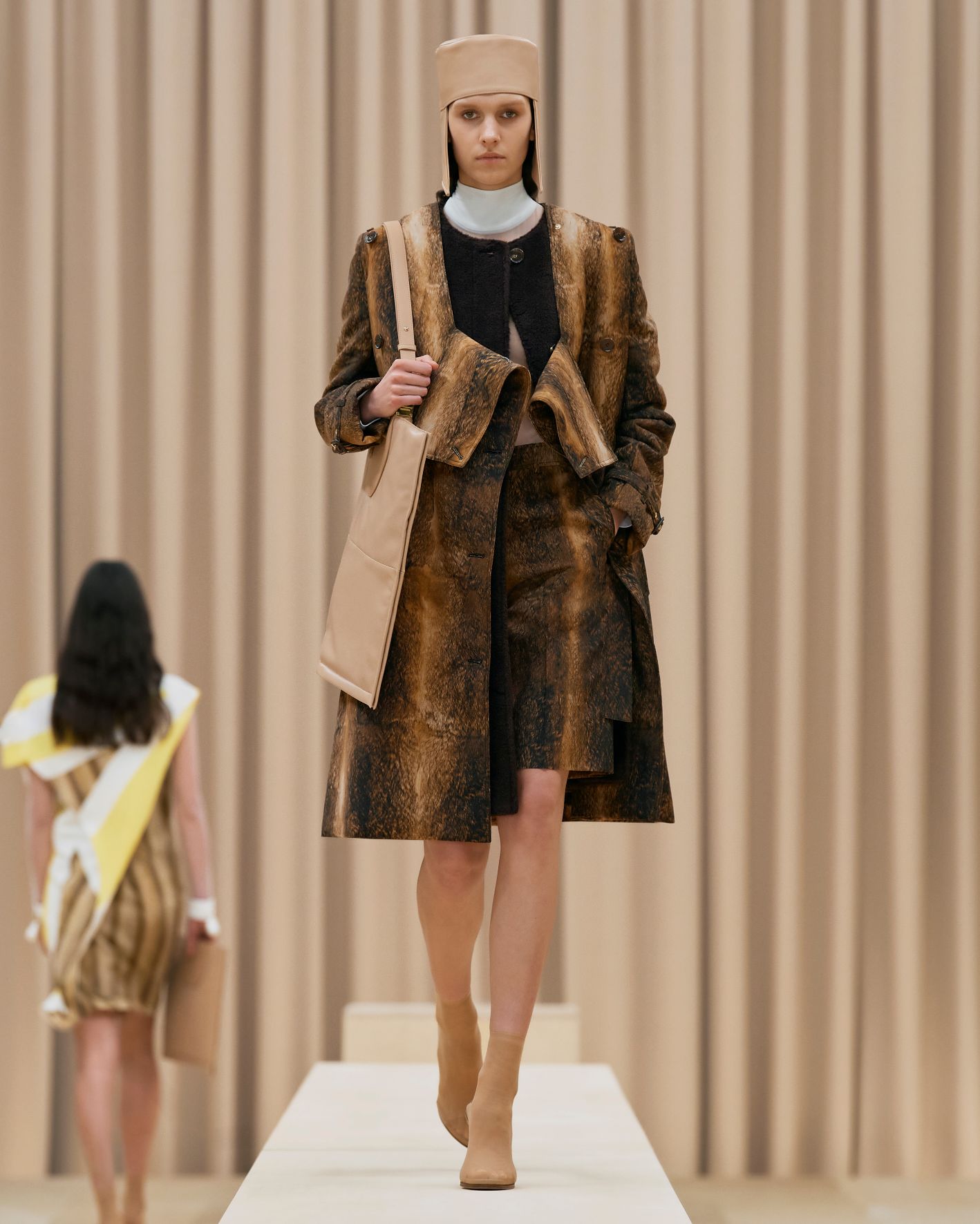 要先了解這次系列的思想,必需先留意同一季度的男裝系列。 Riccardo Tisci 當時以「ESCAPES」為主題,寓意都市人一起逃離都市的煩躁,懷念大自然的美好。然而在女裝系列之中,延續於男裝系列的場景,品牌在倫敦攝政街(Regent Street)121 號旗艦店舉行,這裡曾經是一所有名畫廊,開幕便是以手工藝品為展覽主題;當中店內以米白和深棕色為主調,採用了大量的木材和大理石建造,具有十七世紀建築風格。這次品牌重新佈置展場,沿用原本店內的簡約風格,同時增添大量的木製階梯以及淺米色的布幕,在陝小空間展現無窮想像。如果細心留意的話,這場景一致,猶如男女裝上下部曲的時裝展表達方式,是近年流行的做法,可以達到可持續發展的同時,亦能緊扣男女共穿的中性風潮。