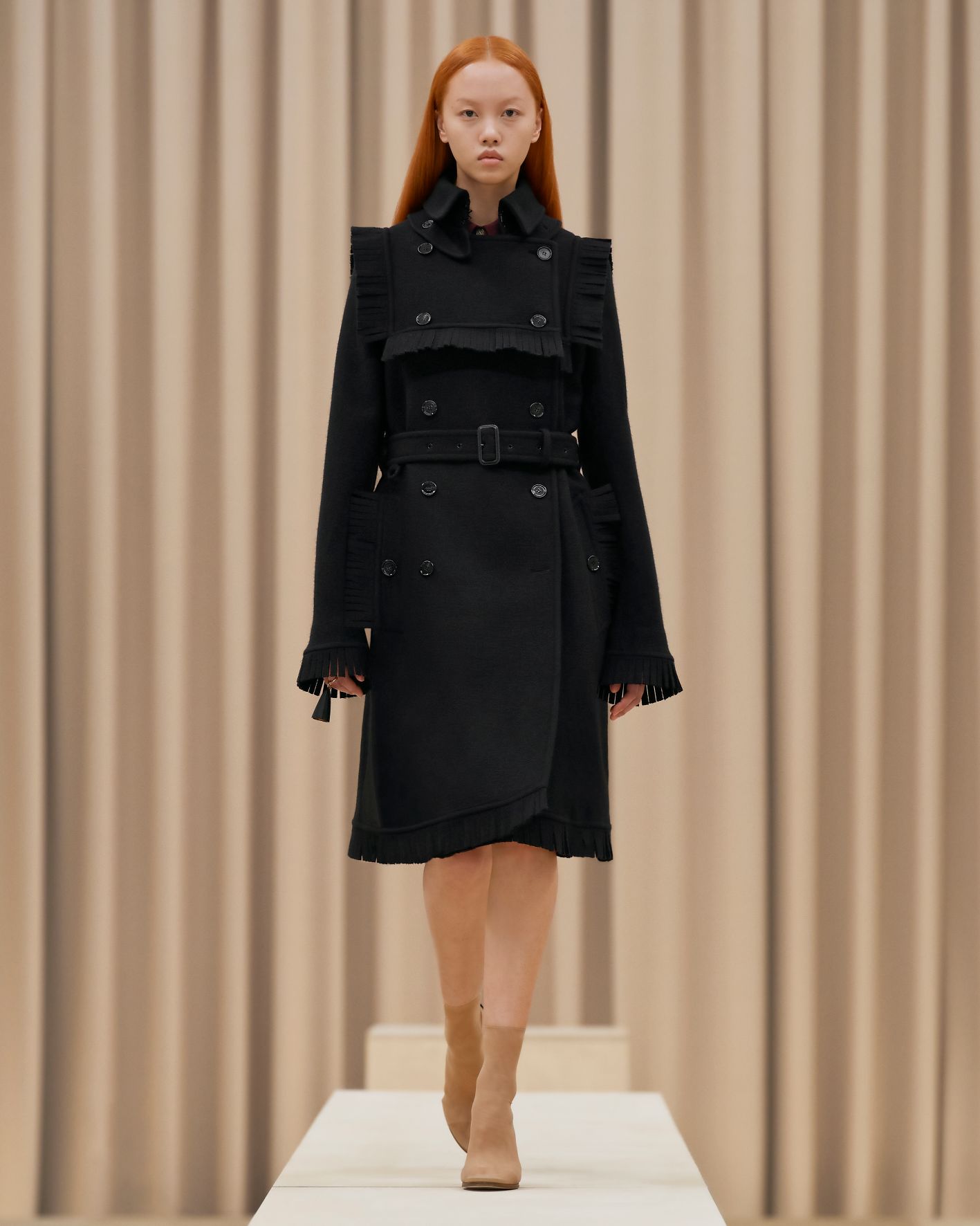 正如上文所言,本季延續Burberry 秋冬男裝發佈會的主題靈感,女裝系列致敬了大自然母親的堅毅力量以及20世紀初受到廣泛使用的英國手工藝和戶外運動。該系列中搖曳擺動的披肩和旗幟圖案的引用,都是向那些敢於冒險,探索大自然的前人致意,他們打破了常規,努力建立更美好的未來。雨中一抹彩虹出其不意的亮光灑耀,整個系列展現面對未來的樂觀展望。Riccardo Tisci 顯然為Burberry對現代女性氣質和男性剛毅的探索展開新階段,凸顯該系列大膽創新和機會塑造的特色。