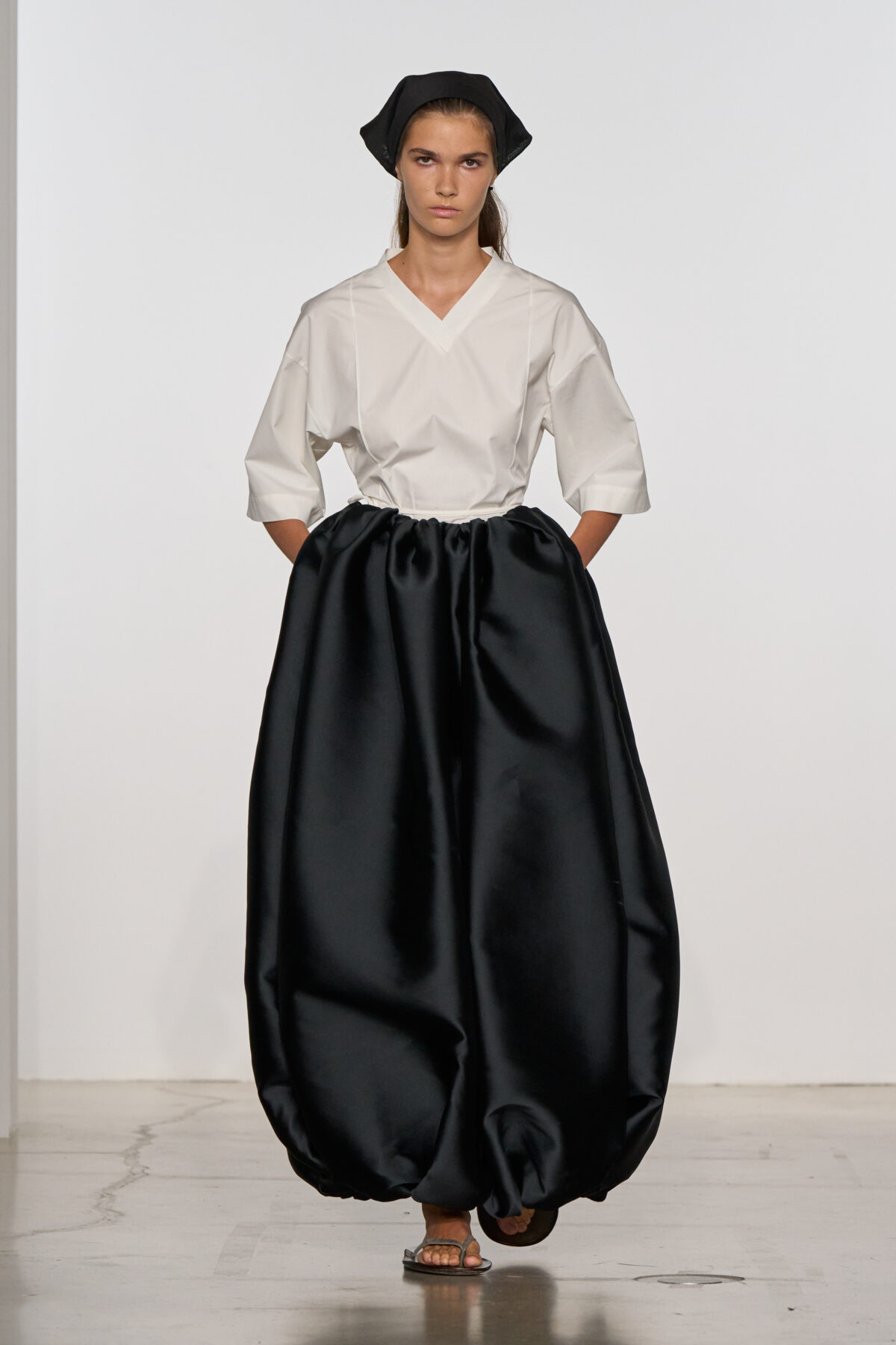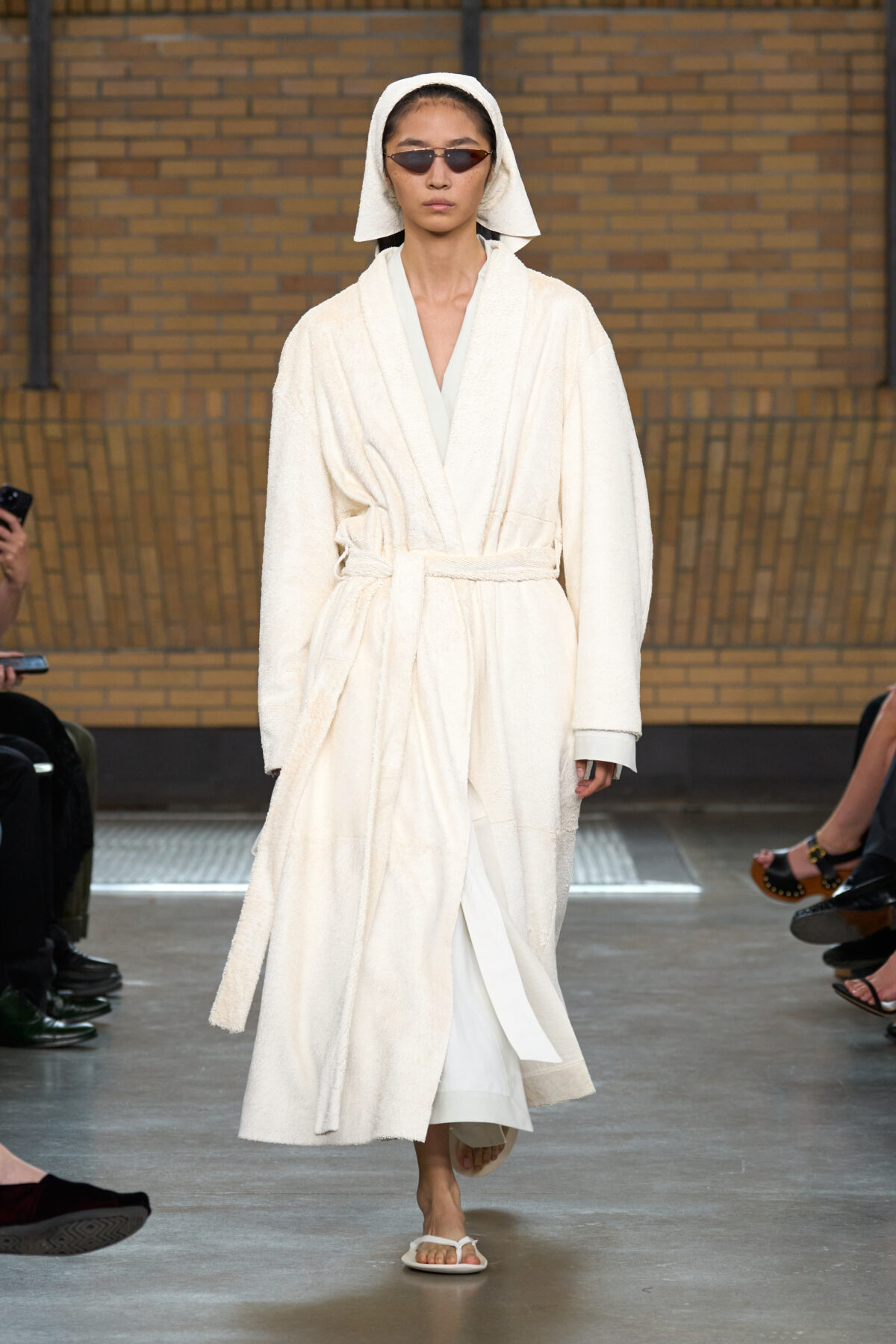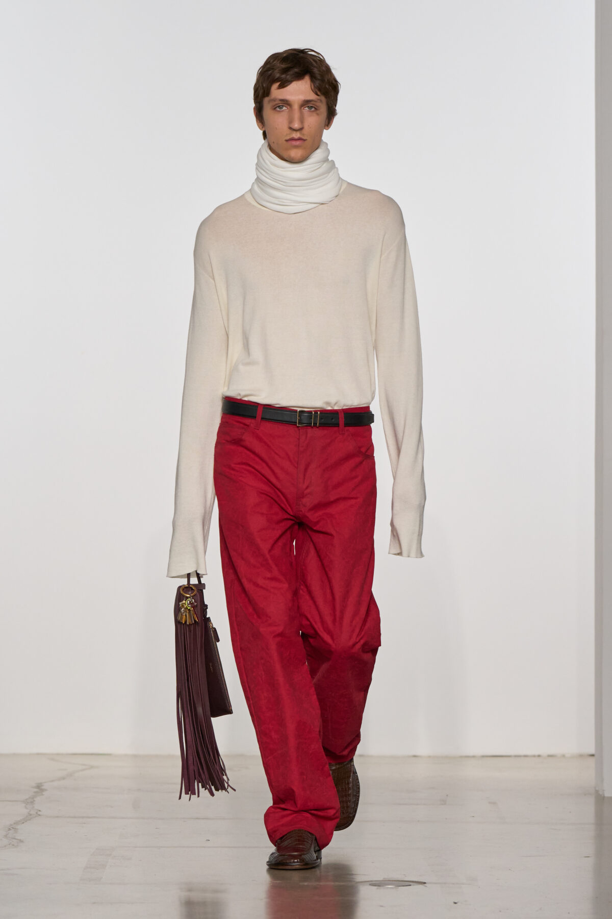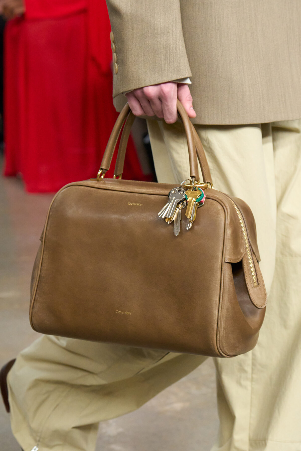 Leoni 於紐約東村 Brant Foundation 藝術基金會發布上任後的第二個系列,可看出她持續觀察紐約本地人與他們清晨前往雜貨店買咖啡的日常。模特兒手握鑰匙圈,他們握住的手提袋邊緣甚至刻意做出使用過的磨痕。一位男模在 Oversized 外套下穿著 Calvin Klein 標誌內褲(呼應他所搭配的間條恤衫和領帶),一位女模則穿著設有 Y 型前襠的連體長褲——既是向 Klein 極具挑釁意味的經典內衣廣告致意,也讓人想到當代對瑜伽褲的痴迷。Mariacarla Boscono 所穿著的間條毛巾布長袍,實際上是以精細雷射切割皮革製成,充滿夢幻氛圍。