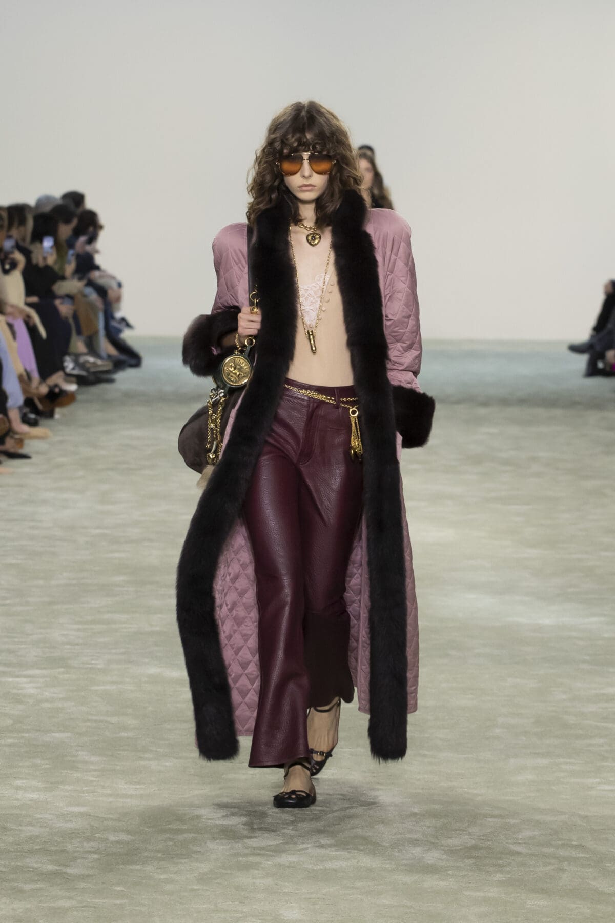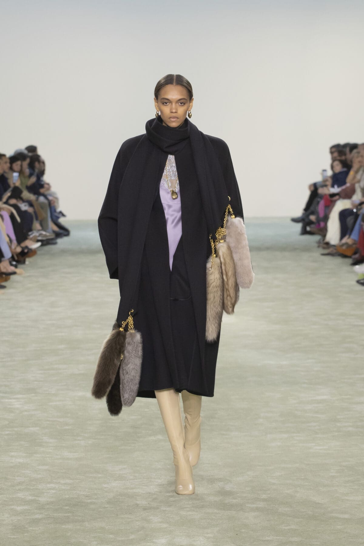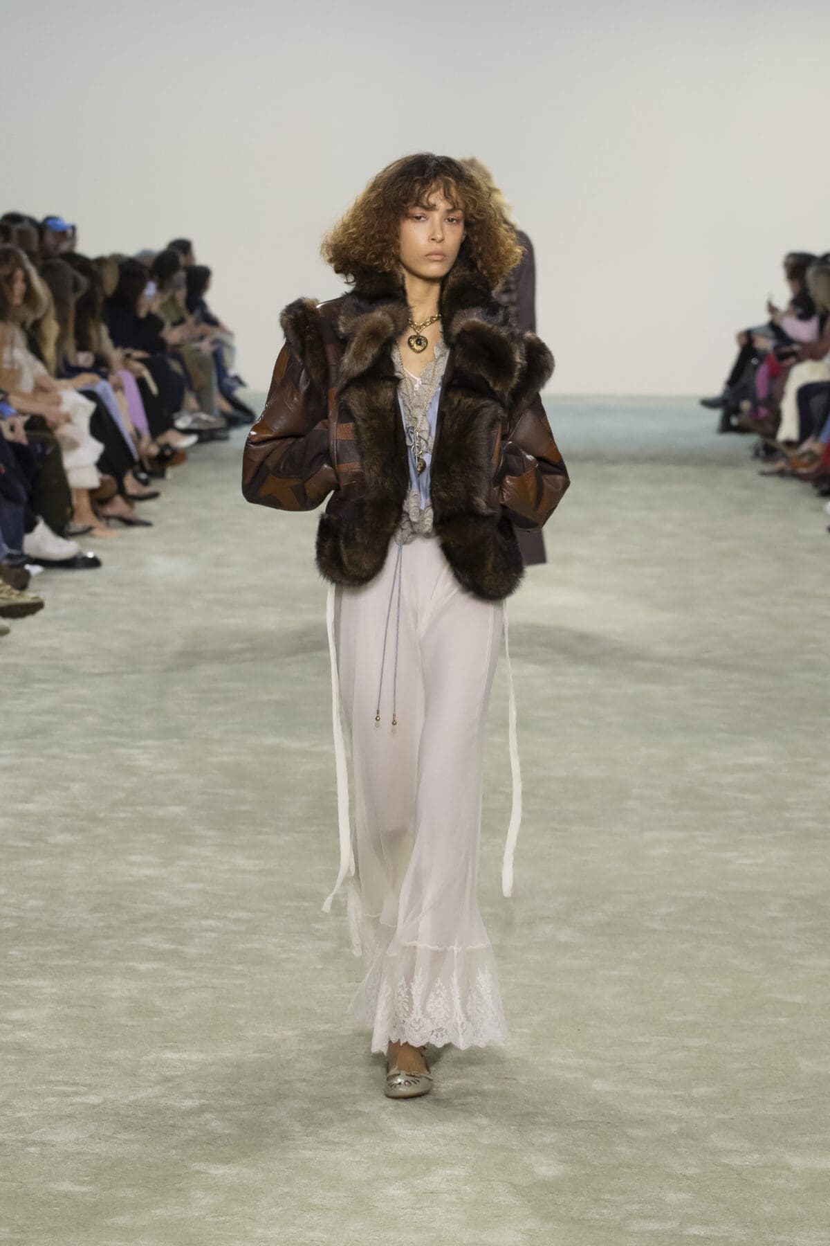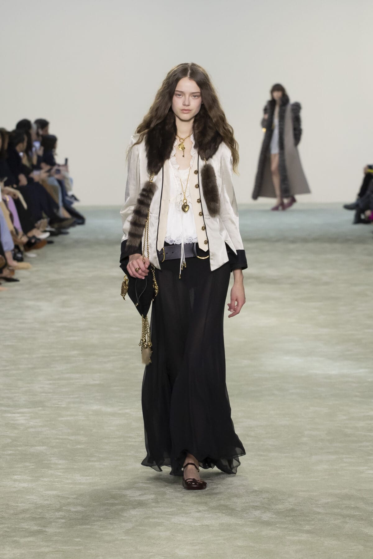 Chemena Kamali巧妙結合了柔滑的絲綢、輕盈的雪紡與溫暖的羽絨,展現出材質之間的對話感:柔美與實用並存,奢華與樸素相融。尤其是仿皮草飾邊的皮革外套,以其誇張的輪廓和觸感,將力量與溫暖感完美結合。