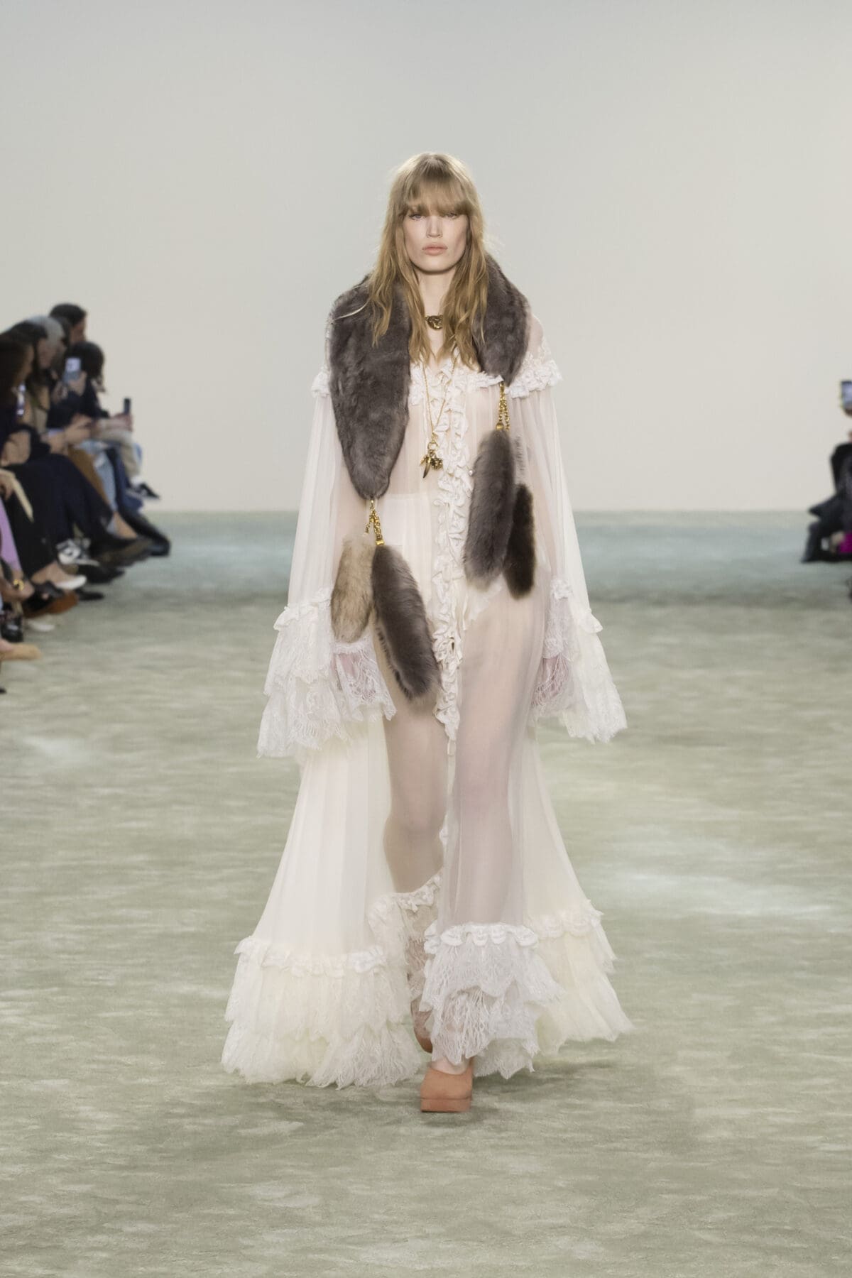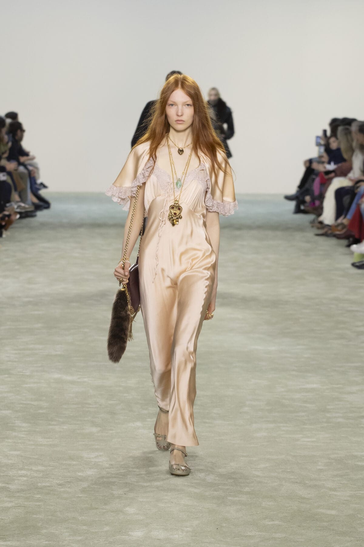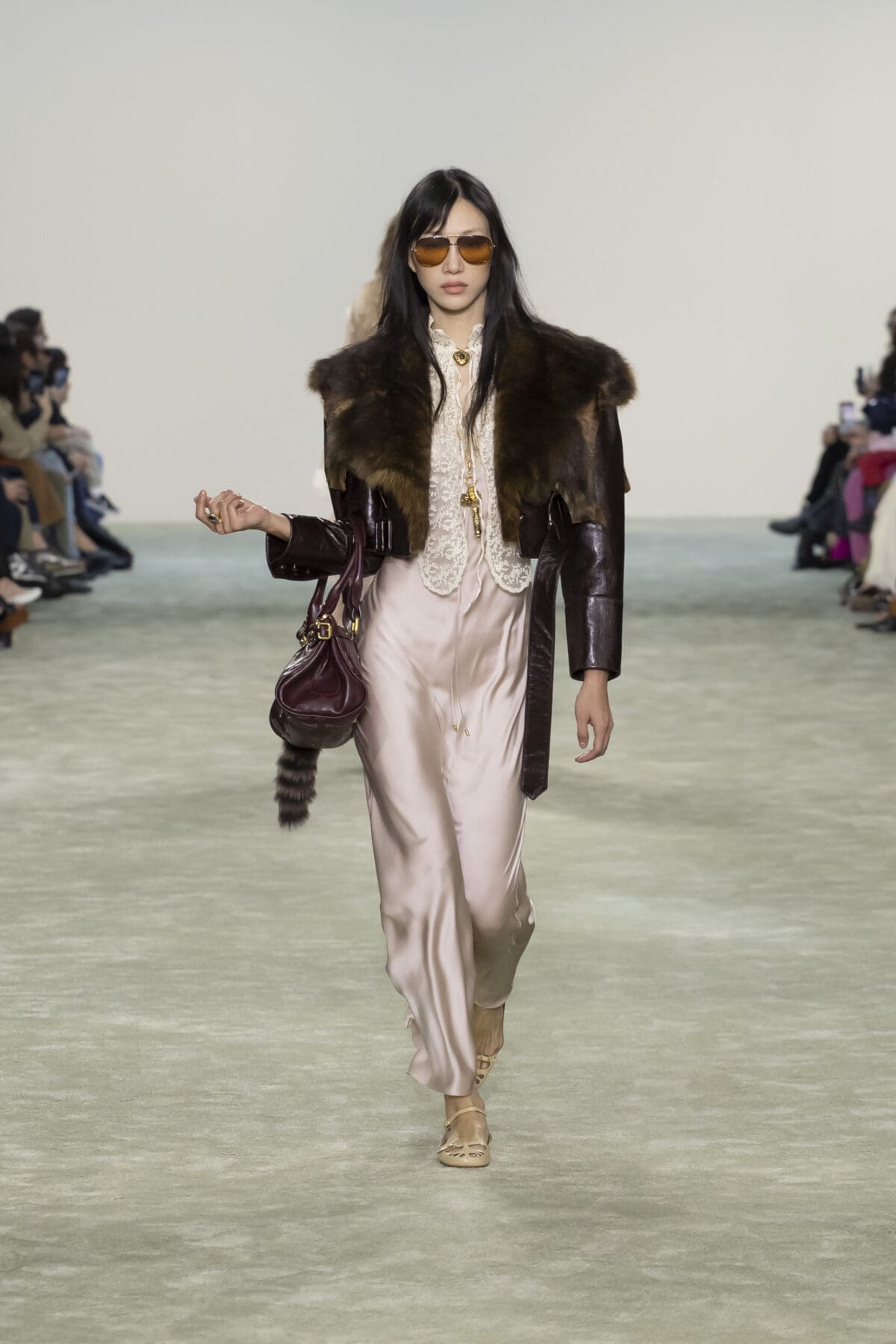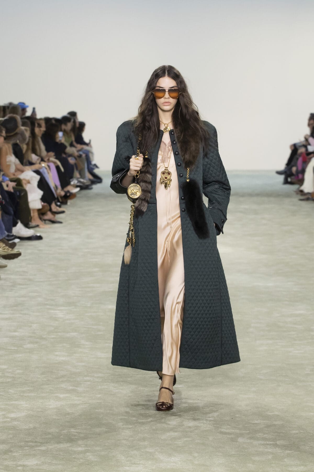 Chemena Kamali巧妙結合了柔滑的絲綢、輕盈的雪紡與溫暖的羽絨,展現出材質之間的對話感:柔美與實用並存,奢華與樸素相融。尤其是仿皮草飾邊的皮革外套,以其誇張的輪廓和觸感,將力量與溫暖感完美結合。