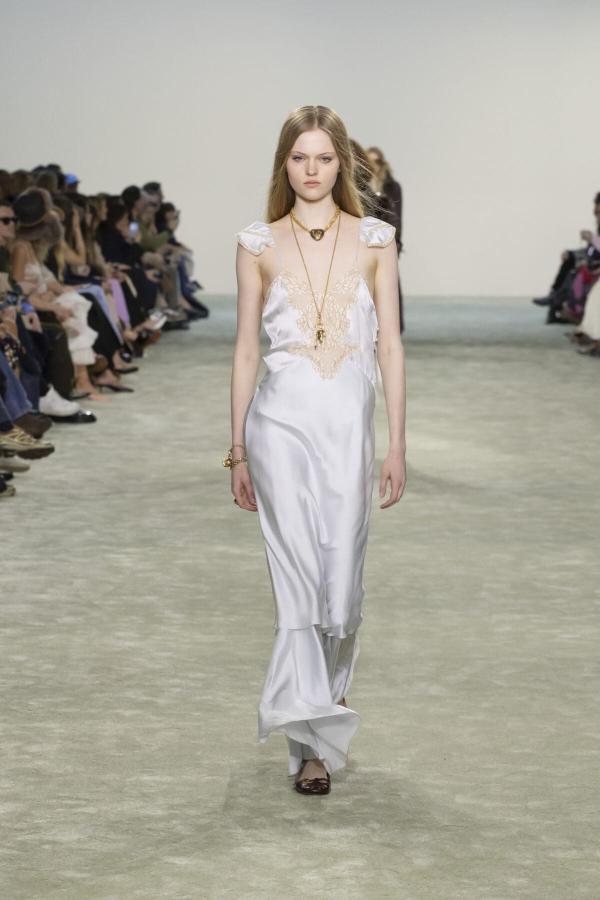 本季以中性色為主調,融入淺藍、覆盆子紅、玫瑰粉與綠松石等柔和色調,打造出詩意而現代的情感氛圍。這些色彩在雪紡與喱士中顯得尤為輕盈,而當它們出現在皮革與羽絨的單品上時,則增添了一絲叛逆的張力。這種色彩對比反映了Chloé女性的內心世界——溫柔但不妥協,自由且果敢。