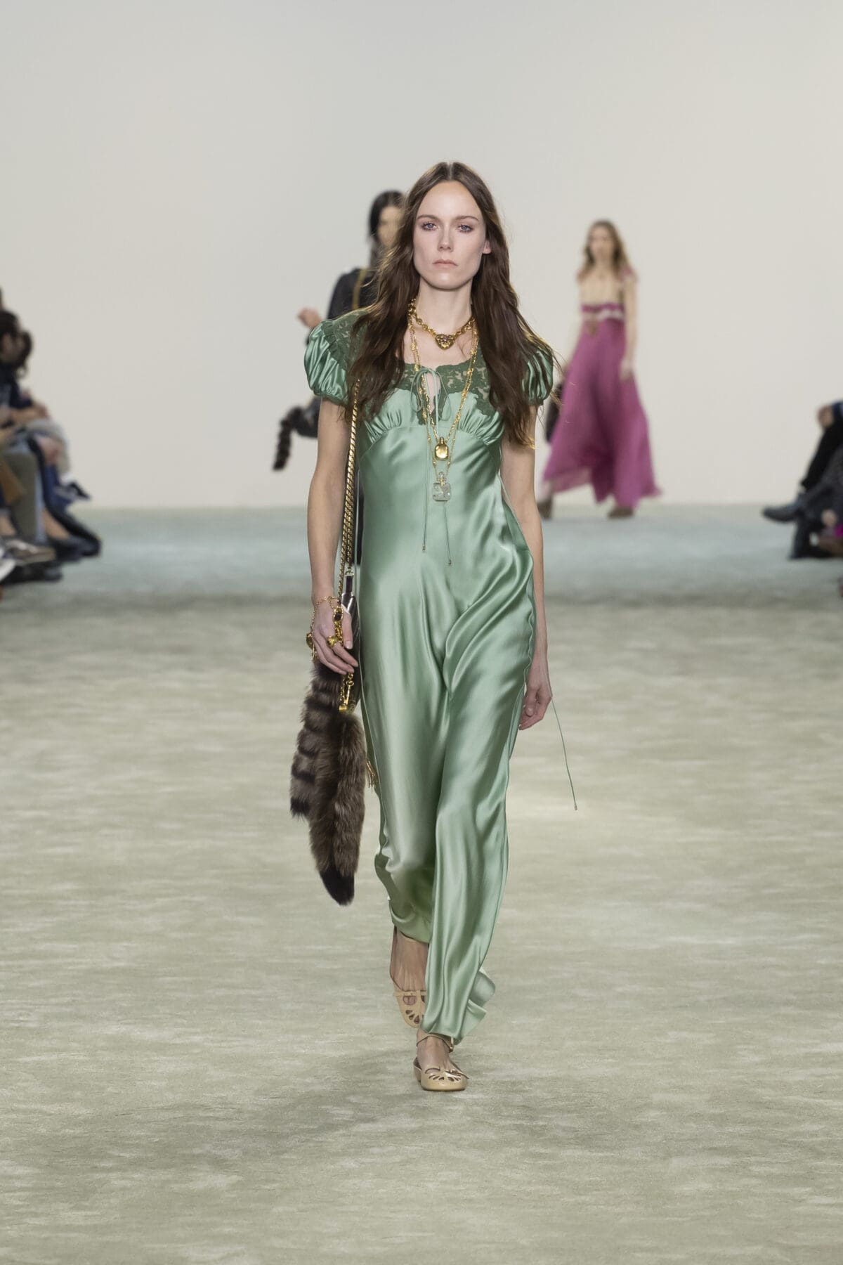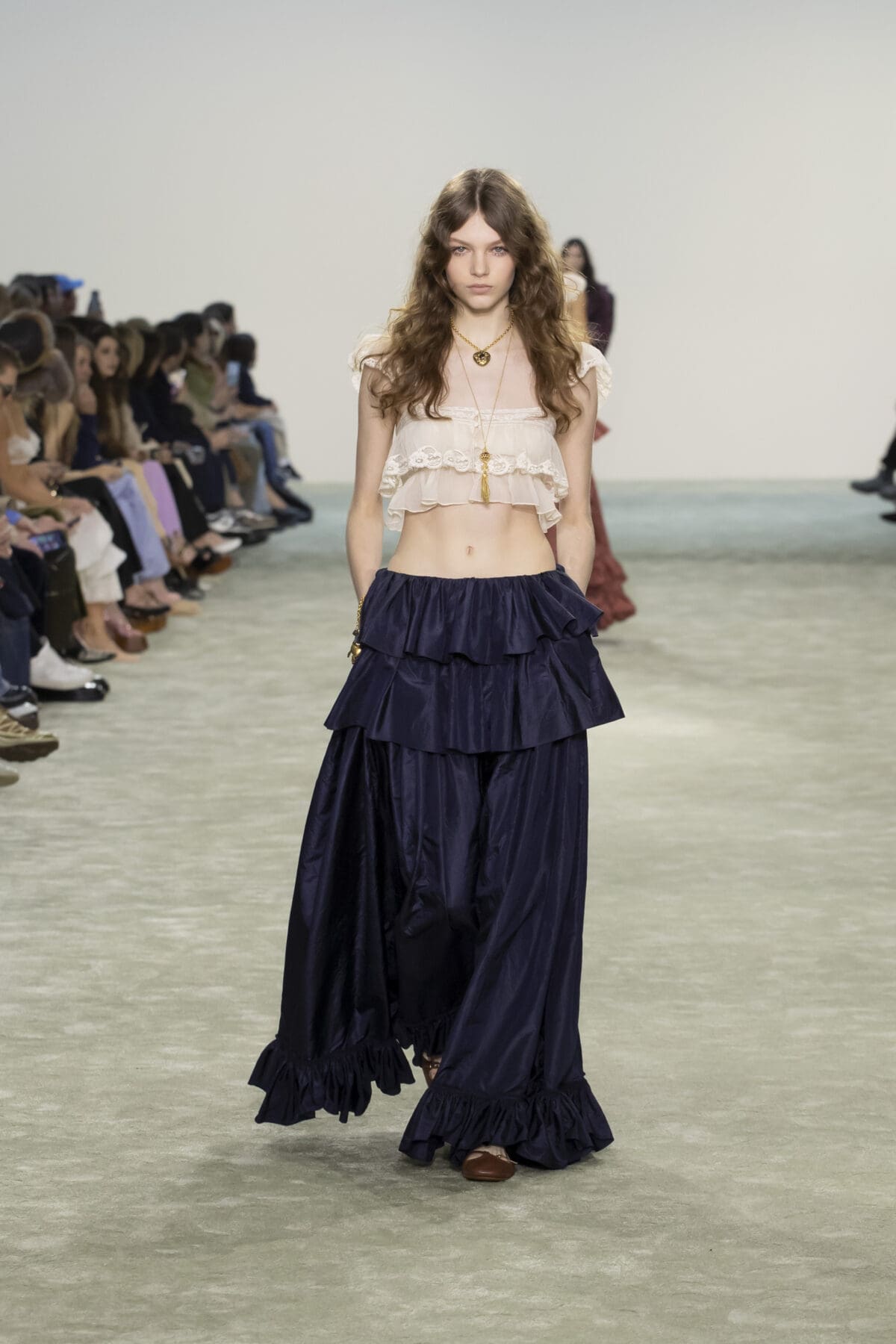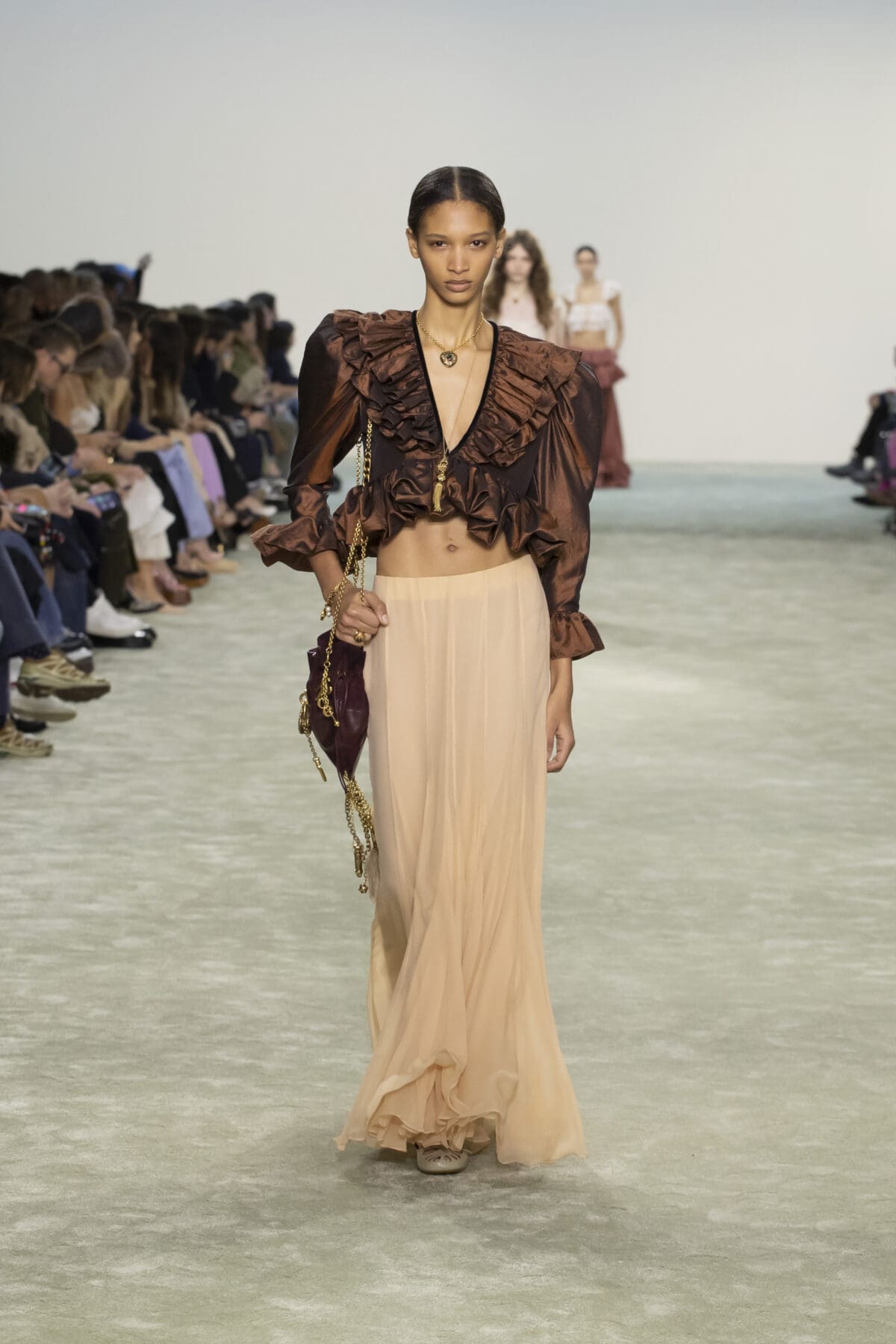 她從1970年代Karl Lagerfeld時期的波希米亞風格中汲取靈感,並結合了1980年代的結構性設計語言,打造出一系列既柔美又充滿力量的單品。Chemena Kamali特別強調了「復古睡衣」風格的浪漫,將飄逸的雪紡和喱士融入裙裝設計中,展現女性細膩且輕盈的一面。而這些歷史元素並未停留於懷舊,而是通過結構的重塑與材質的選擇,賦予服裝以現代的實穿性與時尚張力。
