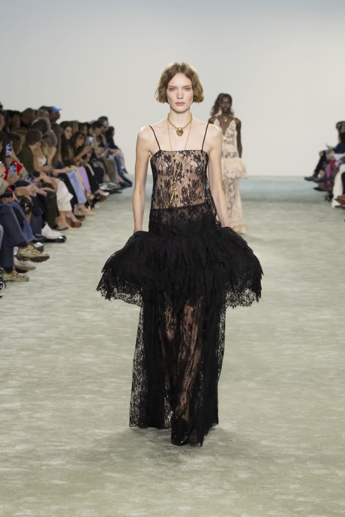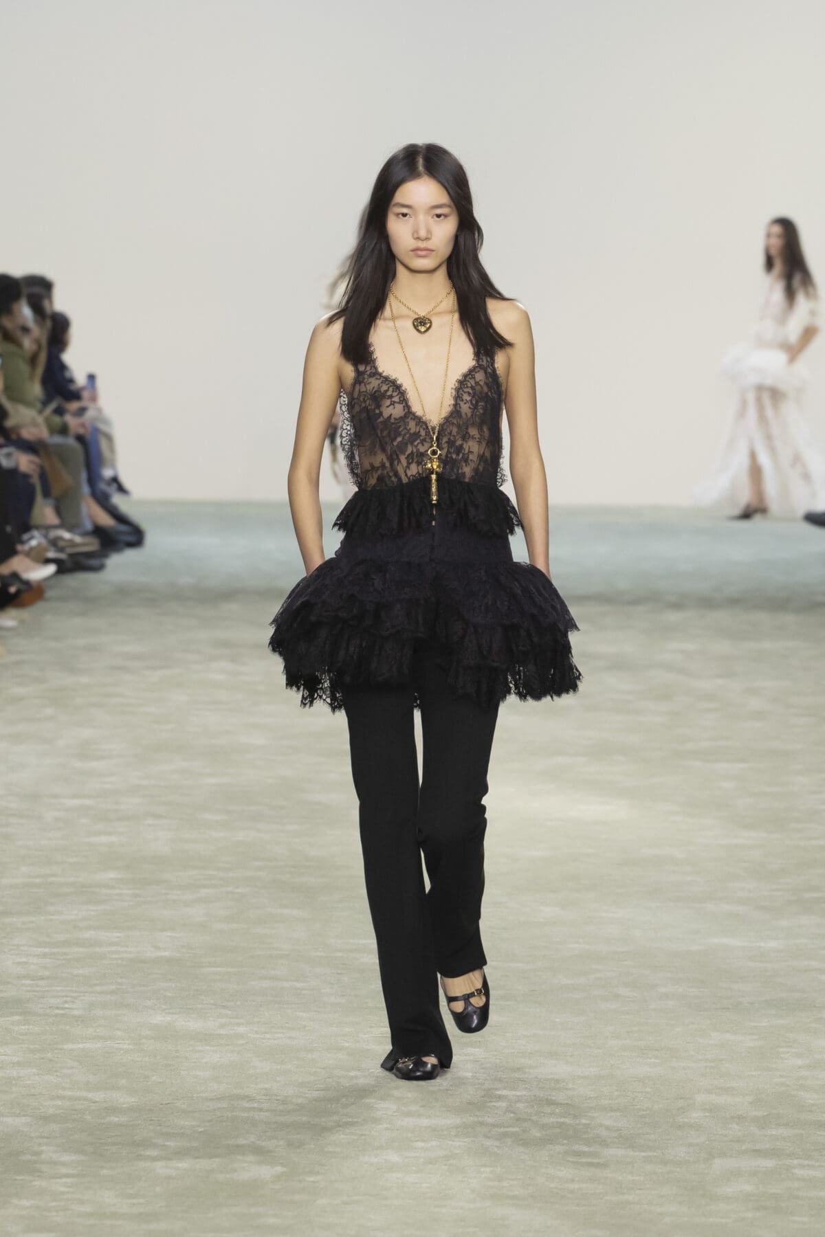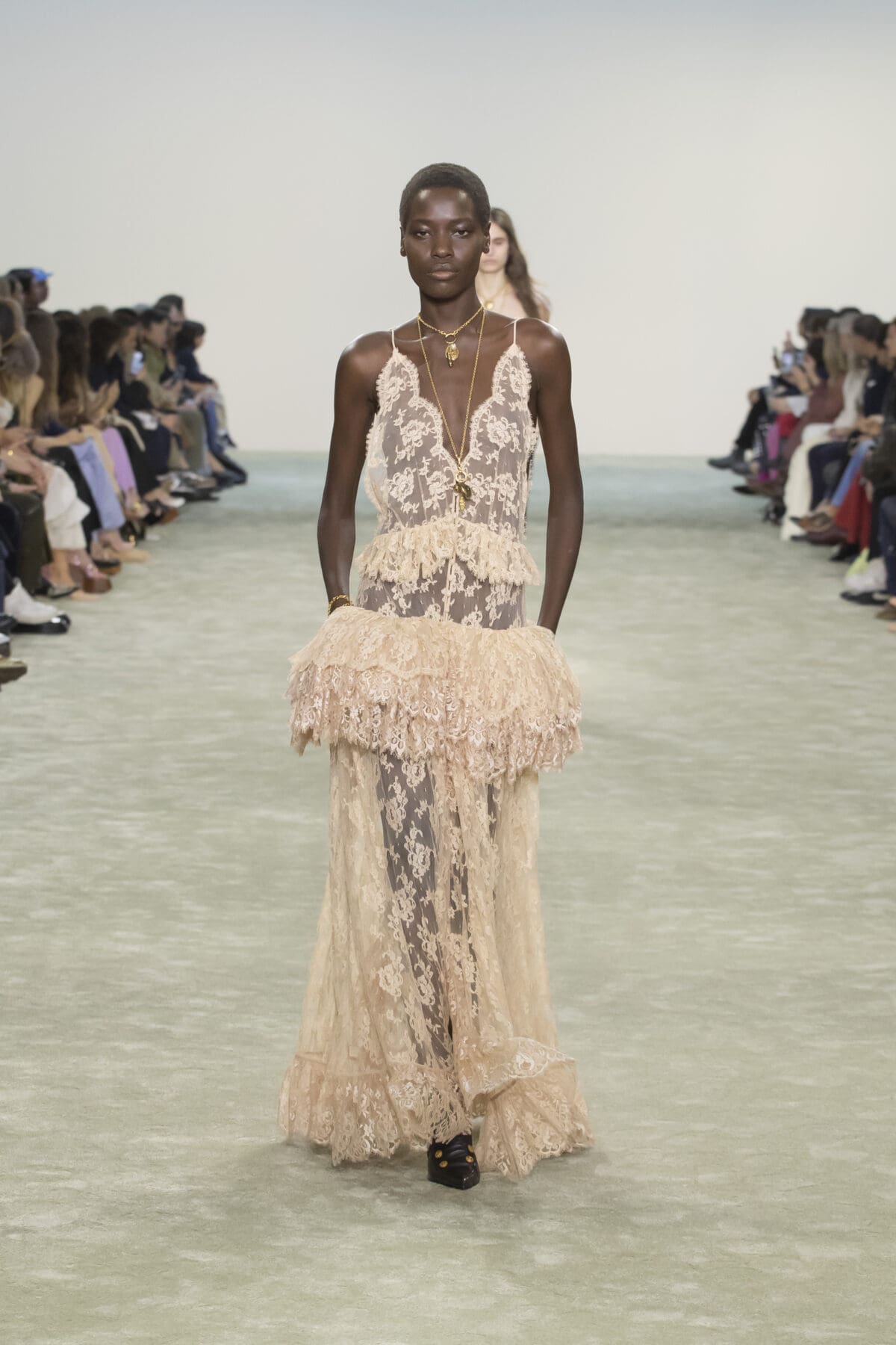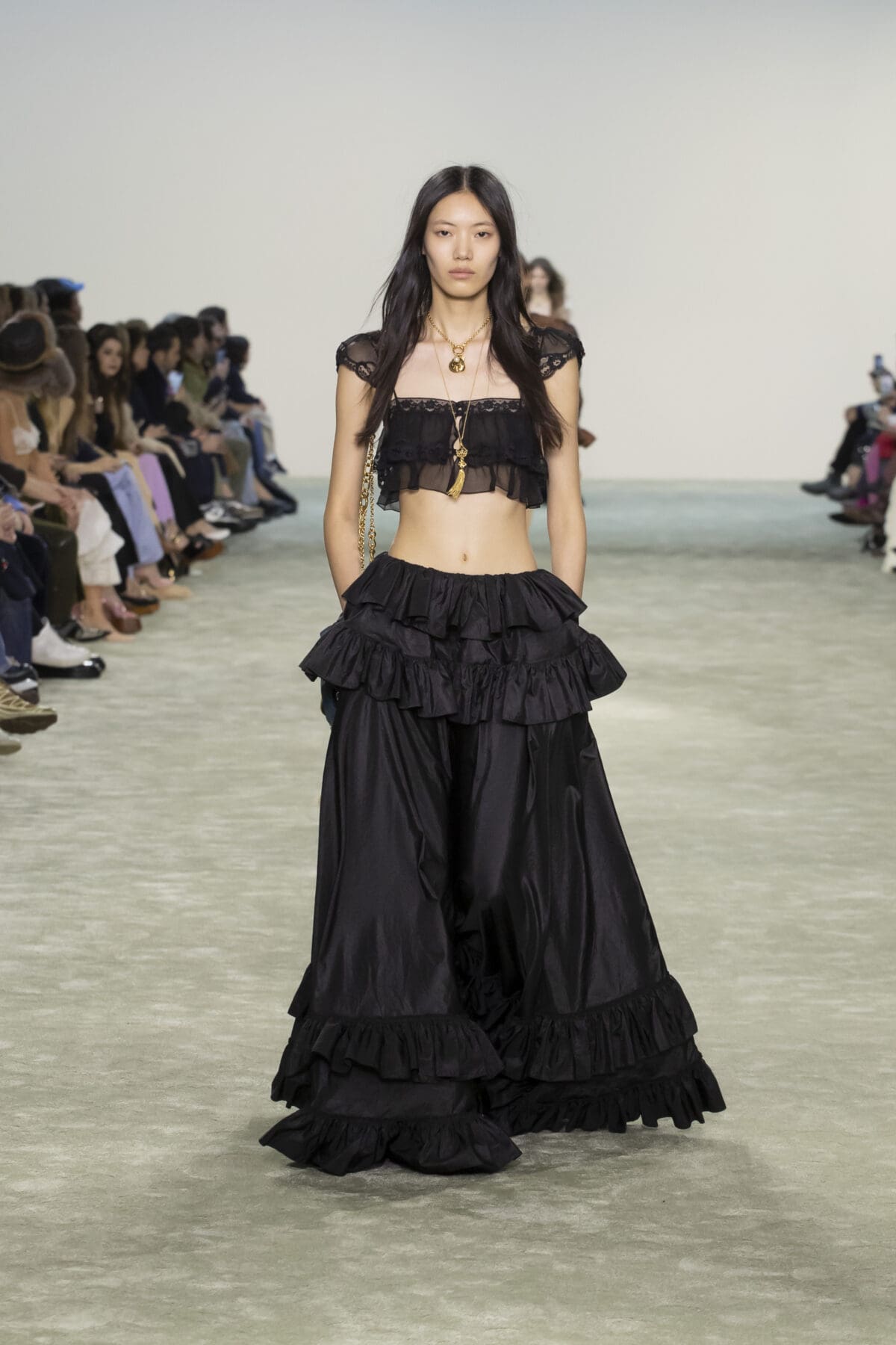 她從1970年代Karl Lagerfeld時期的波希米亞風格中汲取靈感,並結合了1980年代的結構性設計語言,打造出一系列既柔美又充滿力量的單品。Chemena Kamali特別強調了「復古睡衣」風格的浪漫,將飄逸的雪紡和喱士融入裙裝設計中,展現女性細膩且輕盈的一面。而這些歷史元素並未停留於懷舊,而是通過結構的重塑與材質的選擇,賦予服裝以現代的實穿性與時尚張力。