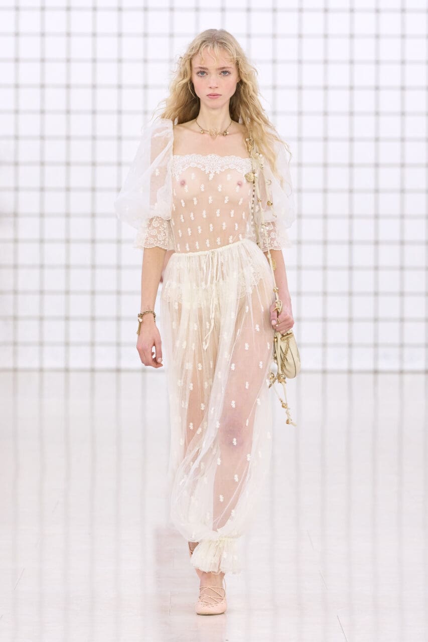「心情輕鬆、自由、感性而快樂」—— Chemena Kamali 這樣形容 Chloé 2025 春夏系列,在展場以至系列設計上也充分反映出這些關鍵詞。今季在伴隨着 Dream Pop 代表 Cocteau Twins 的〈Lorelei〉下展開,音樂散發着一種夢幻而輕盈感,彷彿讓人夢回了昔日的自由之夏。開場一系列的白色造型,幾乎奠定了 Chloé 夏季衣櫥的基礎,從透視面料、蕾絲內衣,以及來自品牌 1970 年代風格的經典燈籠褲,它可被視為本季的「荷葉邊襯衫」般的存在。