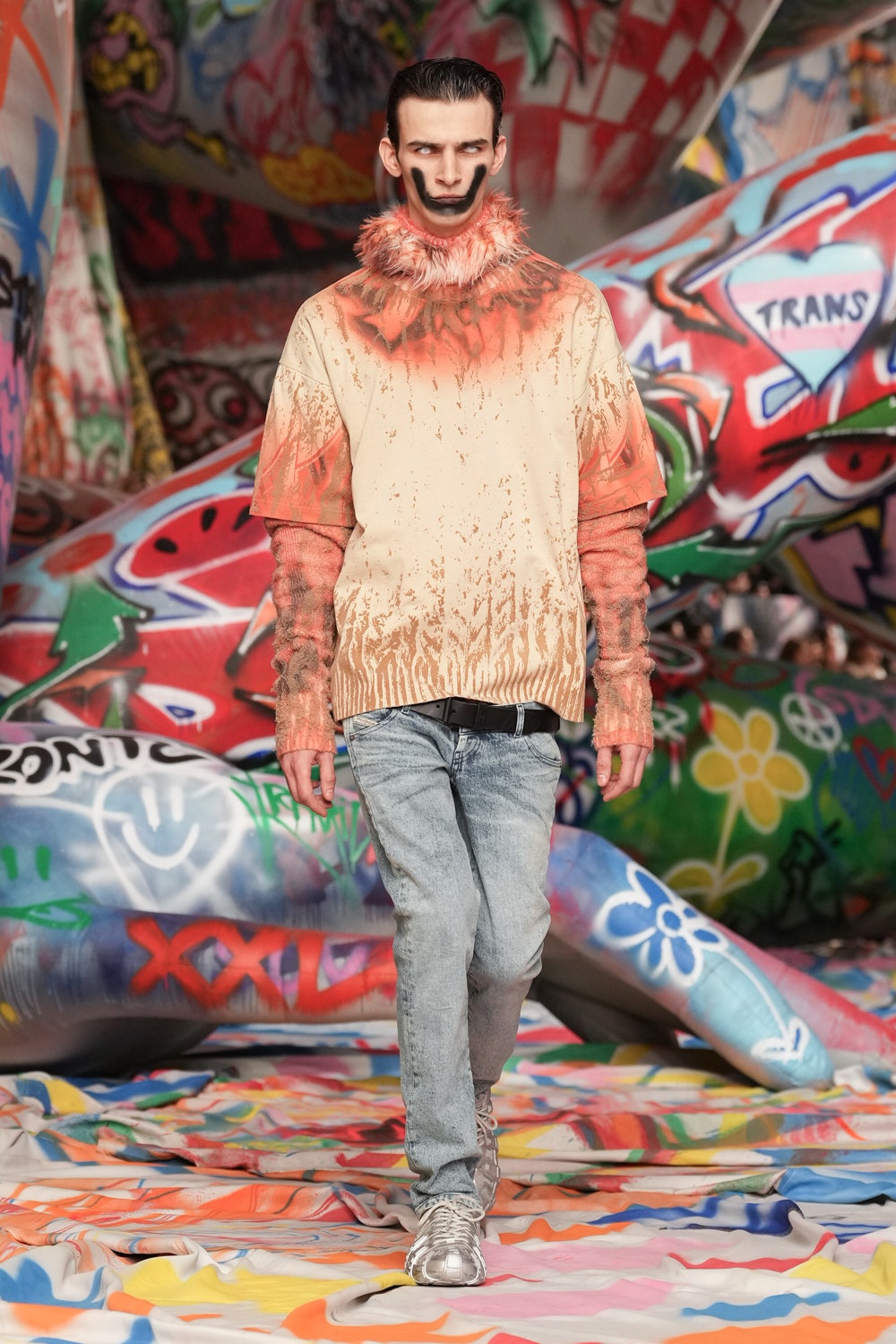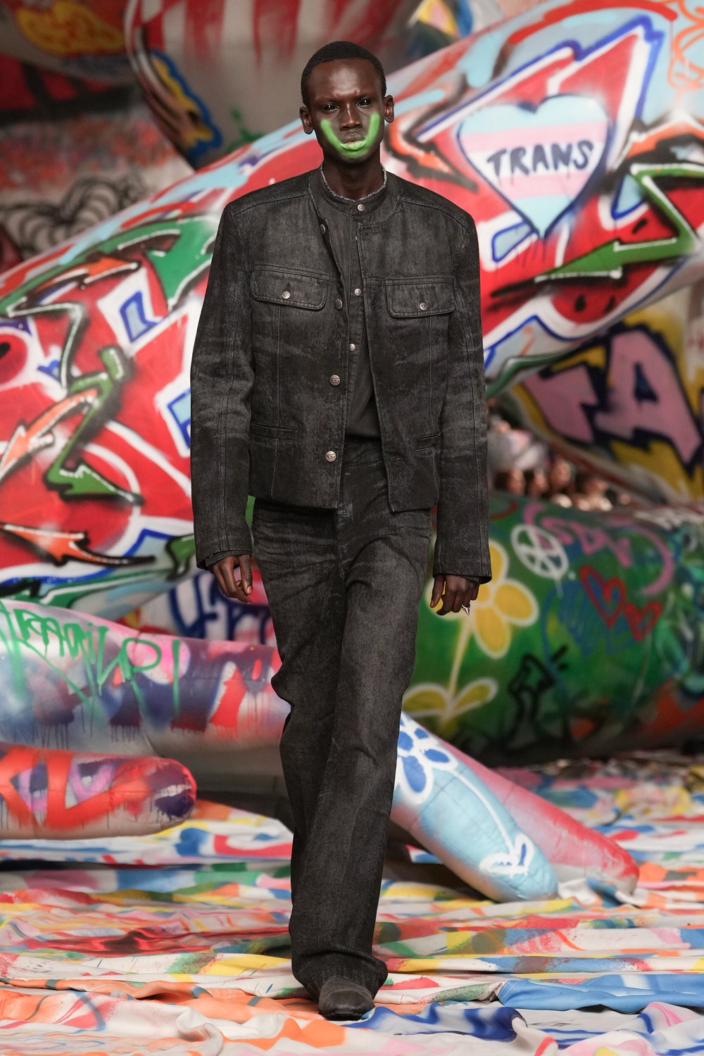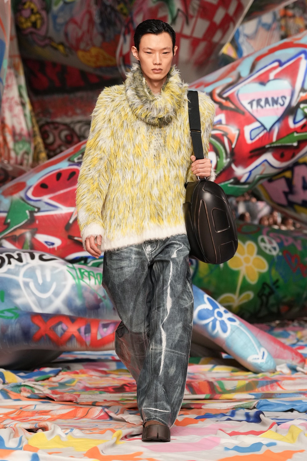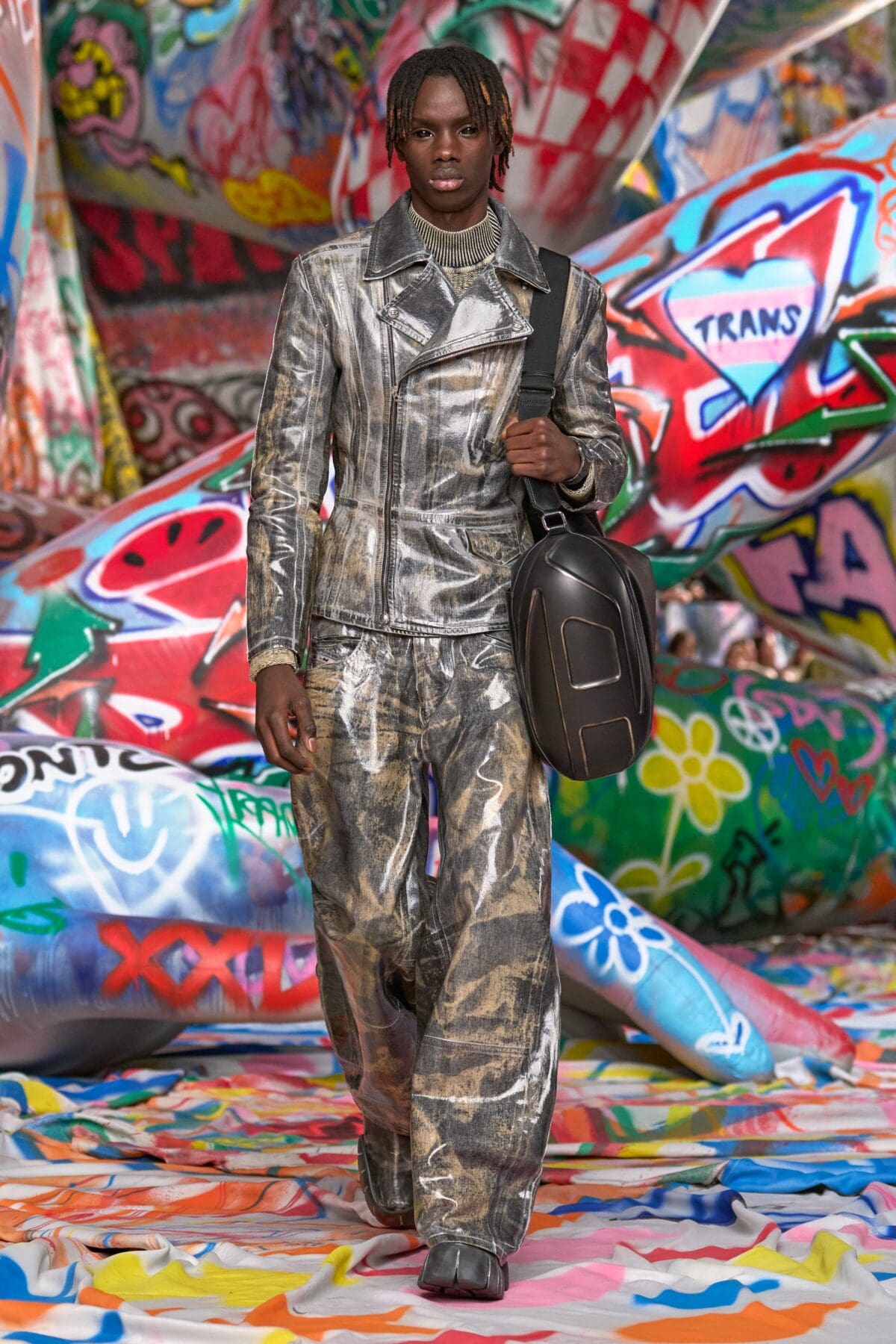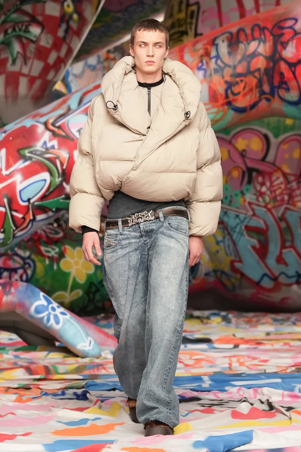 場地中央,由Studio Dennis Vanderbroeck概念設計的巨型充氣雕塑再次回歸——這座曾於2023春夏系列登場並創下世界紀錄的裝置,如今被完整覆蓋上塗鴉圖案,進一步強化Diesel對街頭文化的詮釋。