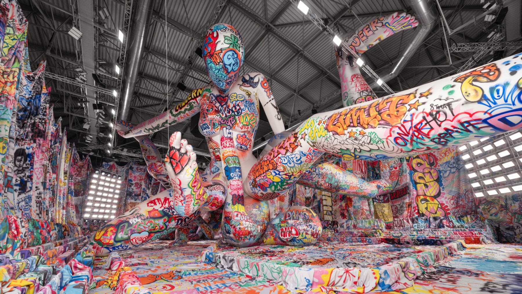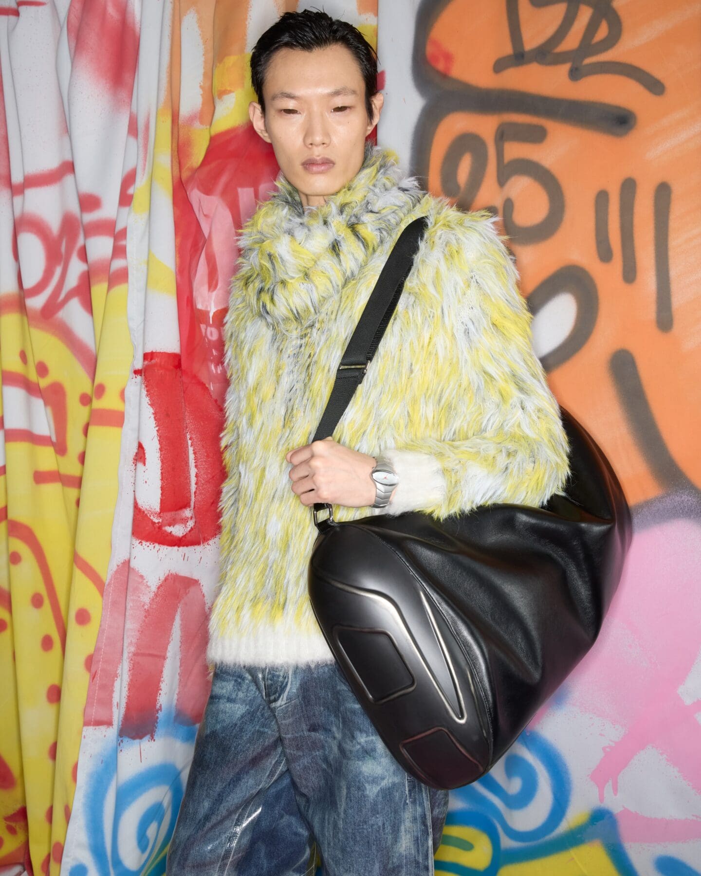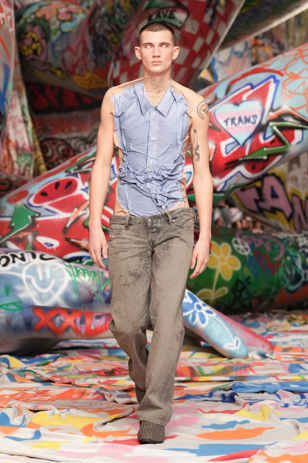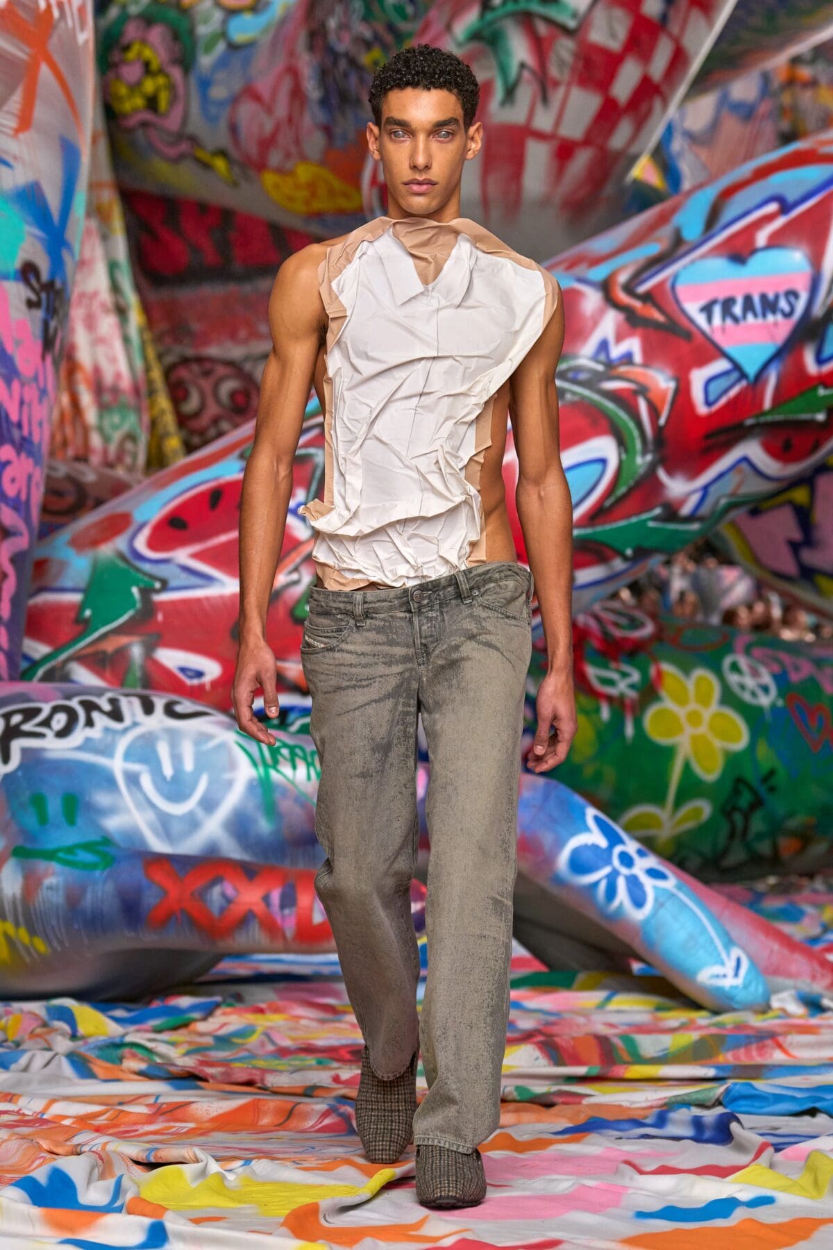 場地中央,由Studio Dennis Vanderbroeck概念設計的巨型充氣雕塑再次回歸——這座曾於2023春夏系列登場並創下世界紀錄的裝置,如今被完整覆蓋上塗鴉圖案,進一步強化Diesel對街頭文化的詮釋。