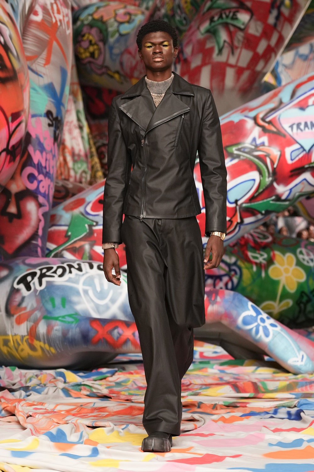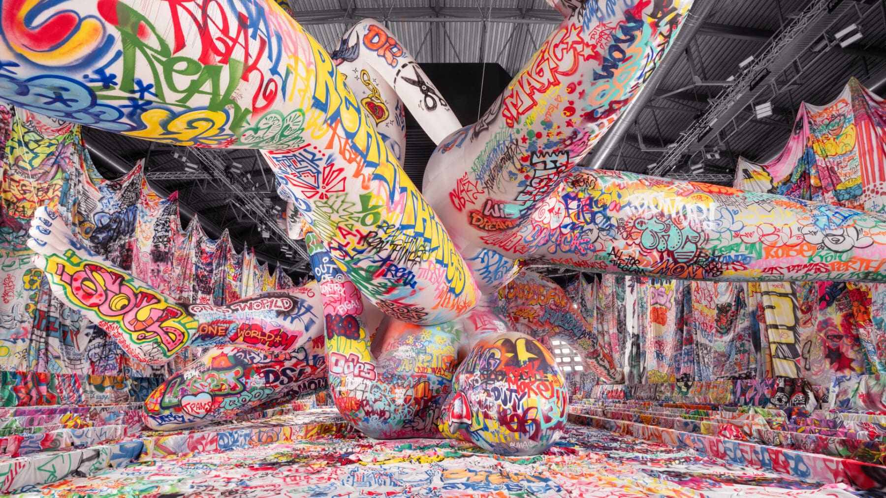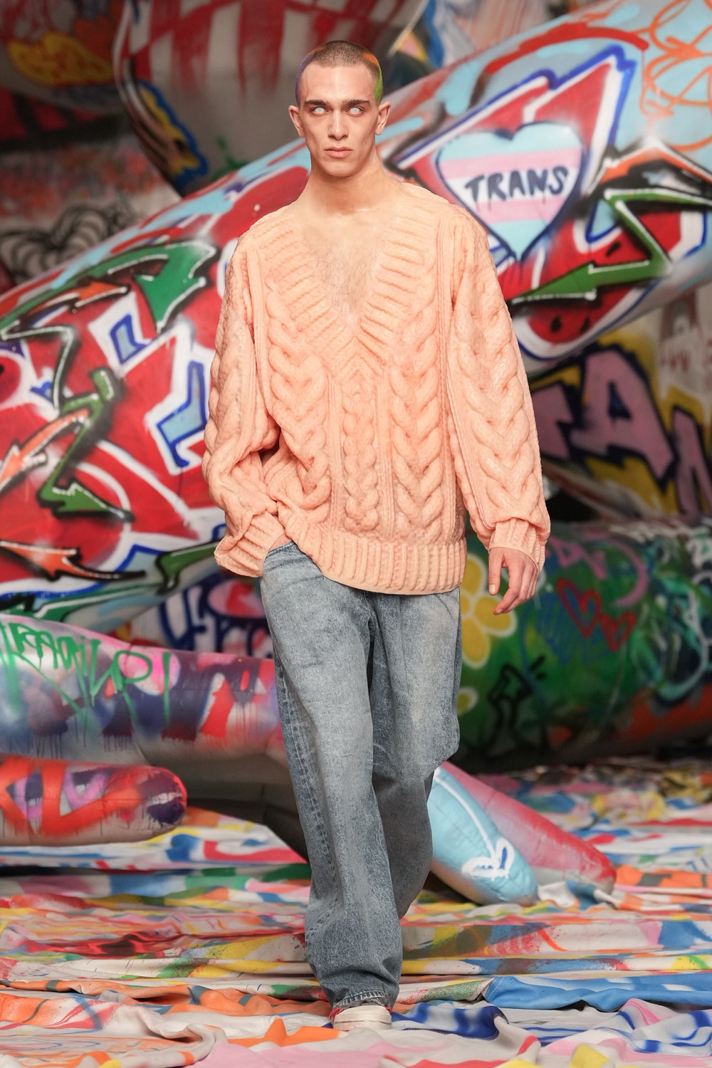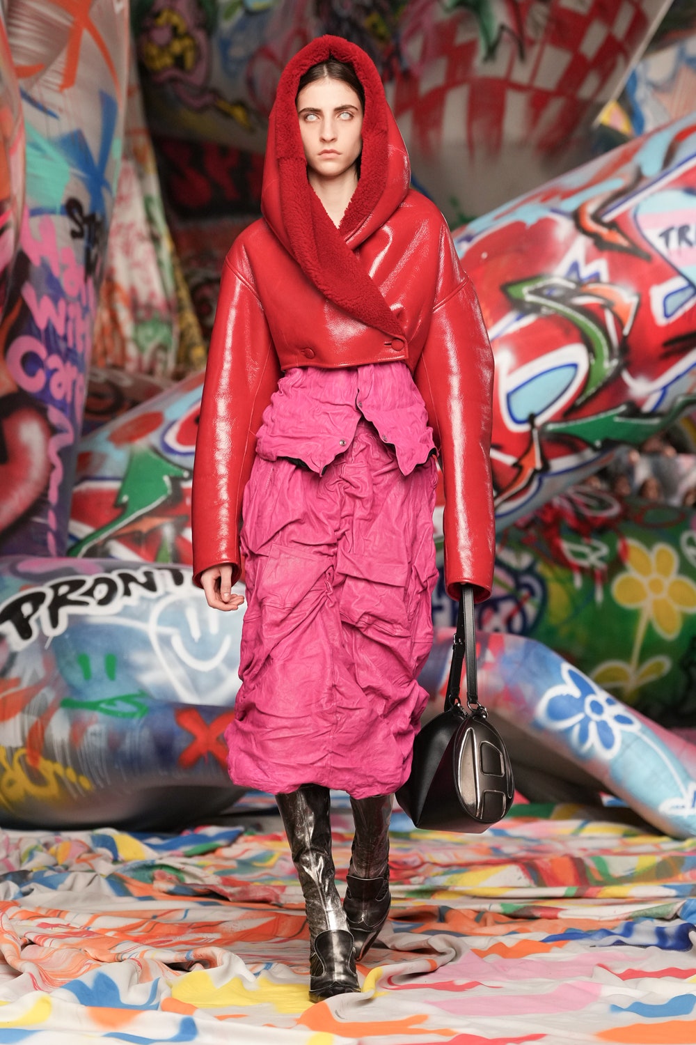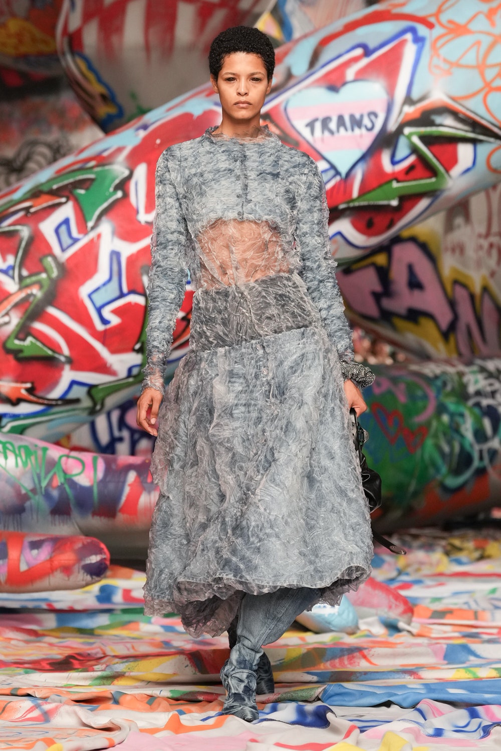 場地中央,由Studio Dennis Vanderbroeck概念設計的巨型充氣雕塑再次回歸——這座曾於2023春夏系列登場並創下世界紀錄的裝置,如今被完整覆蓋上塗鴉圖案,進一步強化Diesel對街頭文化的詮釋。