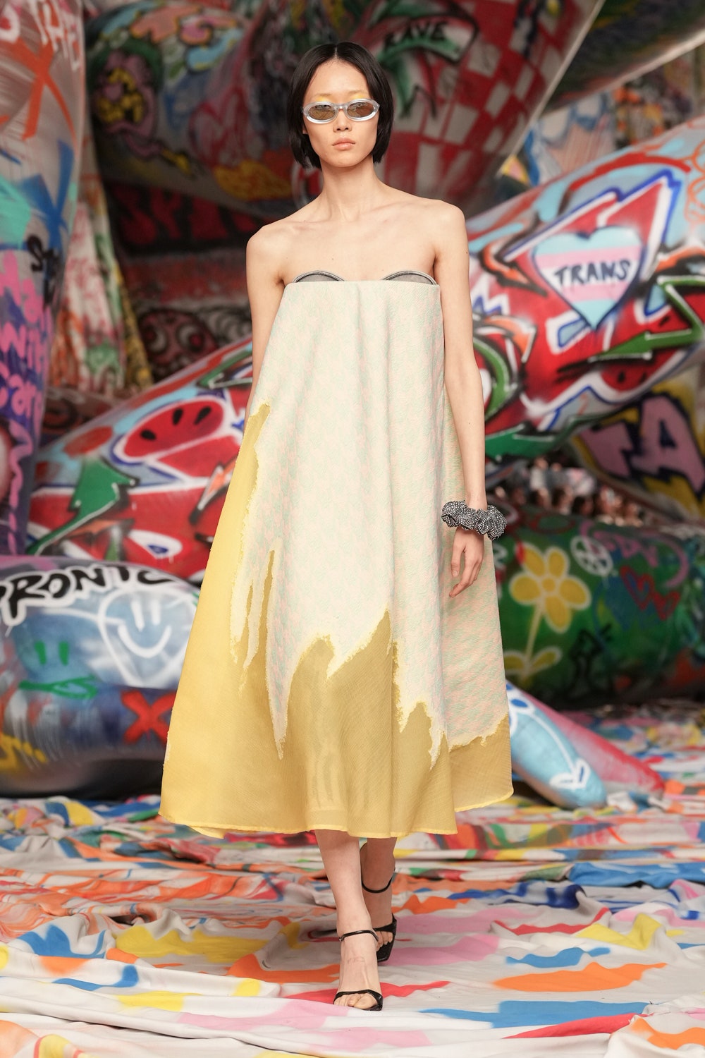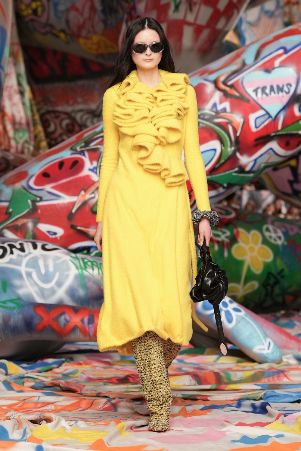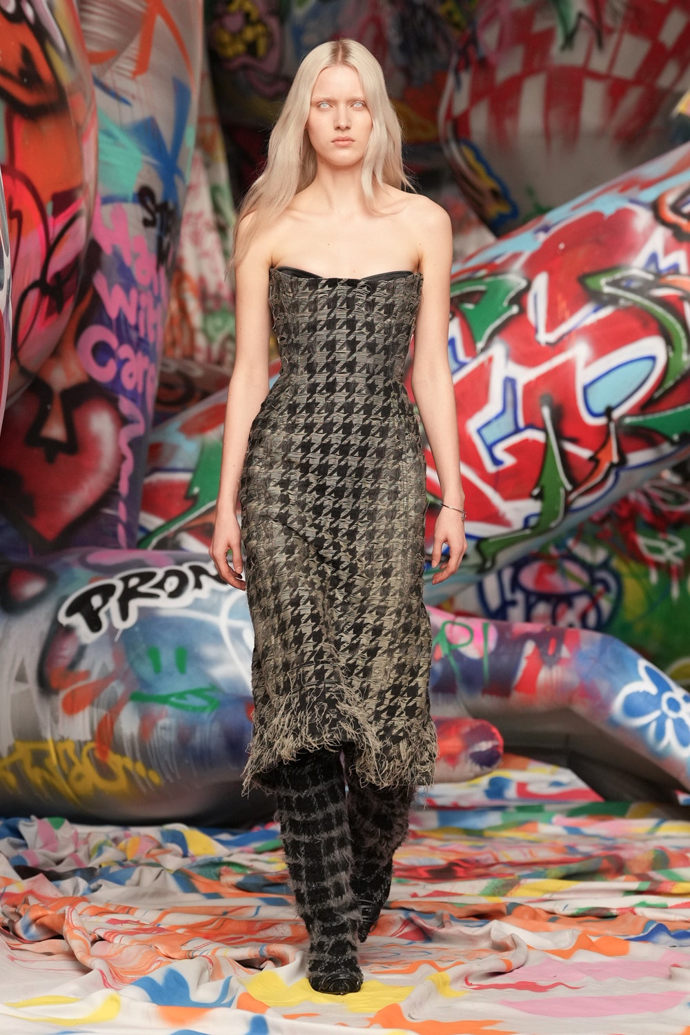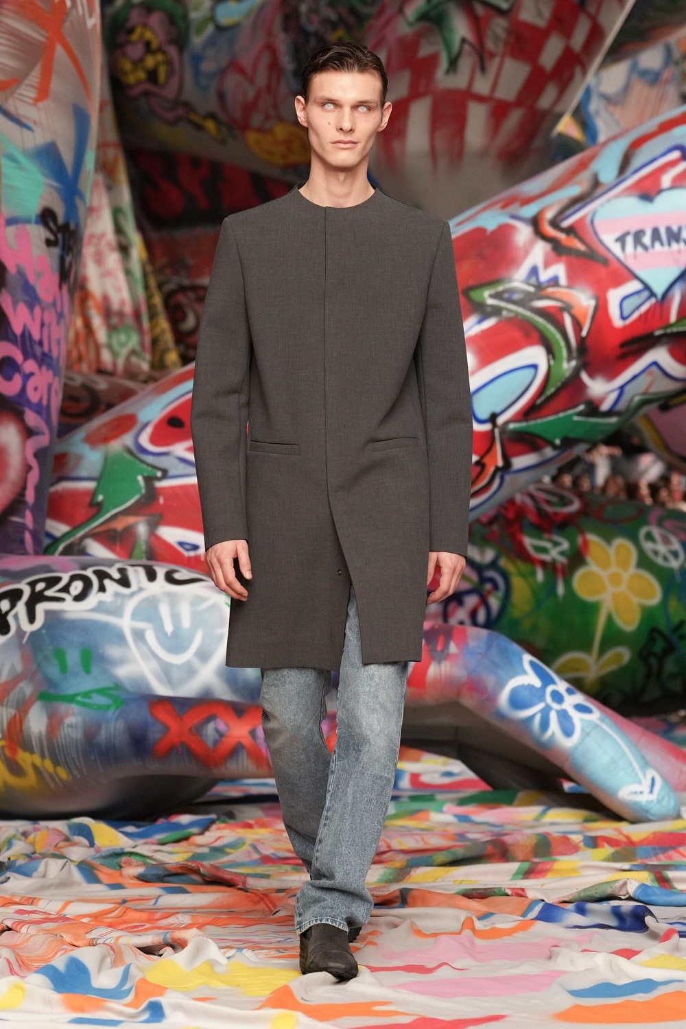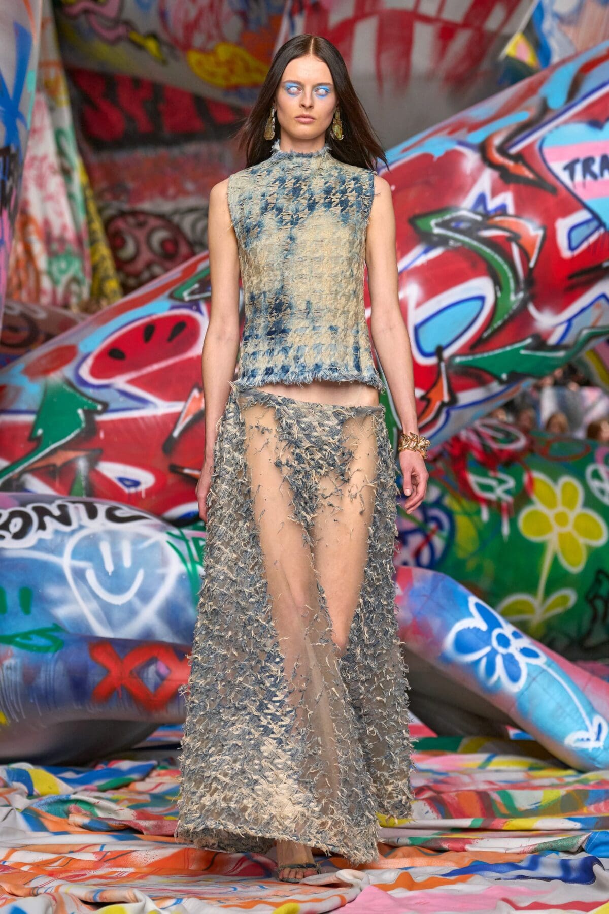 場地中央,由Studio Dennis Vanderbroeck概念設計的巨型充氣雕塑再次回歸——這座曾於2023春夏系列登場並創下世界紀錄的裝置,如今被完整覆蓋上塗鴉圖案,進一步強化Diesel對街頭文化的詮釋。