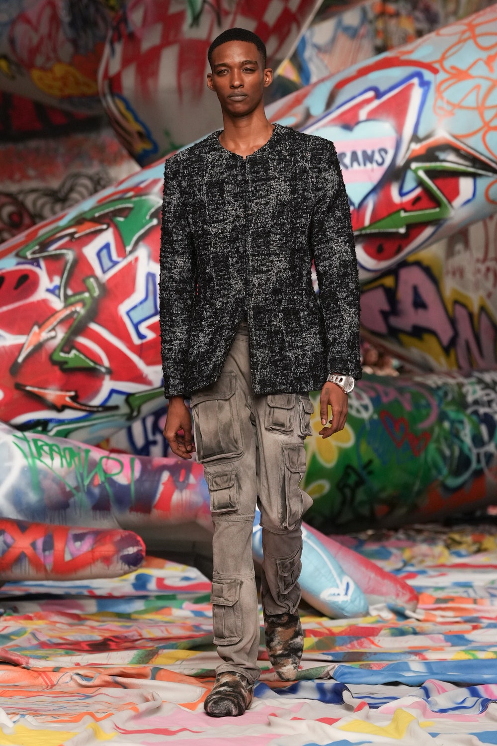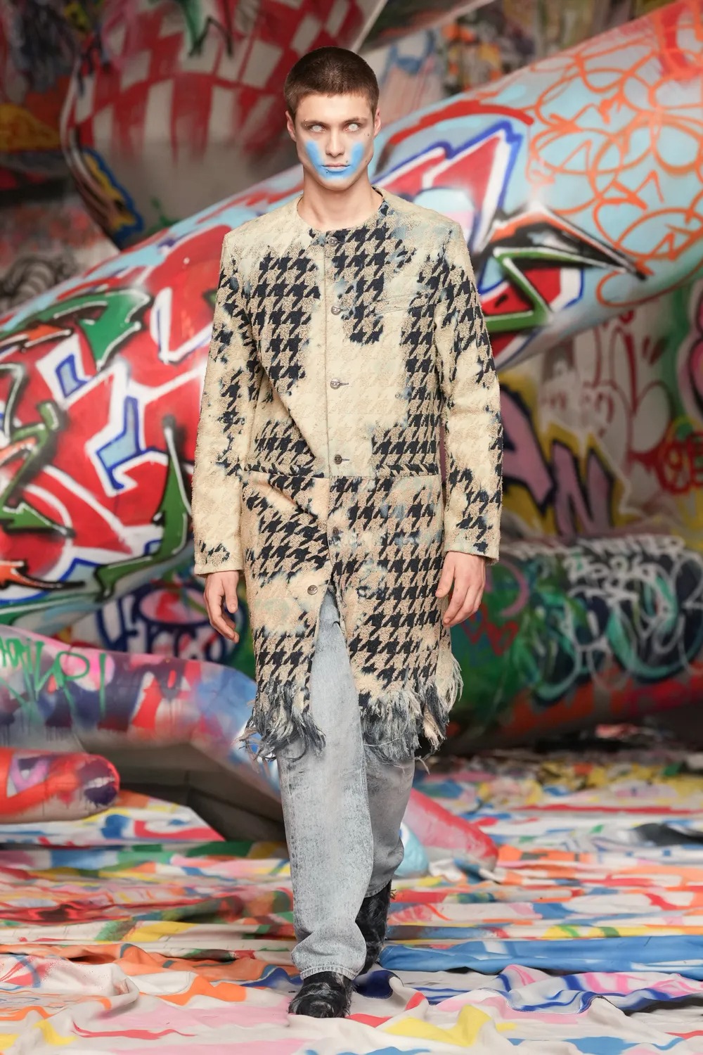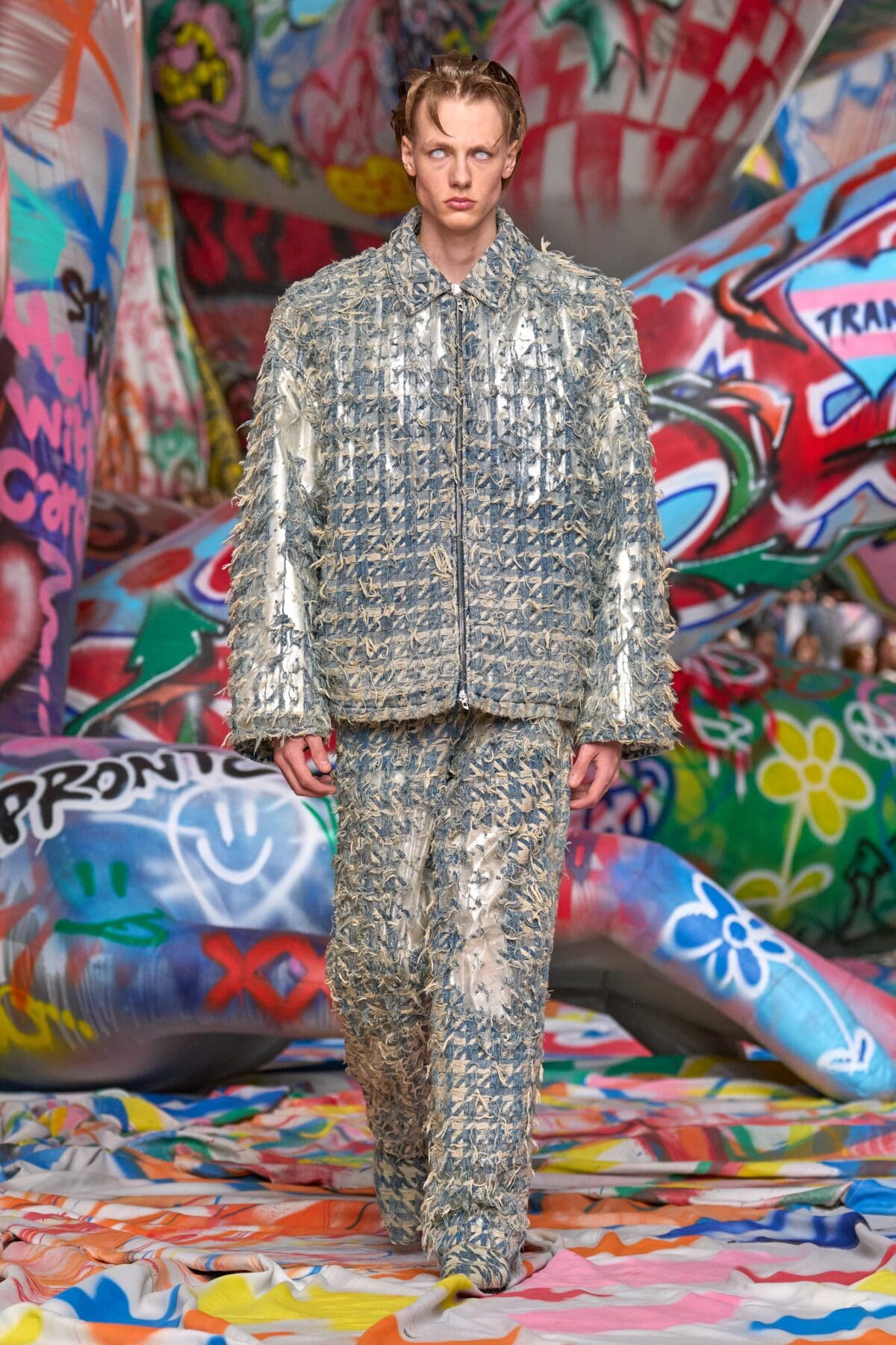 本季Diesel在米蘭打造前所未有的視覺衝擊,時裝展內部被3.2公里長的塗鴉布料覆蓋,來自世界各地的街頭藝術家以自由創作形式揮灑色彩,打造出屬於當代的個性空間。創意總監Glenn Martens形容這場時裝展為「The True Democracy of Diesel」,透過開放性的藝術表達,打破時尚與街頭文化的藩籬。
