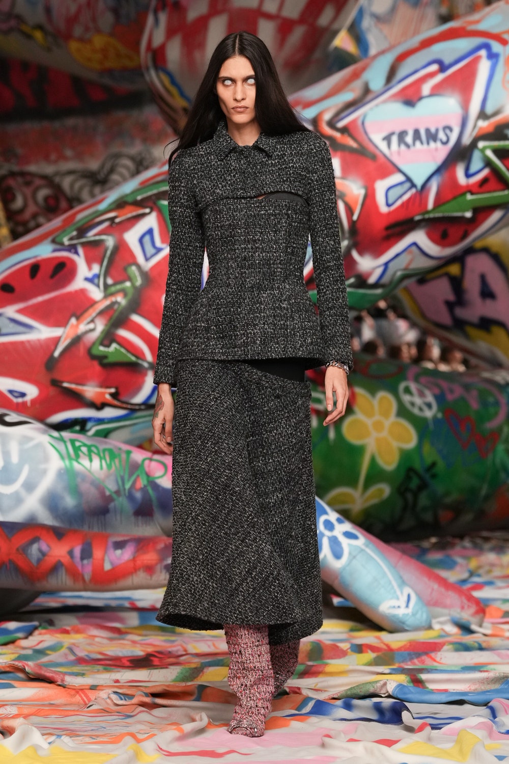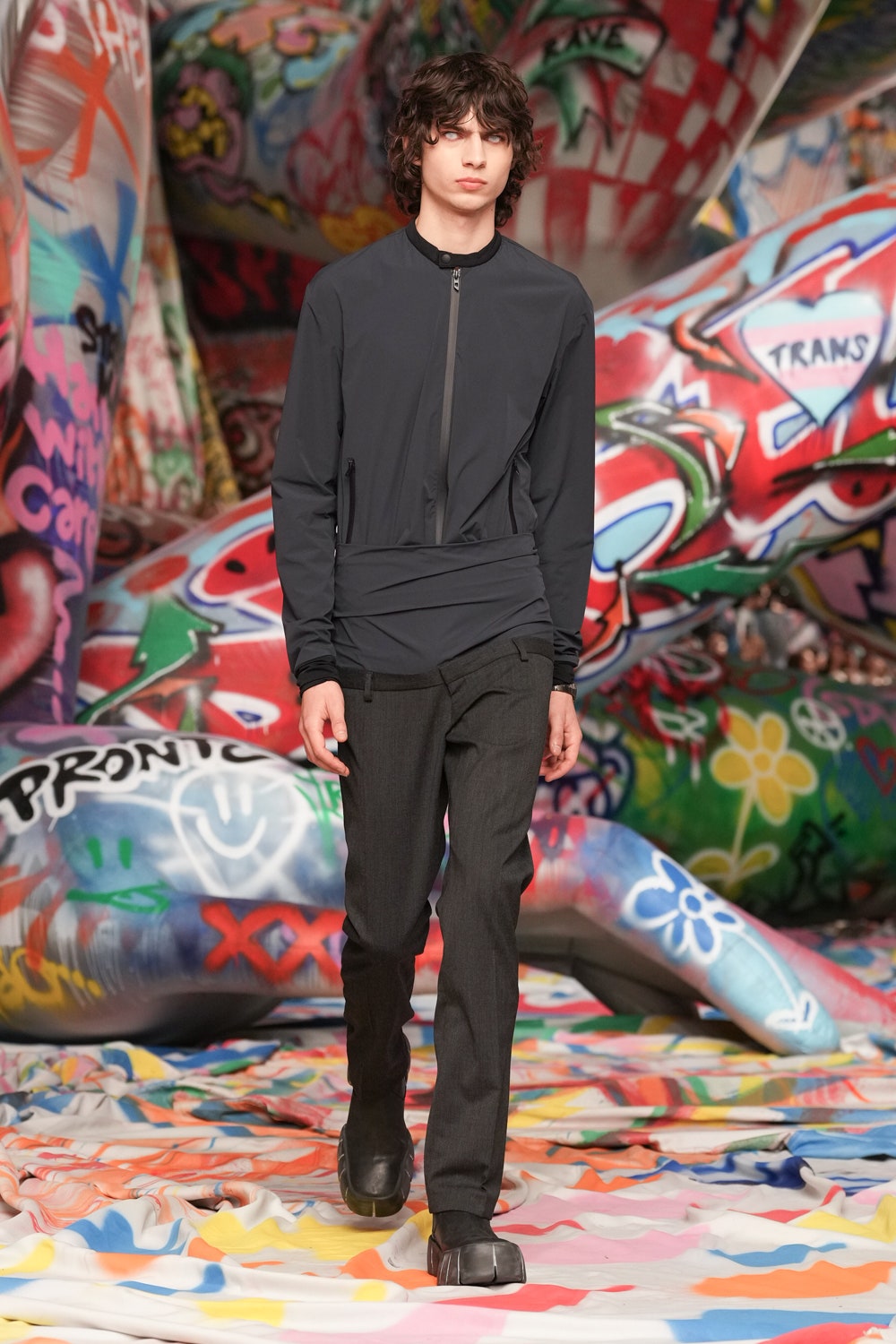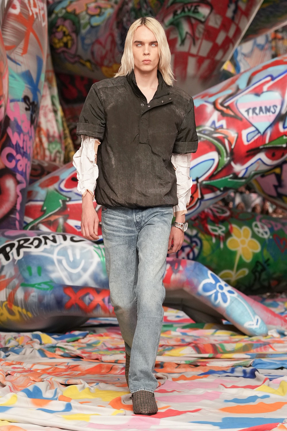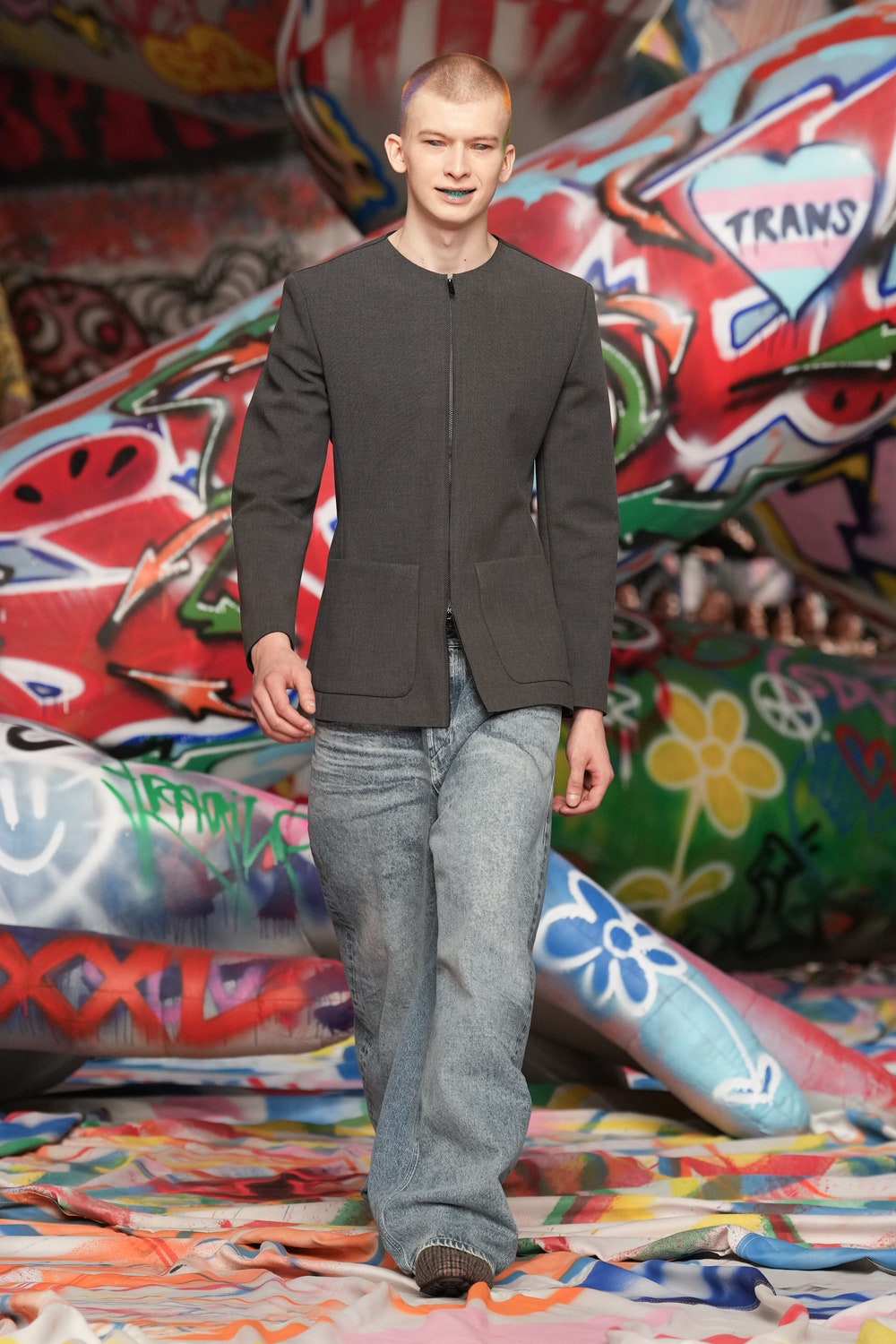 本季Diesel在米蘭打造前所未有的視覺衝擊,時裝展內部被3.2公里長的塗鴉布料覆蓋,來自世界各地的街頭藝術家以自由創作形式揮灑色彩,打造出屬於當代的個性空間。創意總監Glenn Martens形容這場時裝展為「The True Democracy of Diesel」,透過開放性的藝術表達,打破時尚與街頭文化的藩籬。