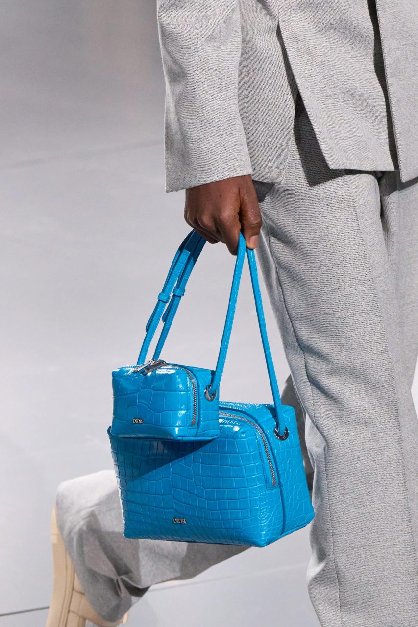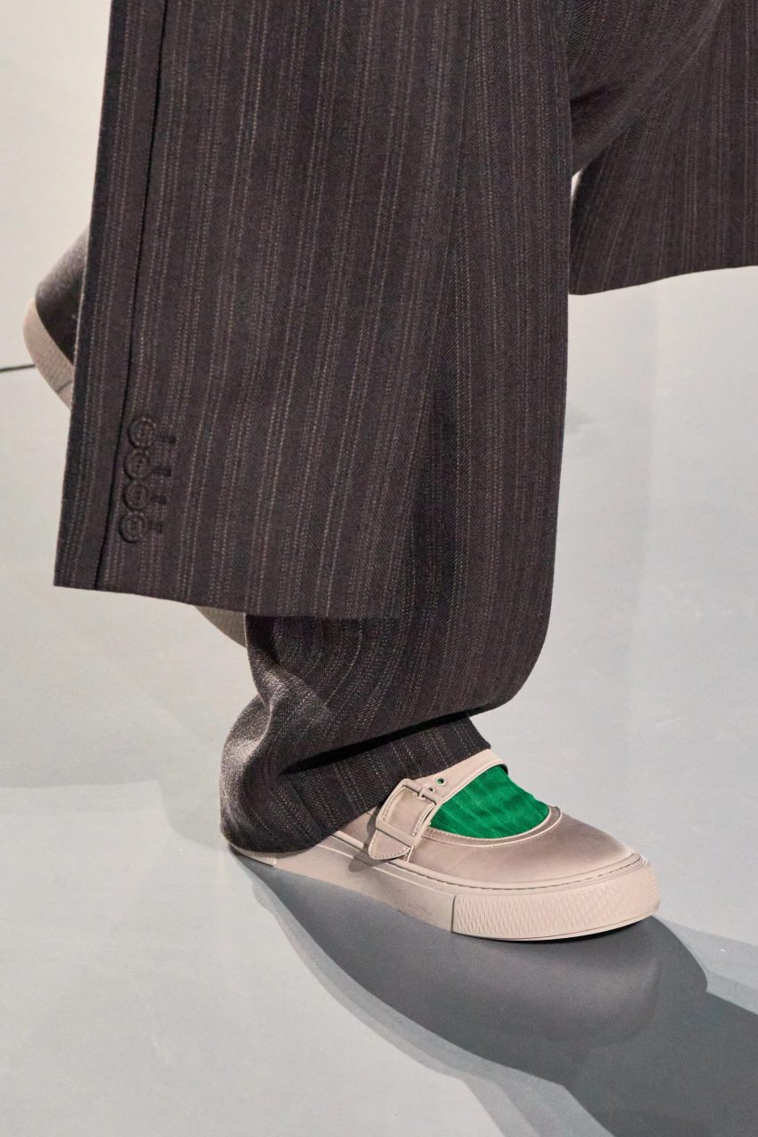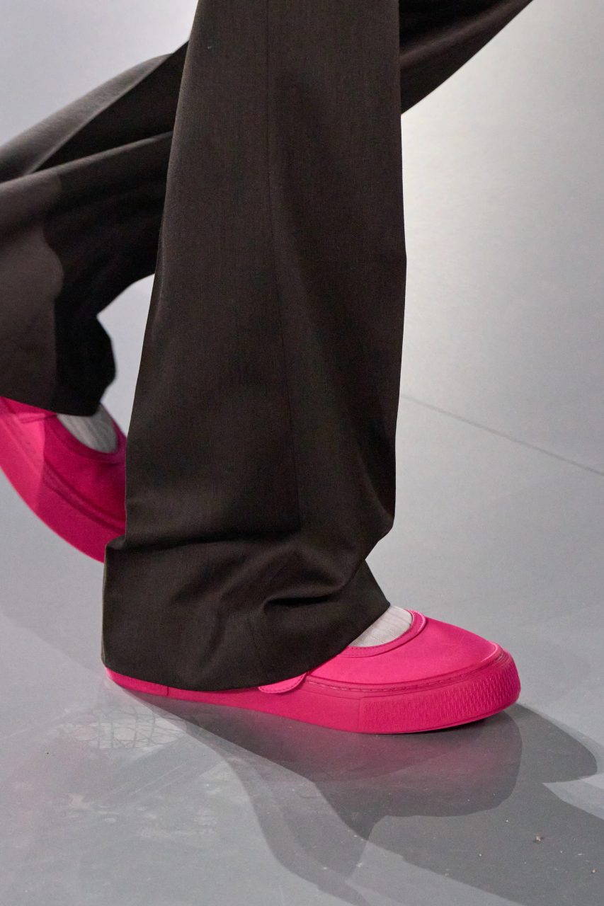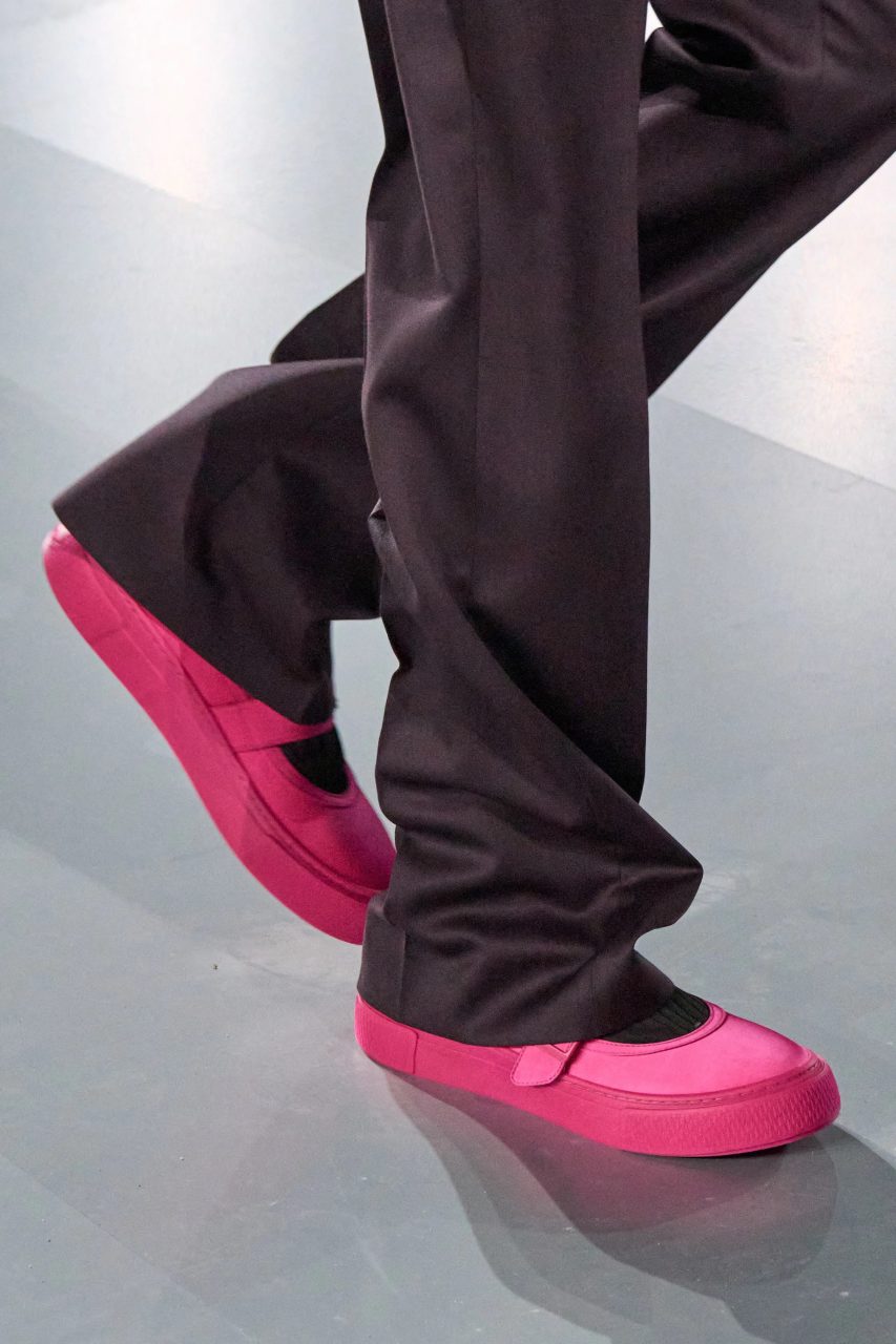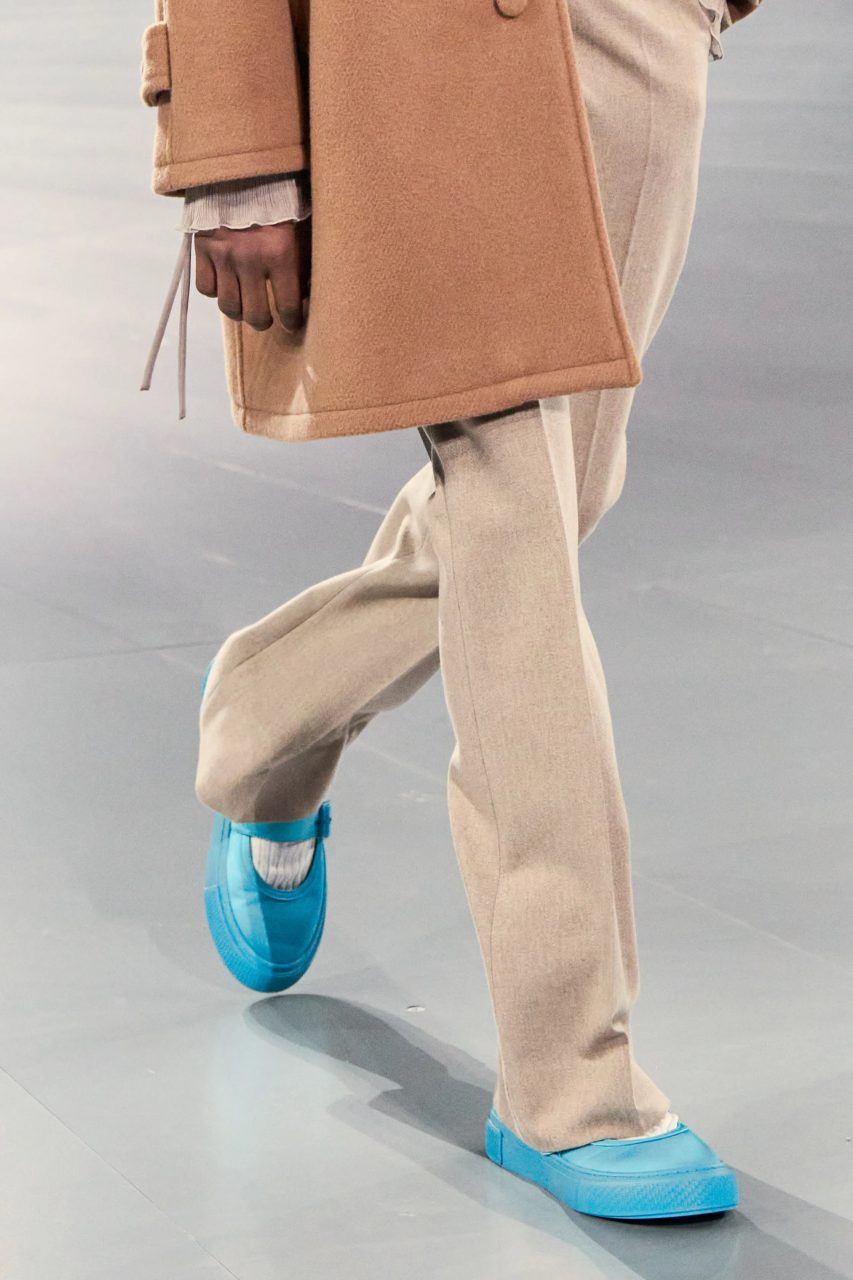 偏灰的米色、杏色和紅棕色不只出現在西裝外套和上衣,更能在各針織單品感受到其柔和美態。雖然穿搭多為大地色,卻在細節處加入對比色,例如天藍色和螢光粉紅色襪子,還有黃色、鮮綠色和粉紫色小單品和內搭,與灰調服裝形成對比,讓人眼前一亮,在一眾柔和中加入活潑亮麗的色彩。