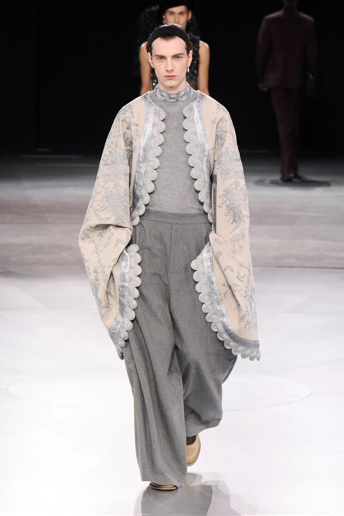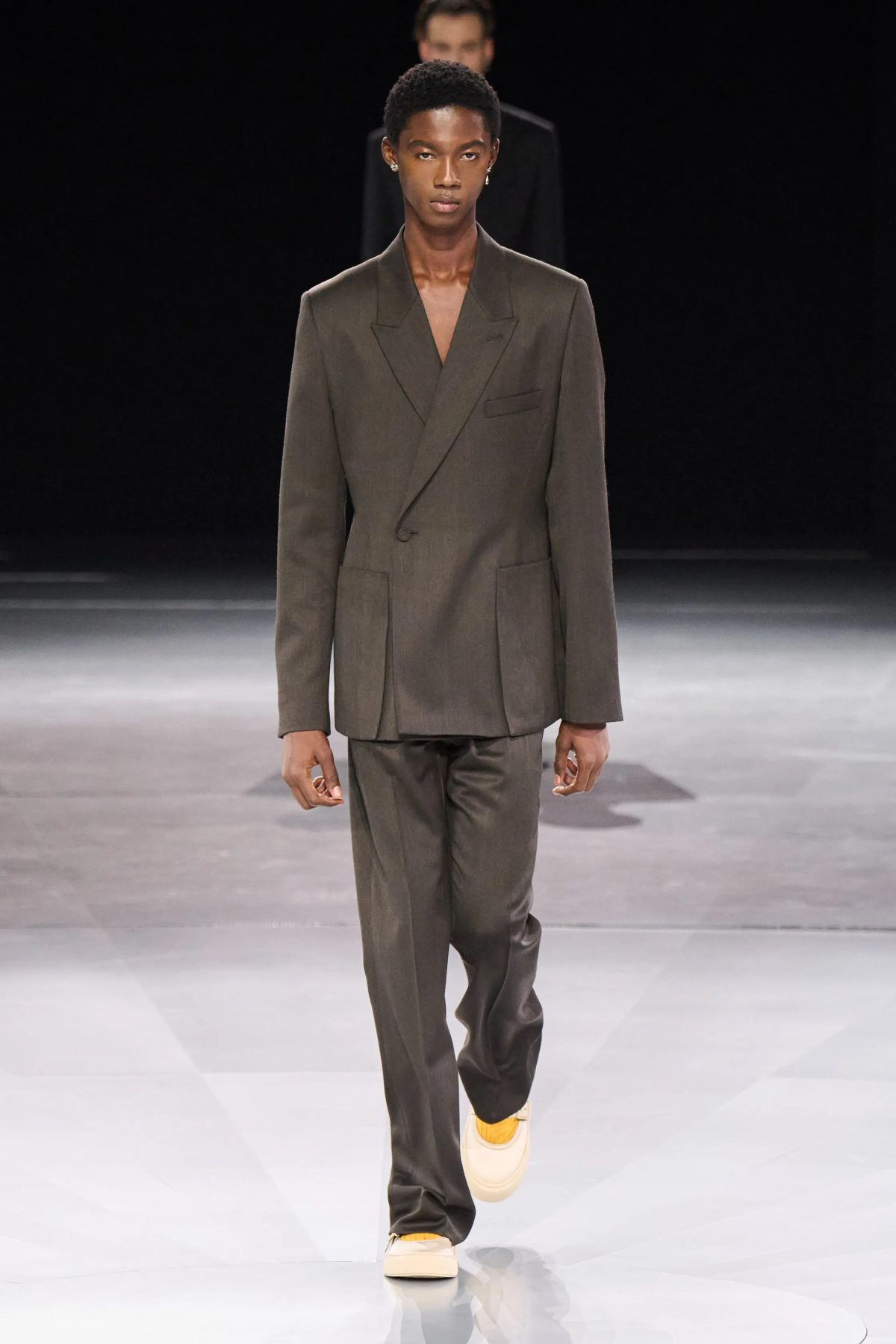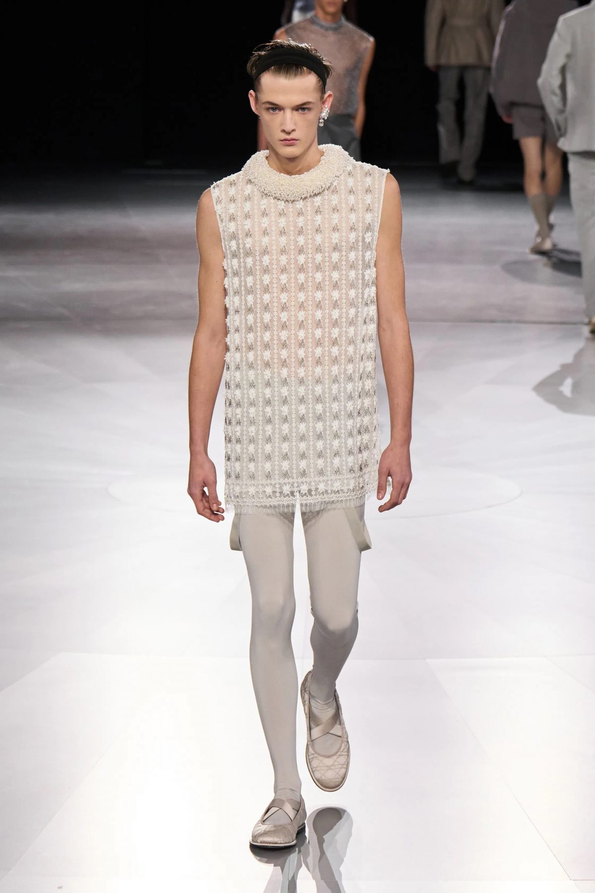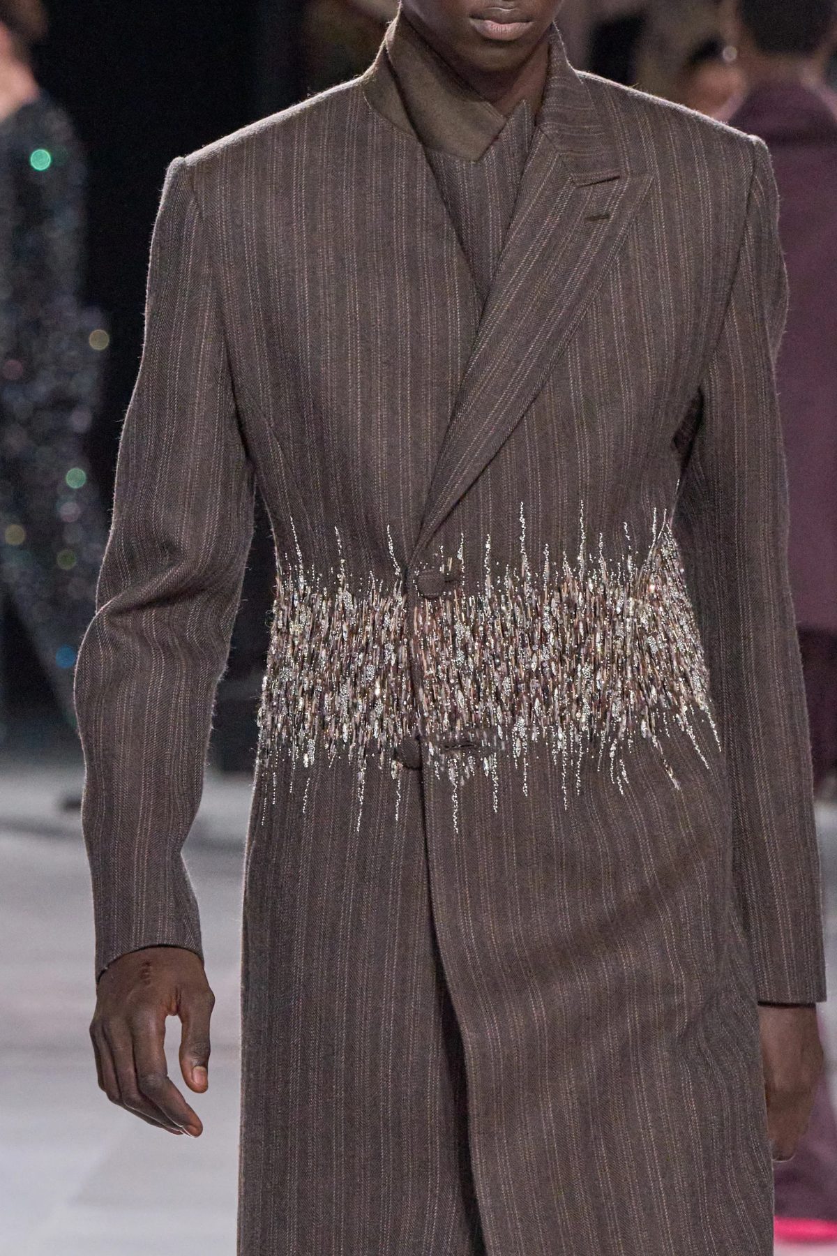 簡約、自律、奢華。以芭蕾藝術男性為靈感切入,Kim Jones今季首次推出高訂時裝,向大眾呈現實用與奢華融合的精緻美學。服裝參考過往系列,適當保留開衩、褶襇及領口,大量用上對稱、合身剪裁,偏灰紅的大地色系讓整體更和諧溫柔,少量加上亮彩色,以及芭蕾舞鞋元素,再度呼應主題。