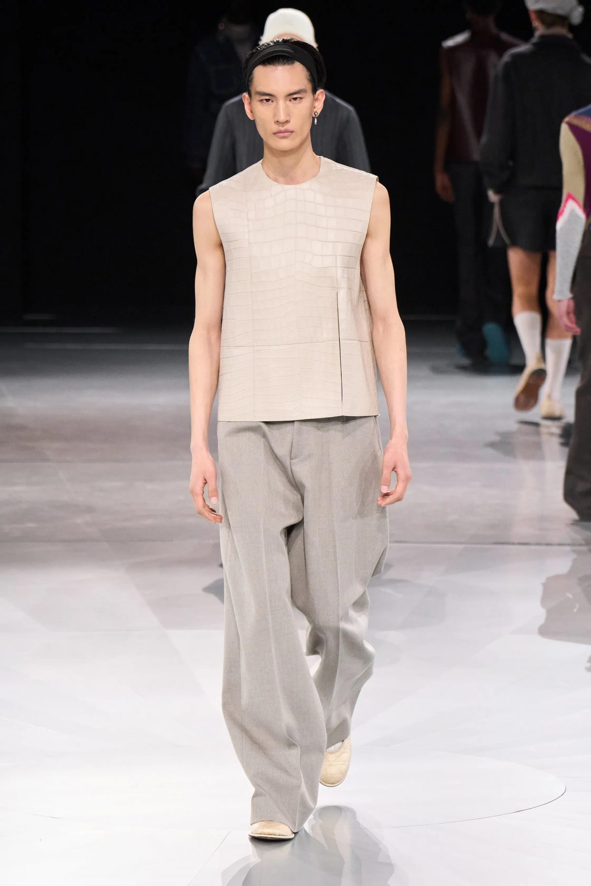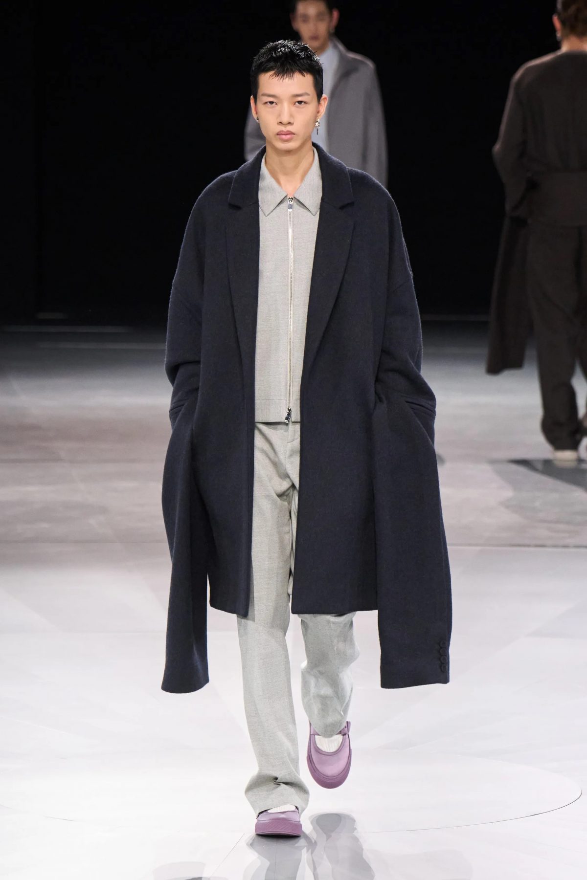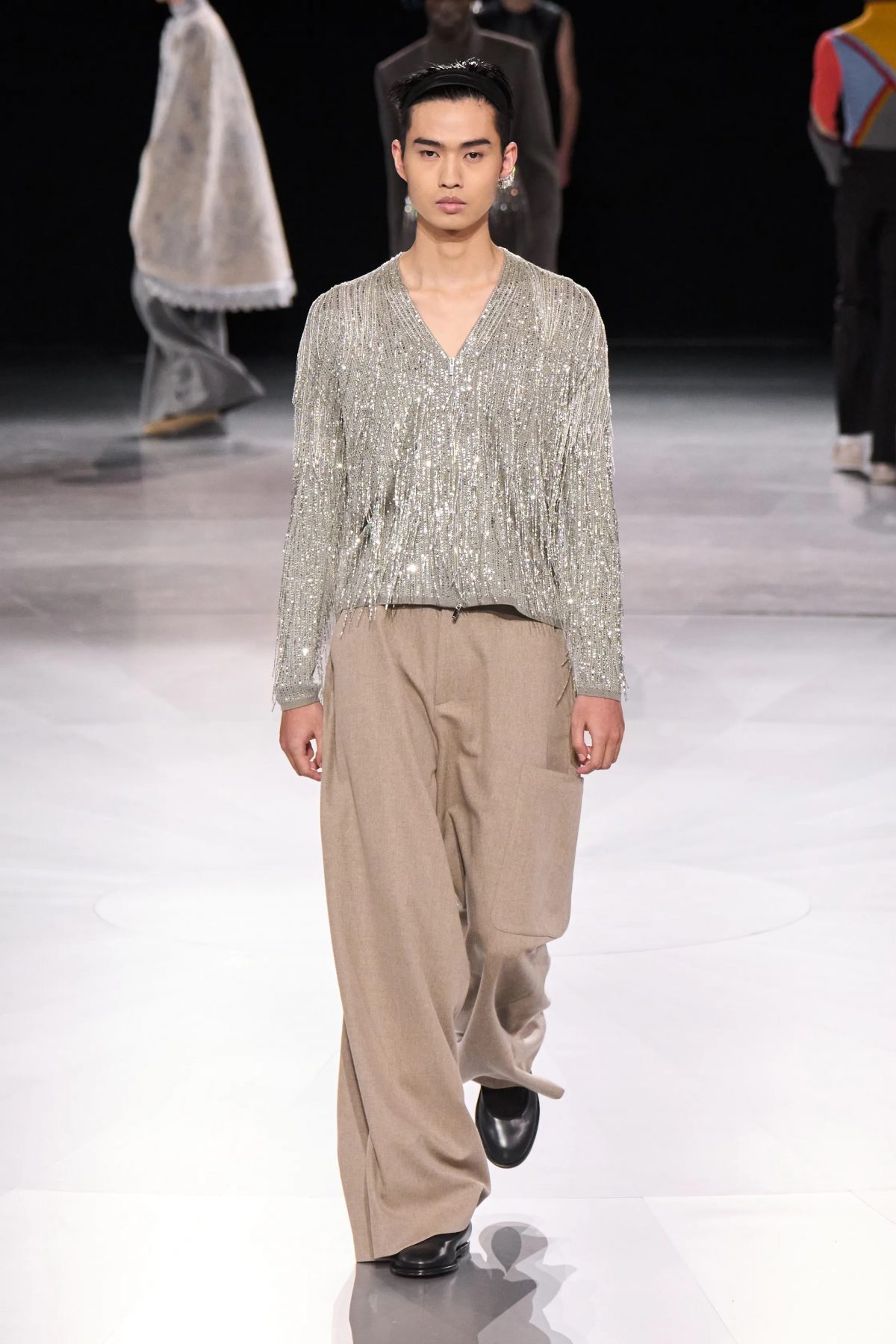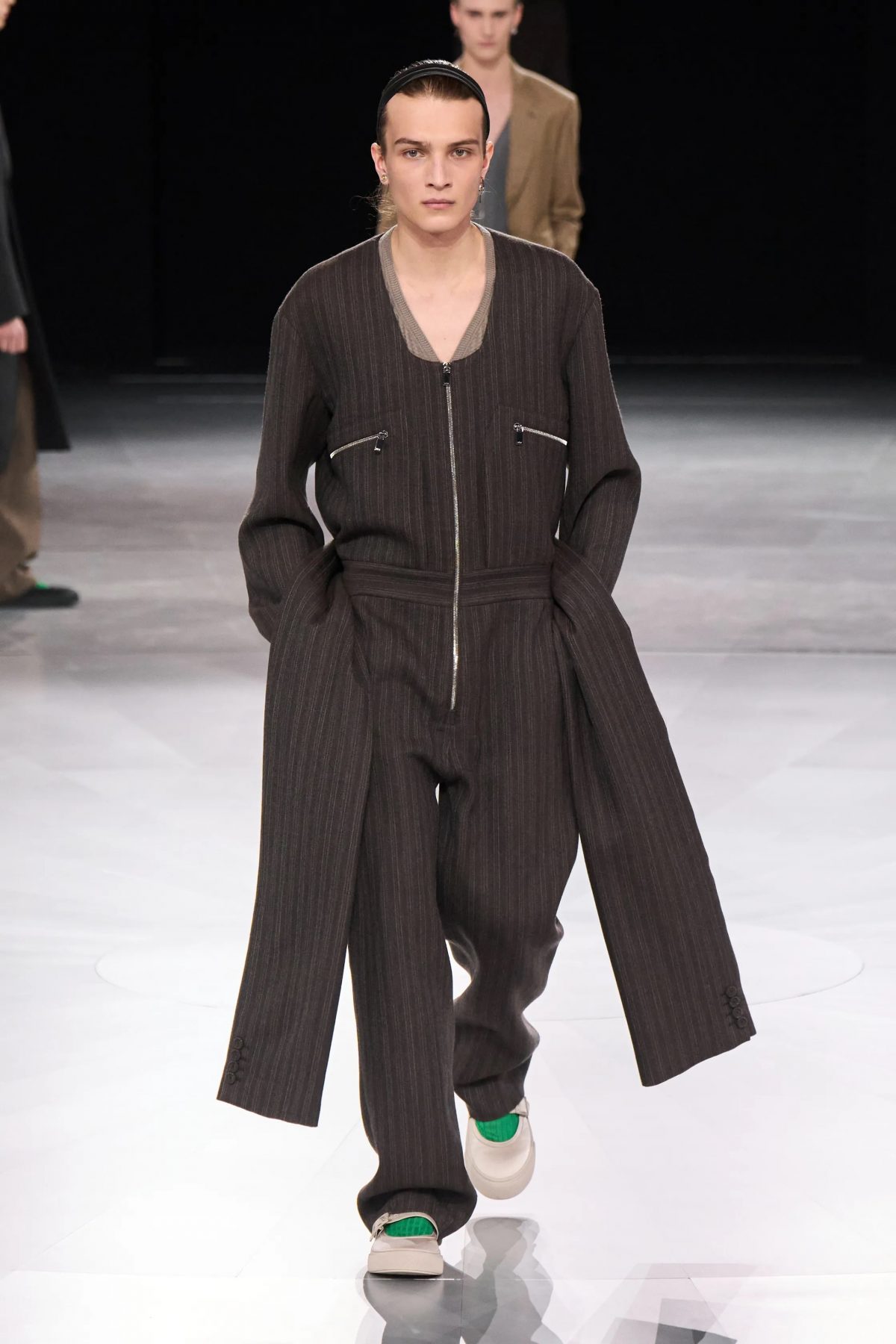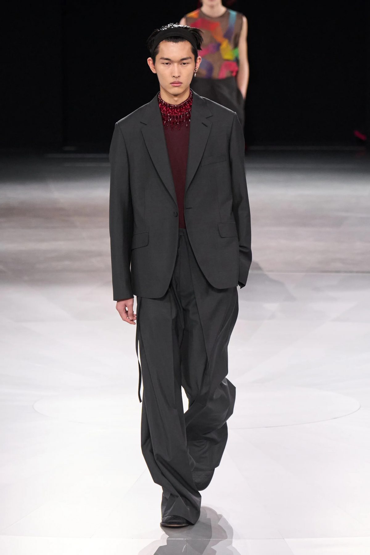 簡約、自律、奢華。以芭蕾藝術男性為靈感切入,Kim Jones今季首次推出高訂時裝,向大眾呈現實用與奢華融合的精緻美學。服裝參考過往系列,適當保留開衩、褶襇及領口,大量用上對稱、合身剪裁,偏灰紅的大地色系讓整體更和諧溫柔,少量加上亮彩色,以及芭蕾舞鞋元素,再度呼應主題。