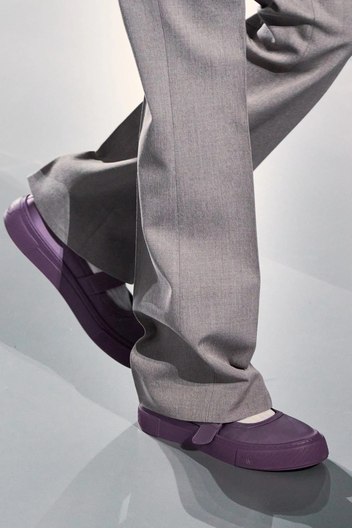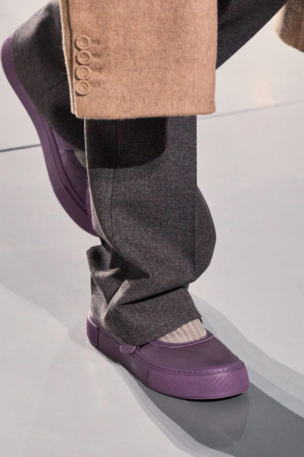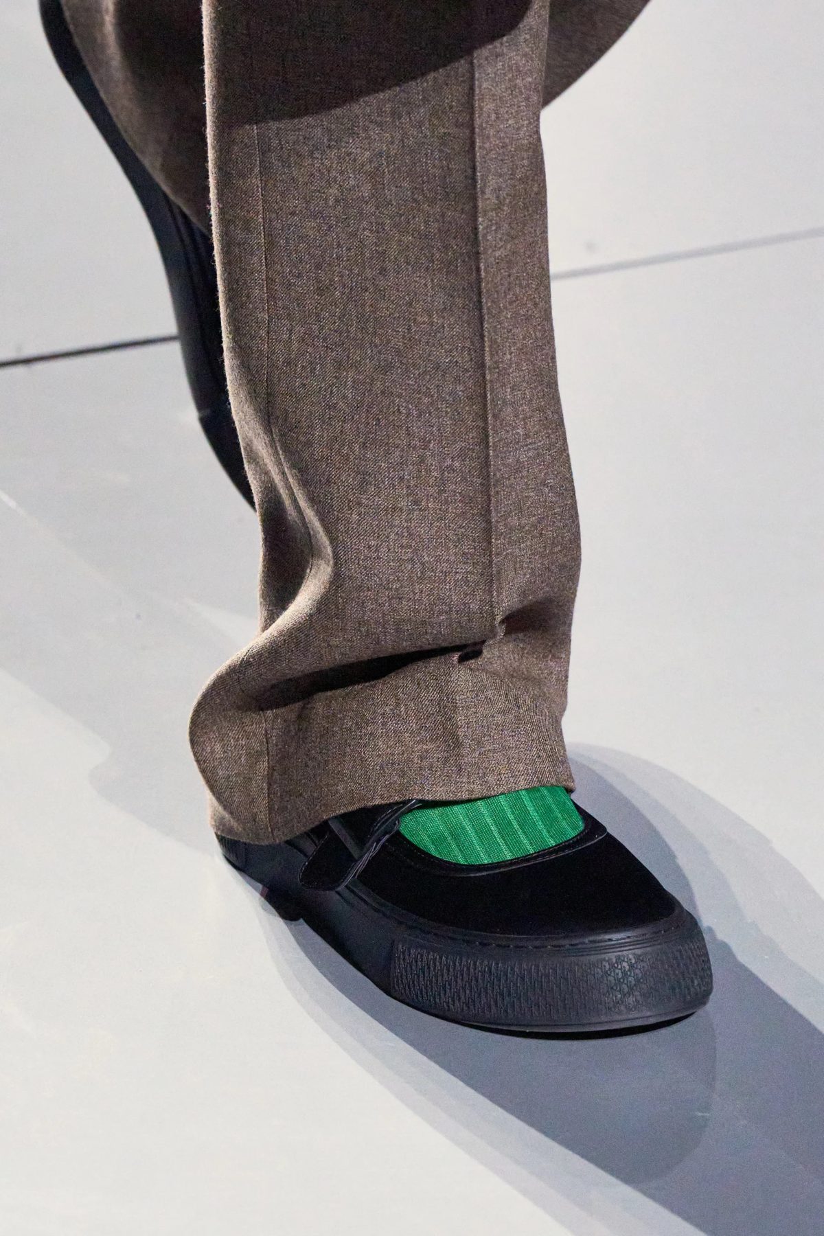 偏灰的米色、杏色和紅棕色不只出現在西裝外套和上衣,更能在各針織單品感受到其柔和美態。雖然穿搭多為大地色,卻在細節處加入對比色,例如天藍色和螢光粉紅色襪子,還有黃色、鮮綠色和粉紫色小單品和內搭,與灰調服裝形成對比,讓人眼前一亮,在一眾柔和中加入活潑亮麗的色彩。