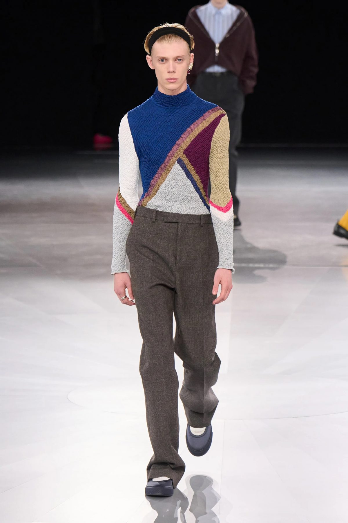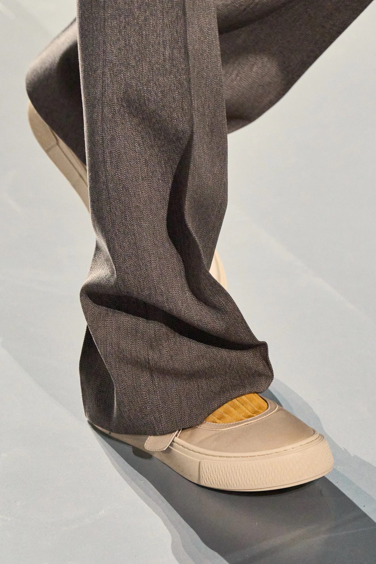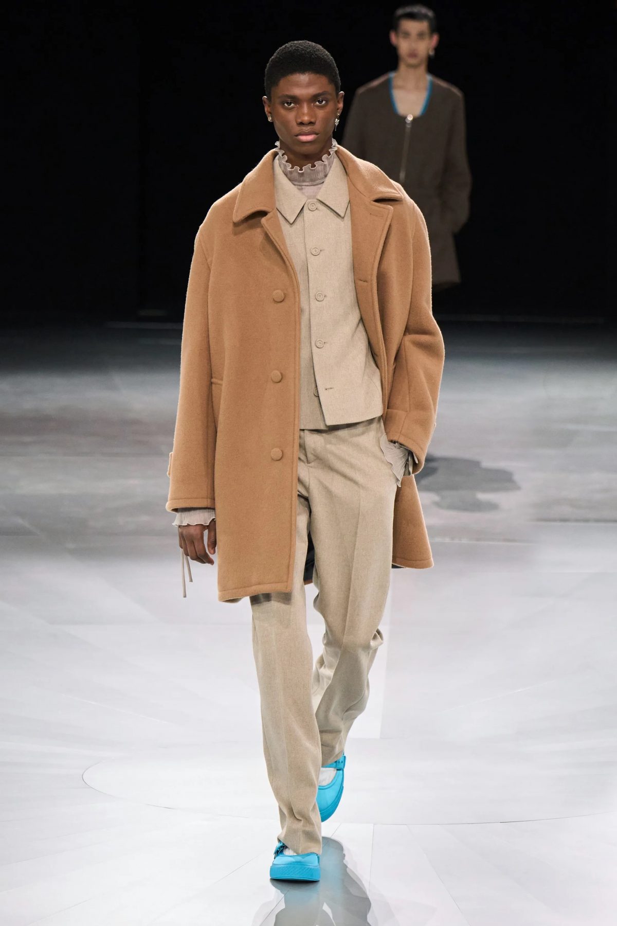 偏灰的米色、杏色和紅棕色不只出現在西裝外套和上衣,更能在各針織單品感受到其柔和美態。雖然穿搭多為大地色,卻在細節處加入對比色,例如天藍色和螢光粉紅色襪子,還有黃色、鮮綠色和粉紫色小單品和內搭,與灰調服裝形成對比,讓人眼前一亮,在一眾柔和中加入活潑亮麗的色彩。