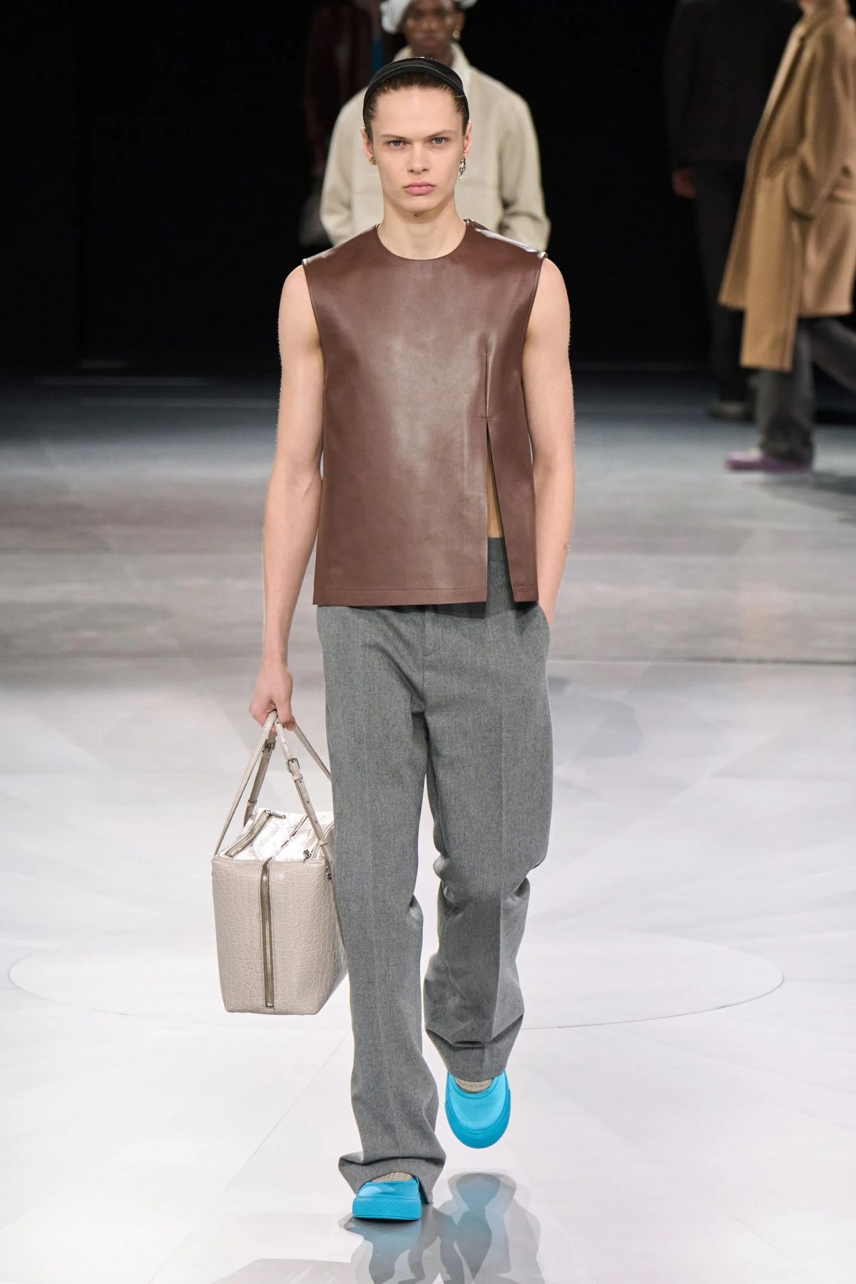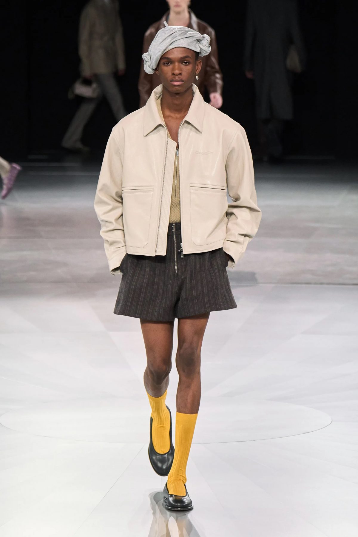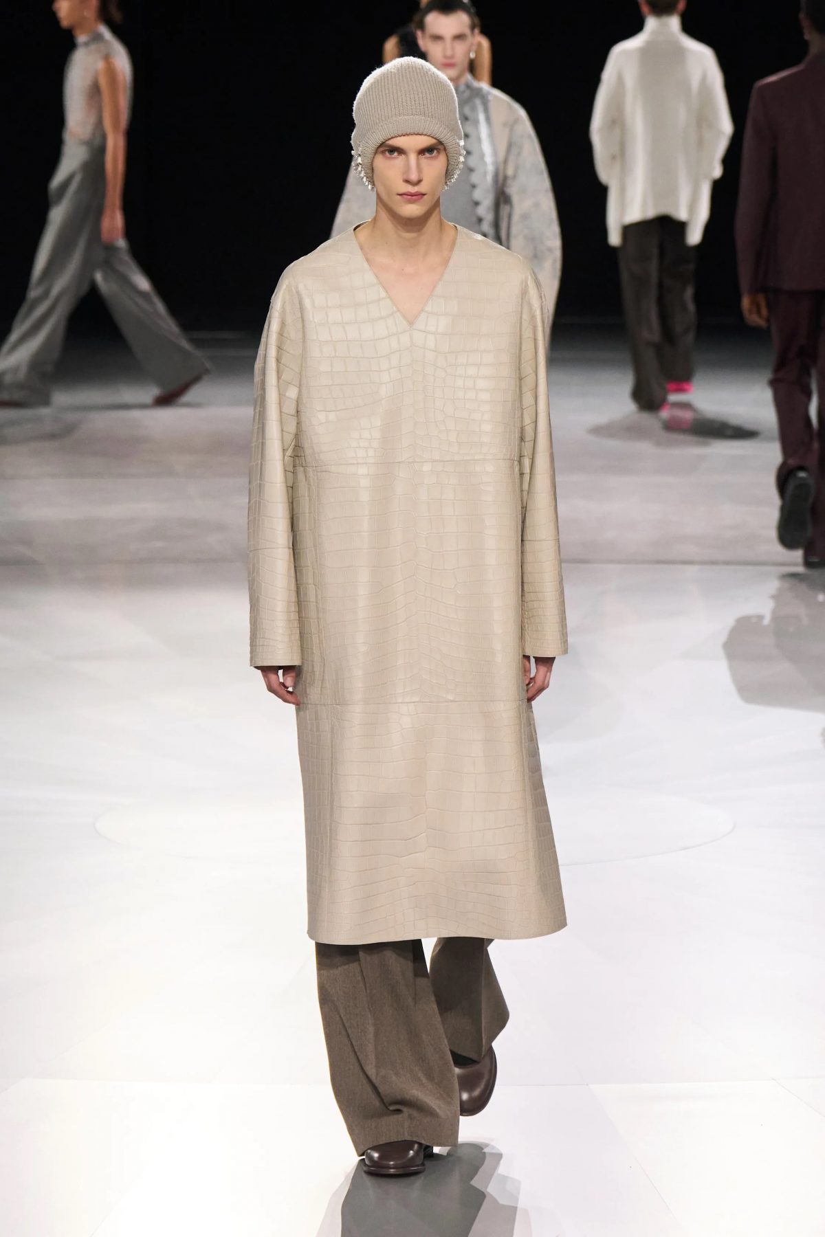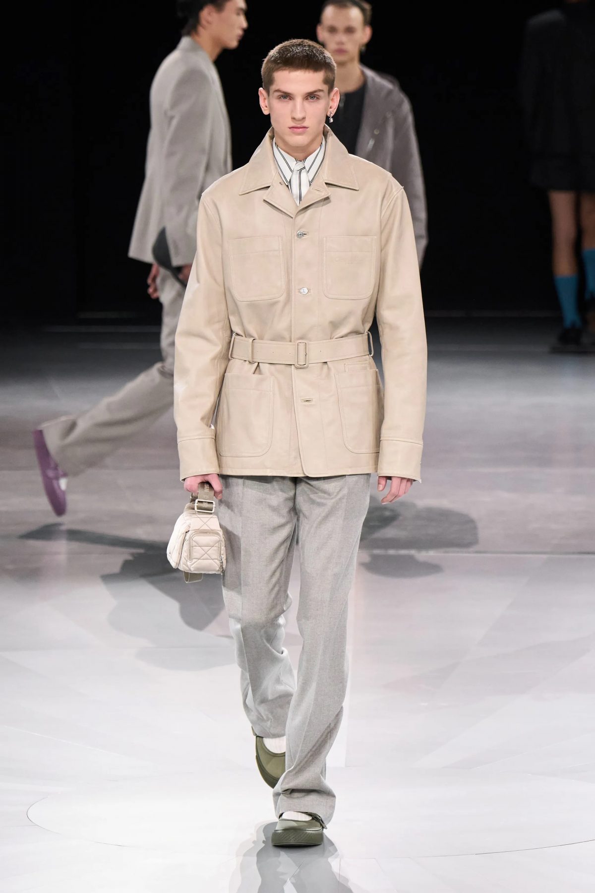 皮褸常給人型格幹練的形象,而Kim Jones筆下的皮質單品則散發著柔和溫婉的氣息。省去鈕釘、金屬圈等冷酷元素,也沒有多餘的裝飾車線,只剩合身剪裁的輪廓形成順暢的線條,簡約淡然。