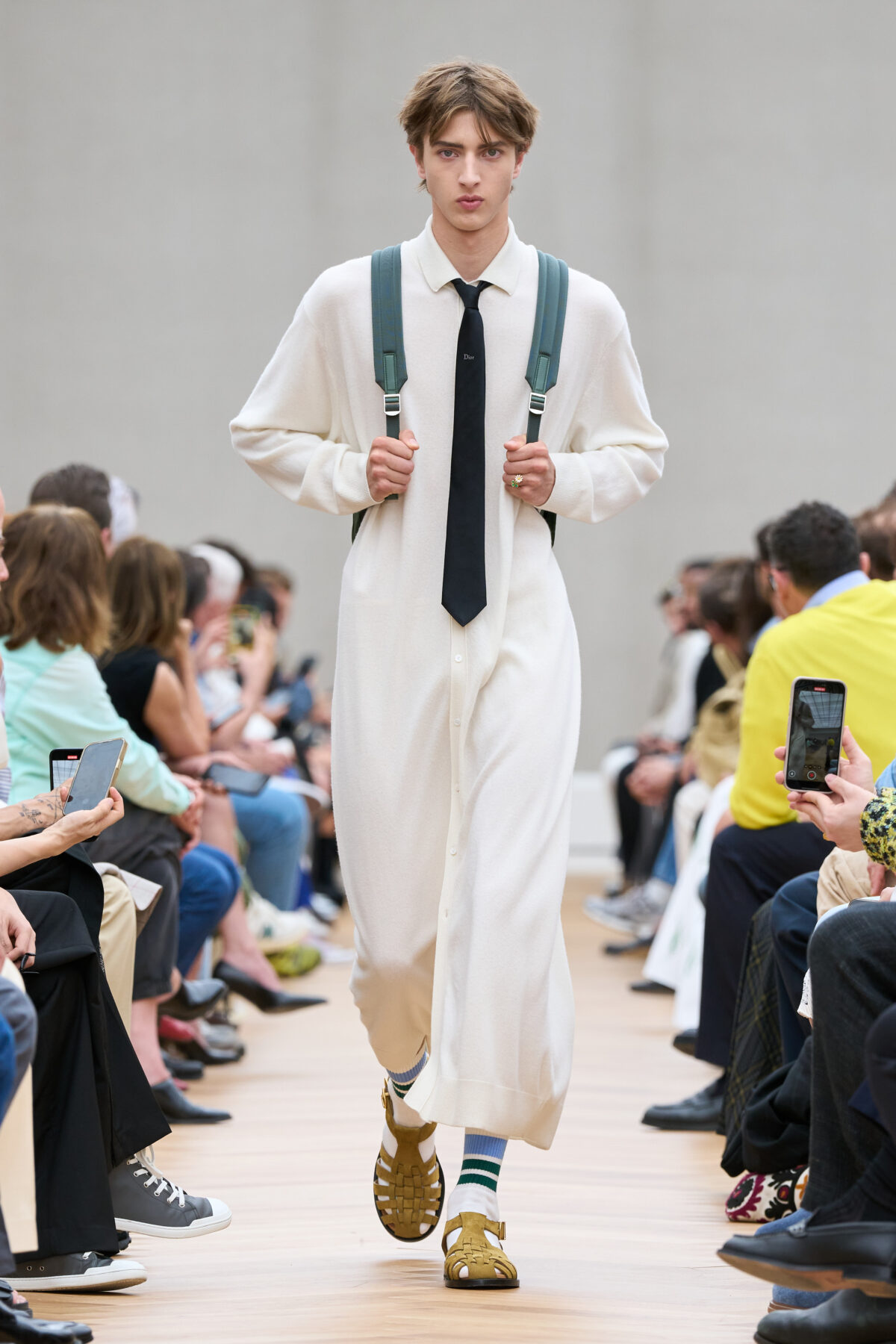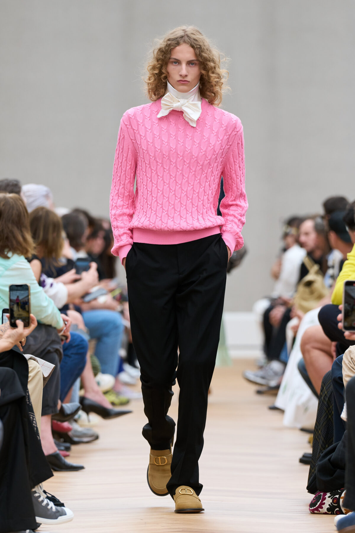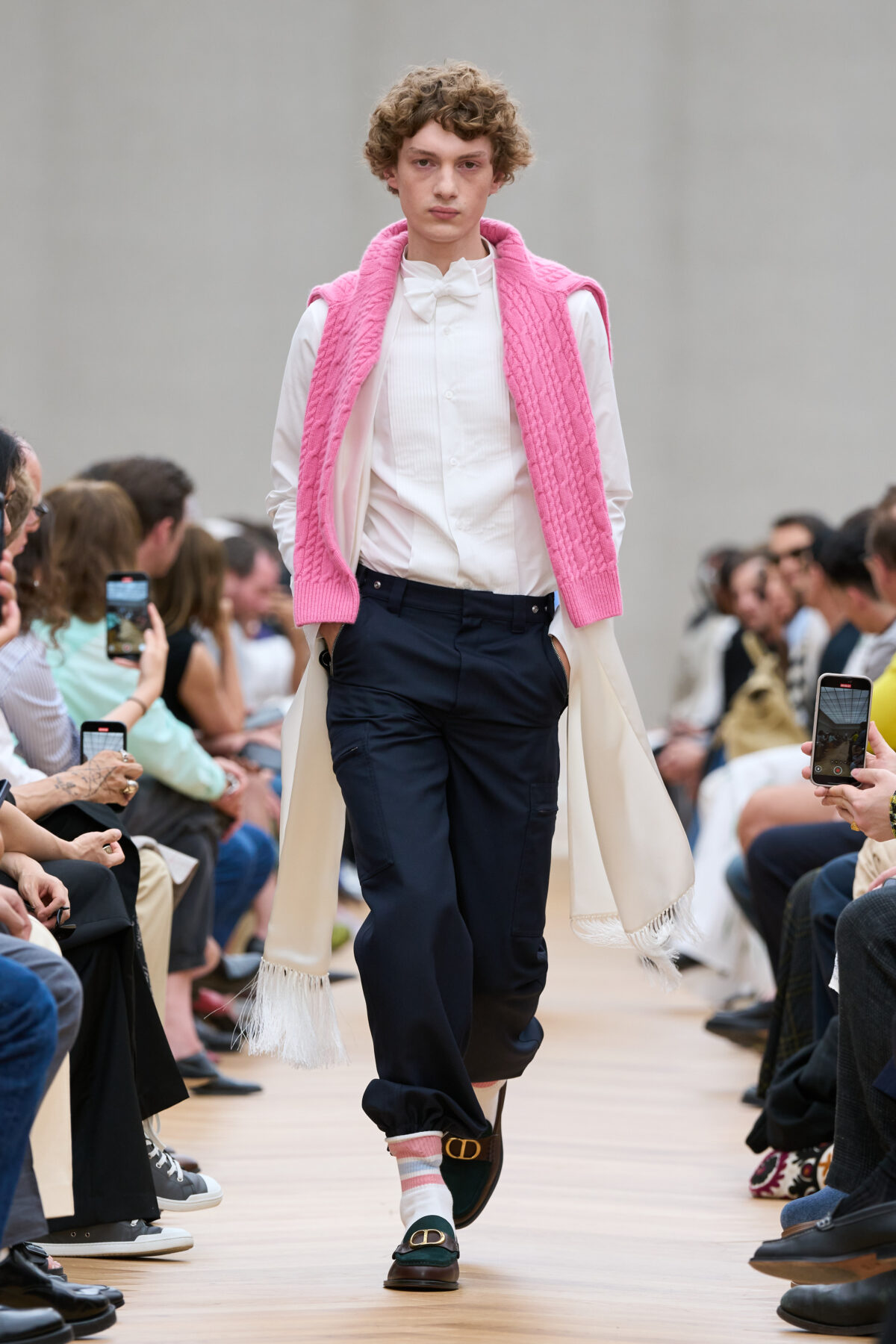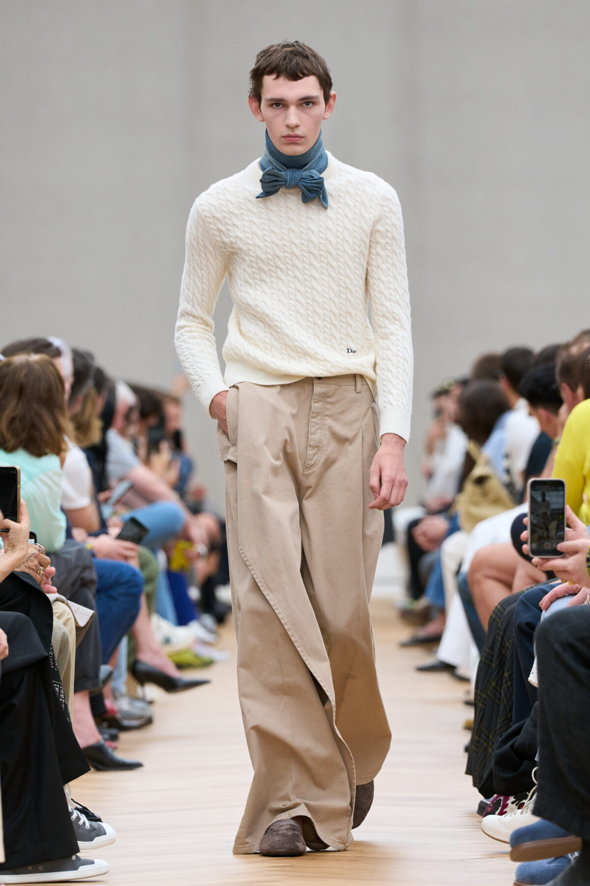 然而,Jonathan也希望將這一切落實於現實中:他考慮過男孩們在箱子裏發現這些作品,隨意穿上它們的情景。這種想法與時裝騷的節奏相得益彰,當中包括了大量法式學院風格的單品,如色彩斑斕的針織毛衣和普通的夏季牛仔褲。