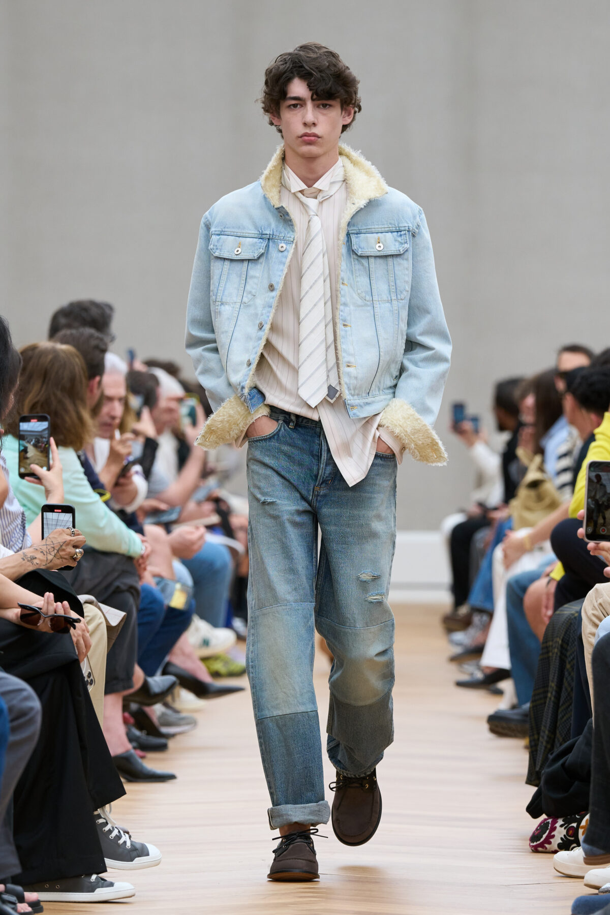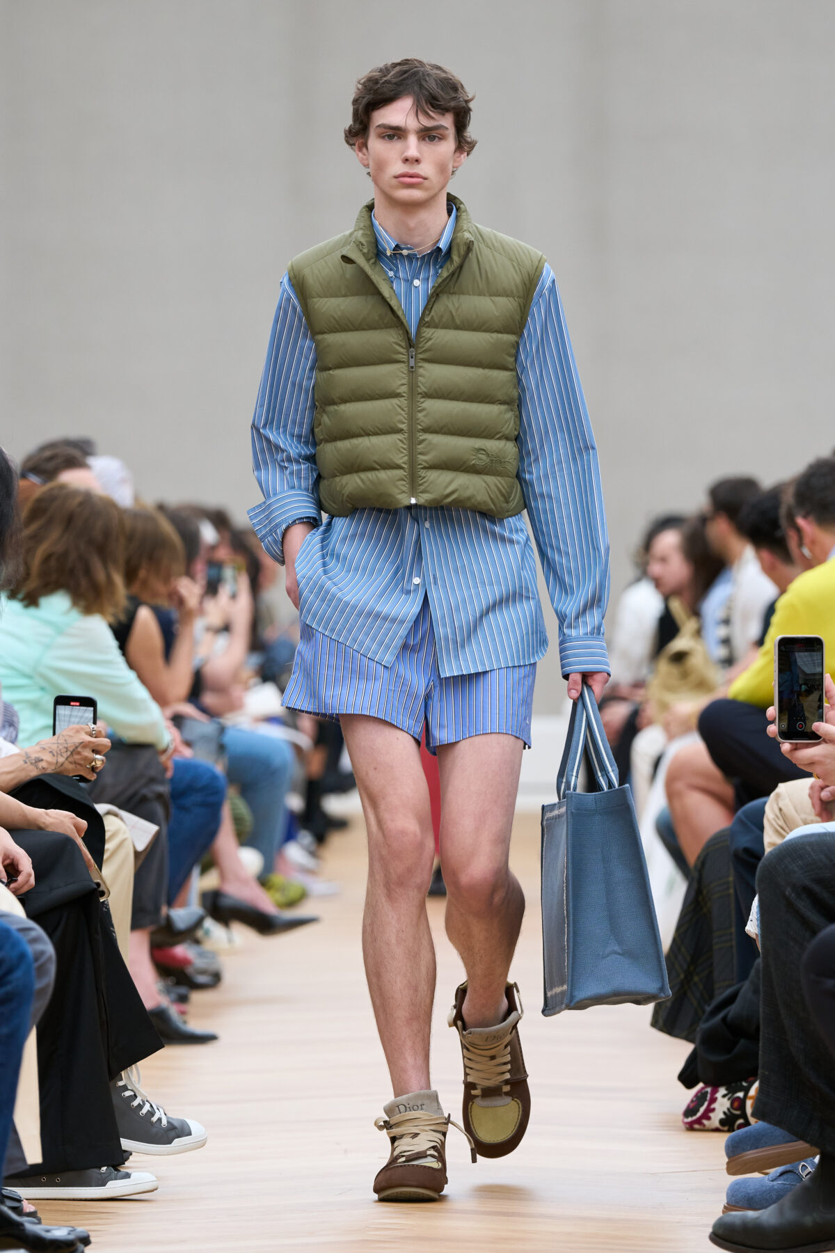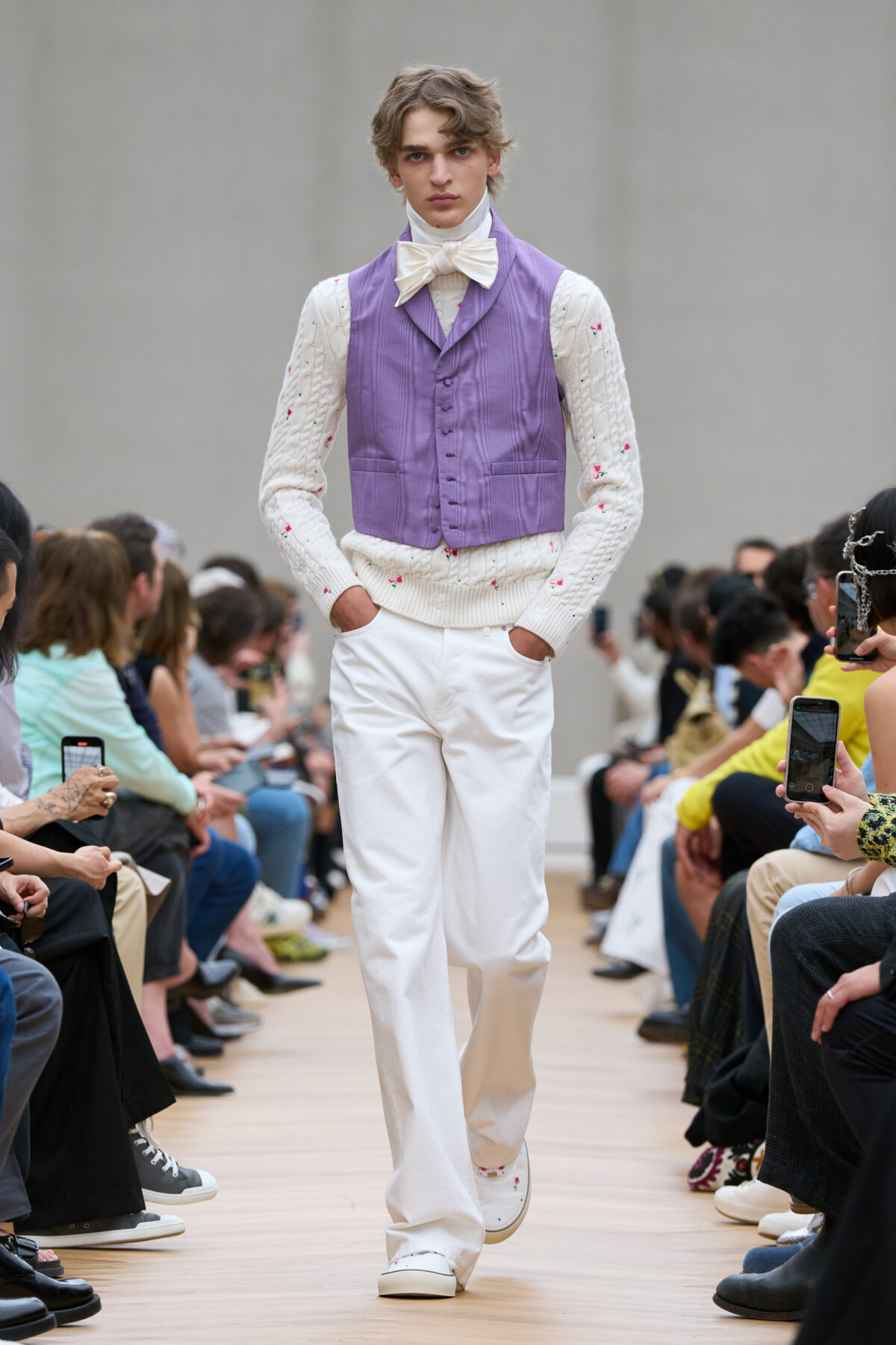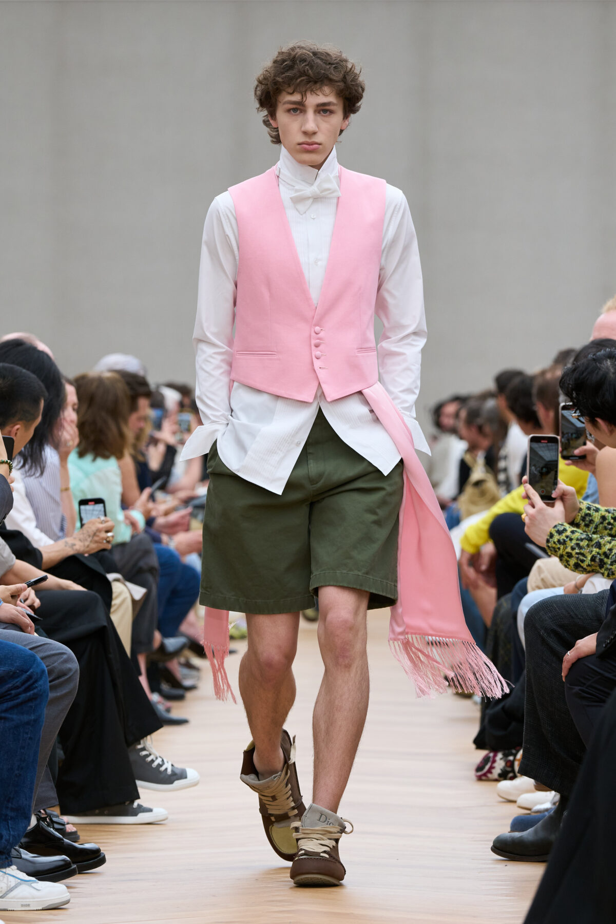 然而,Jonathan也希望將這一切落實於現實中:他考慮過男孩們在箱子裏發現這些作品,隨意穿上它們的情景。這種想法與時裝騷的節奏相得益彰,當中包括了大量法式學院風格的單品,如色彩斑斕的針織毛衣和普通的夏季牛仔褲。