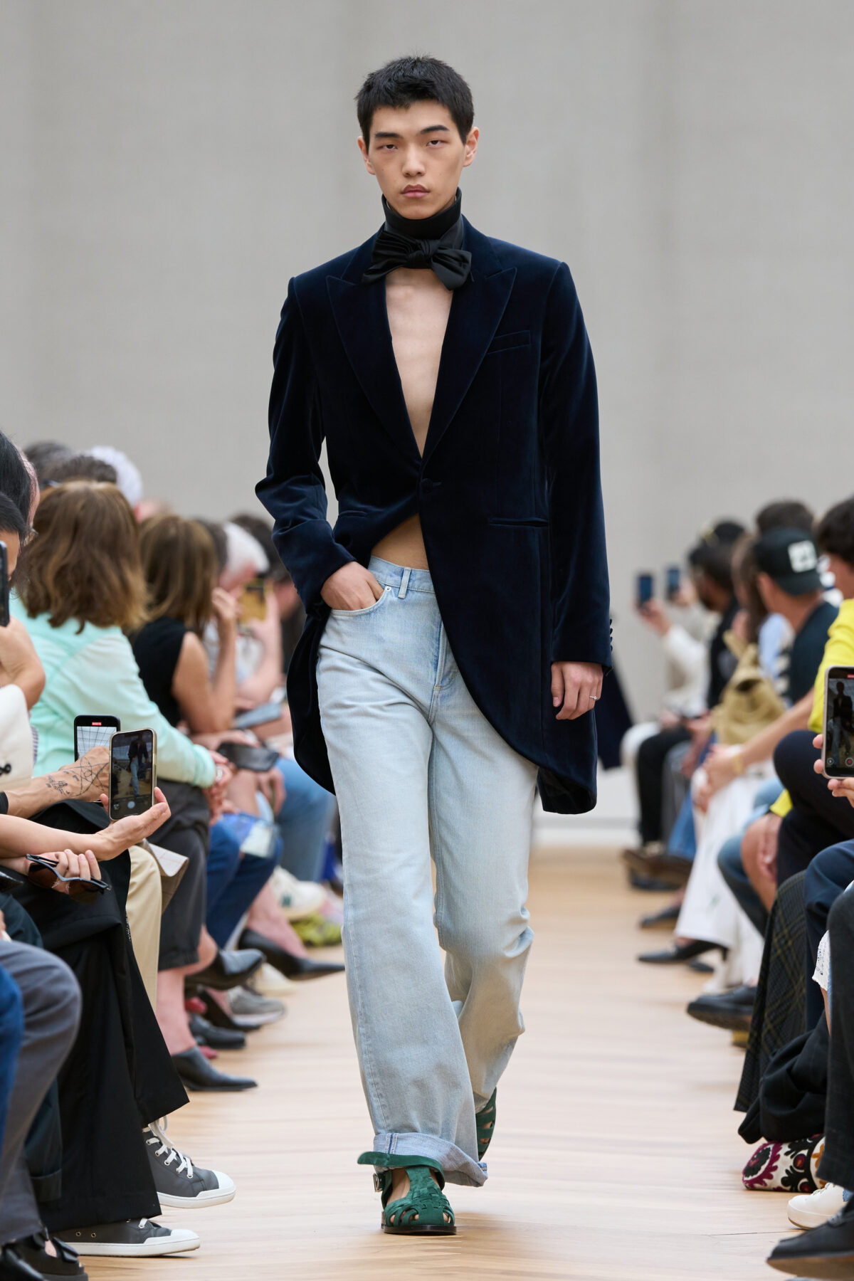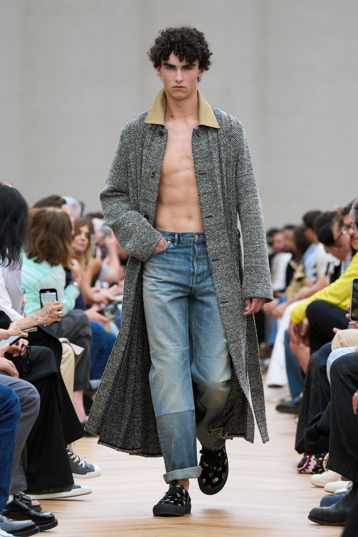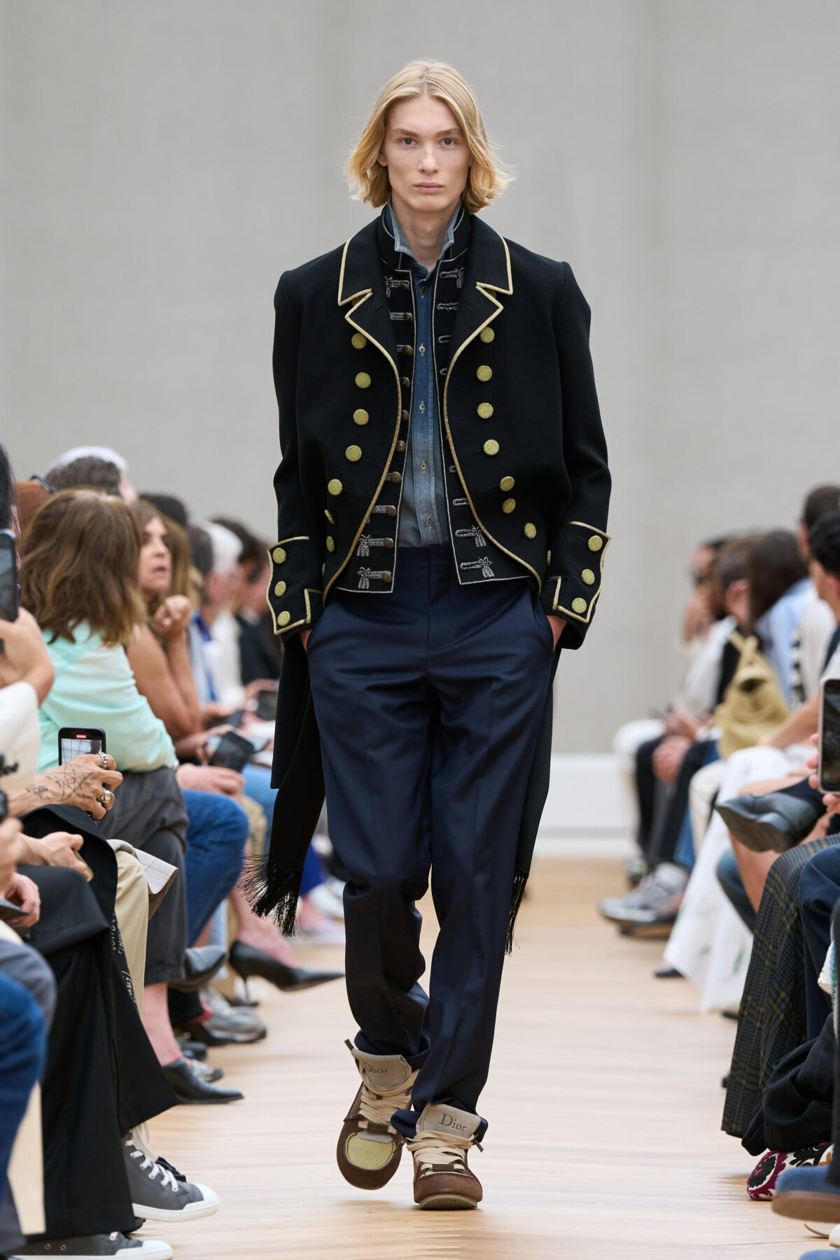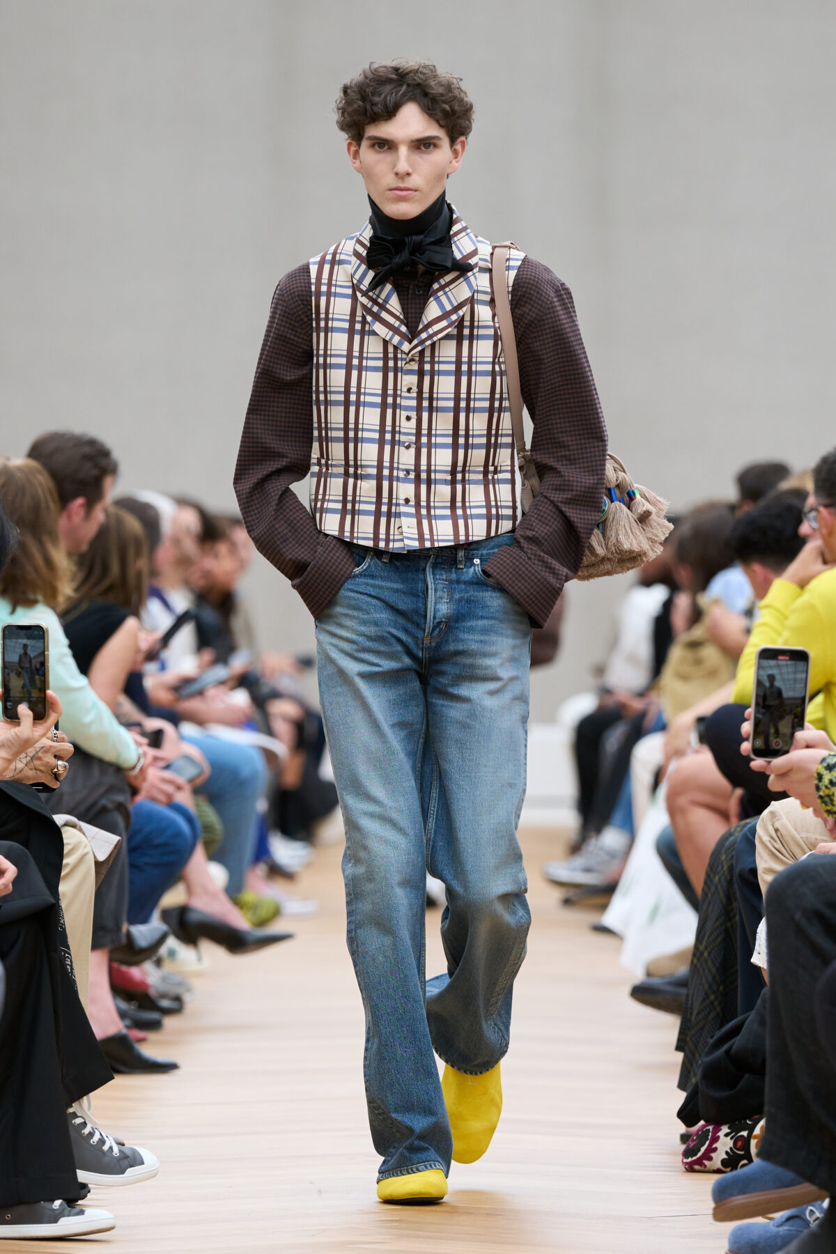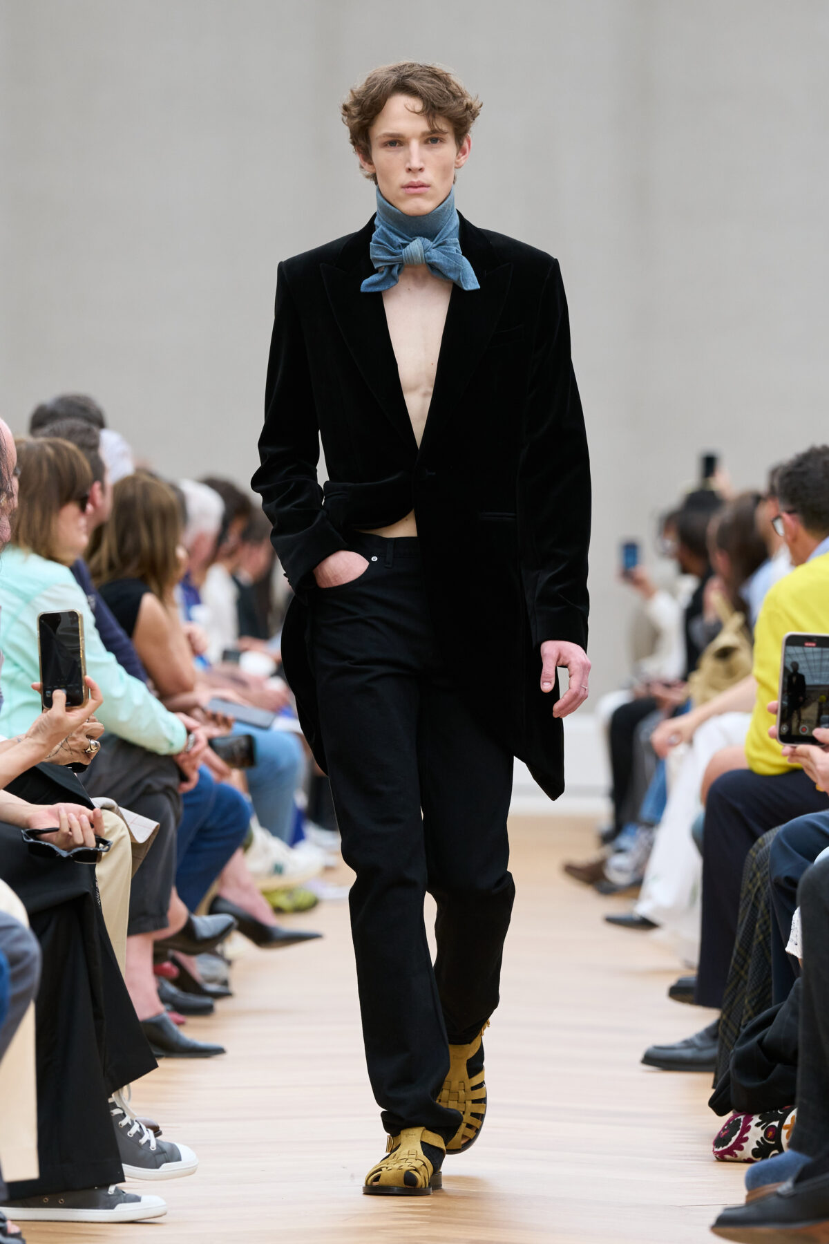 然而,Jonathan也希望將這一切落實於現實中:他考慮過男孩們在箱子裏發現這些作品,隨意穿上它們的情景。這種想法與時裝騷的節奏相得益彰,當中包括了大量法式學院風格的單品,如色彩斑斕的針織毛衣和普通的夏季牛仔褲。