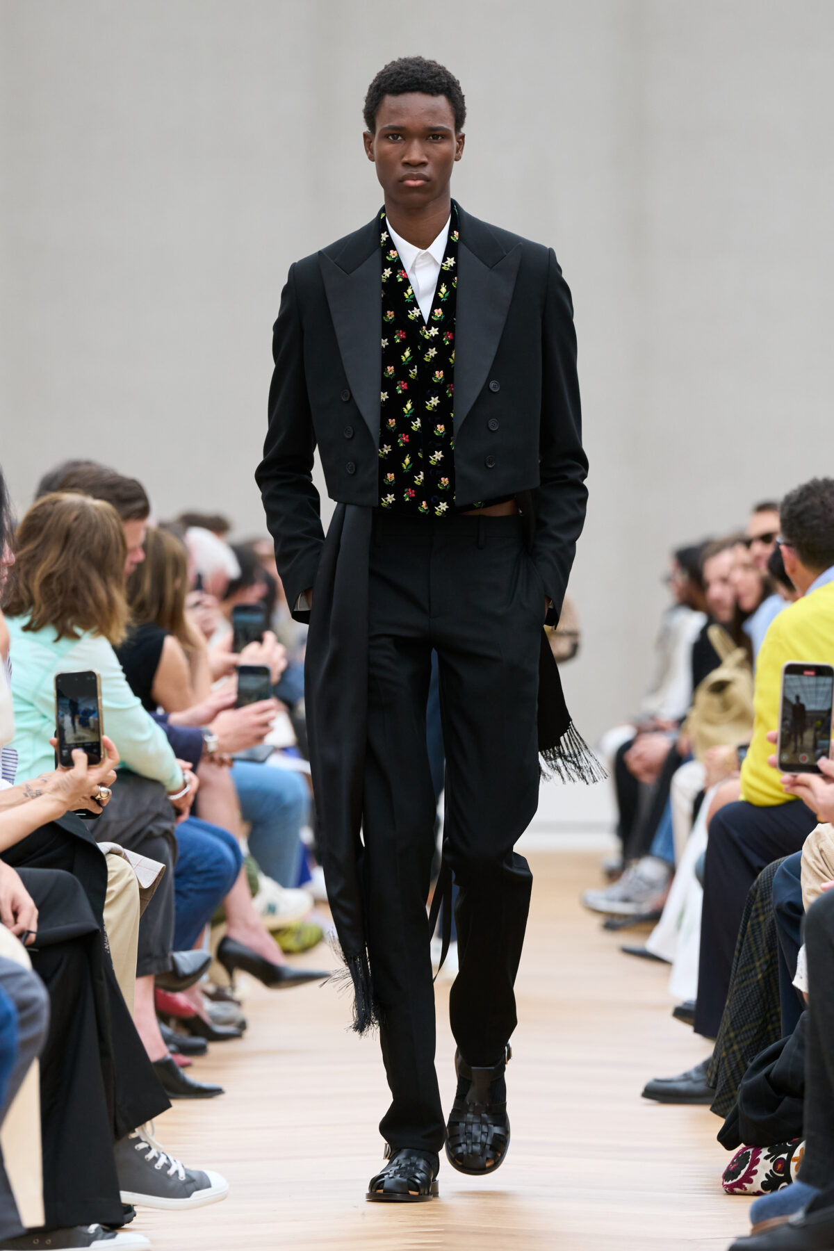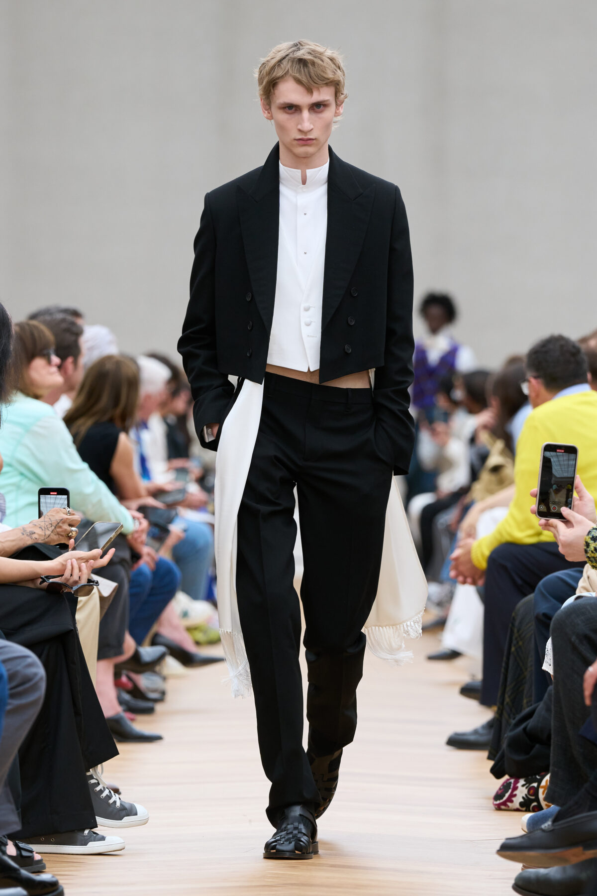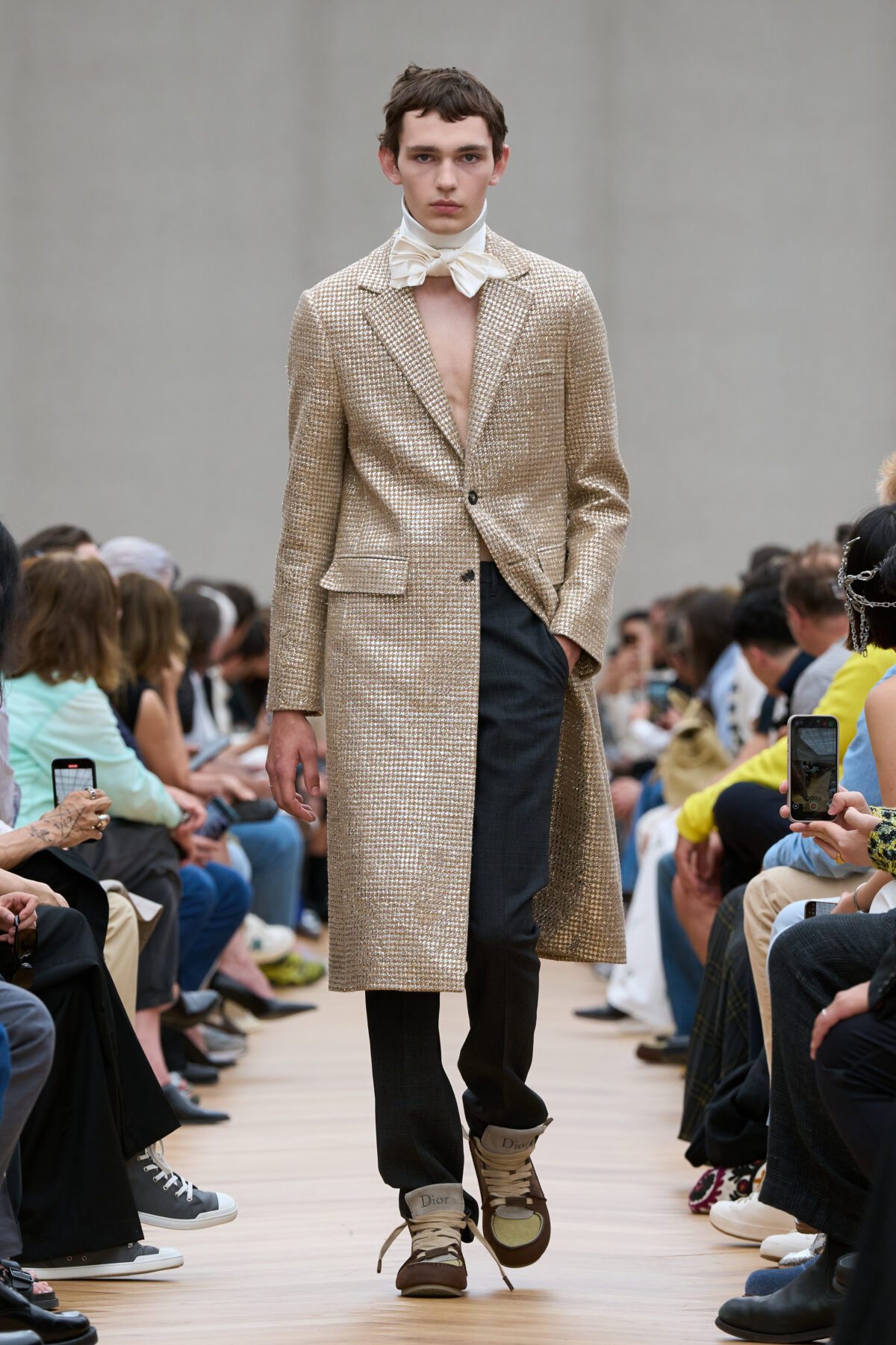 將重要藝術與時尚相結合,可以說是Jonathan的一種公式。這些借鑑雖然在內容上低調,但自然也是LVMH的一種權力聲明,因為其資源和影響力能夠克服從盧浮宮(草莓)和蘇格蘭國立博物館(花卉)借用作品舉行一小時時裝騷的困難。在這個系列中,Jonathan直接借鑒了18世紀和19世紀的法國男裝。「這些作品非常稀有,但我們找到了一組原版的馬甲,」他解釋道,「對我和我這一代人來說,Margiela是神。所以我想:『讓我們做它們的複製品。』」這是他展示Dior高級訂製服工作室高貴遺產的途徑——花卉刺繡、金色格子鈕扣,以及一件淡紫色莫爾紋絲綢馬甲的精確色彩。展示的緊密性使得觀眾能驚嘆於粉色羅緞馬甲的精緻法國品質,並幾乎能感受到絲綢晚巾輕盈掠過時的細膩感。
